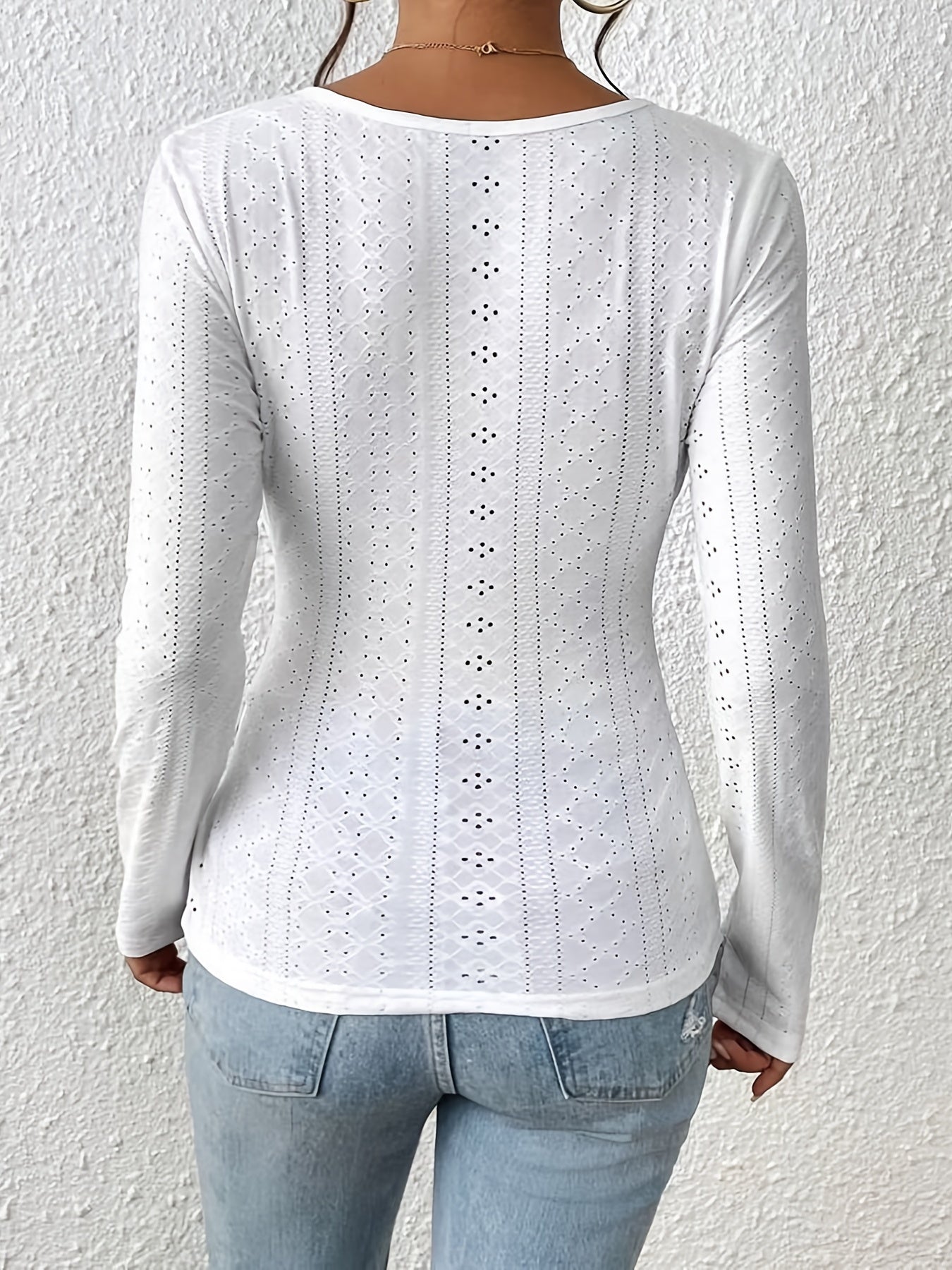 Sixsr Plus Size Casual Top, Women's Plus Solid Eyelet Embroidered Button Decor Long Sleeve Surplice Neck Skinny Top