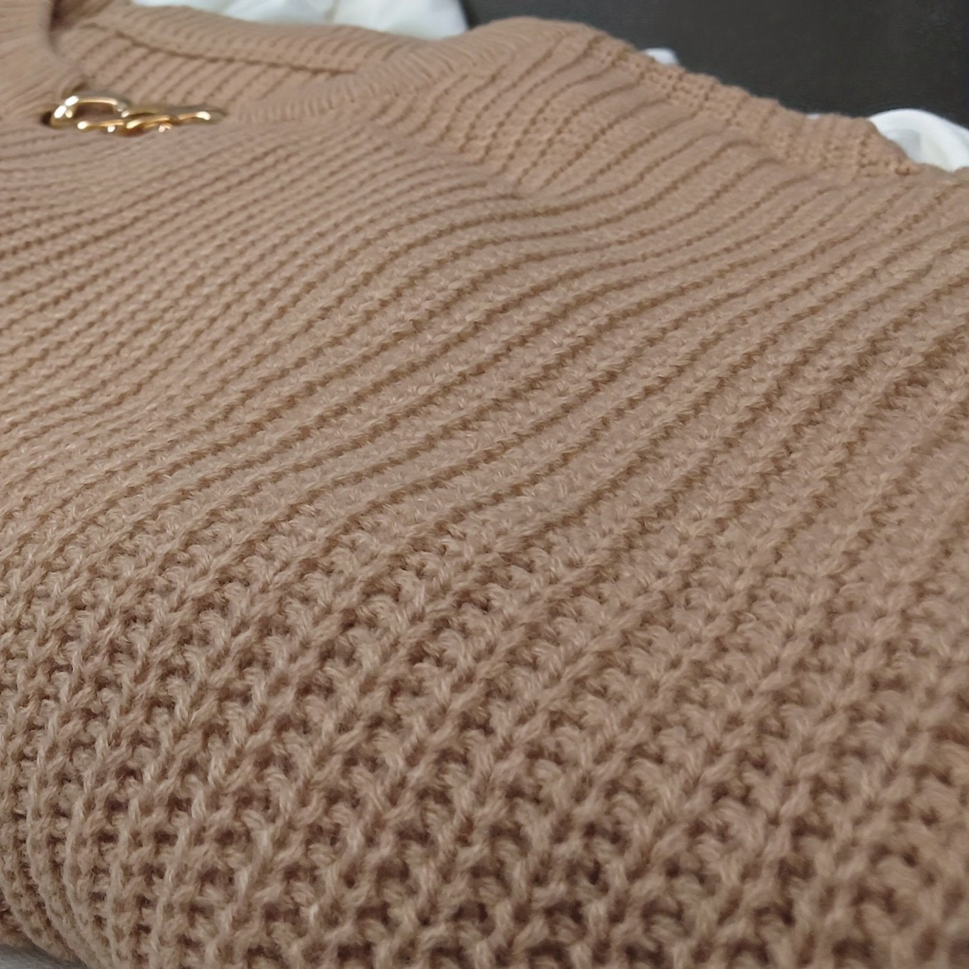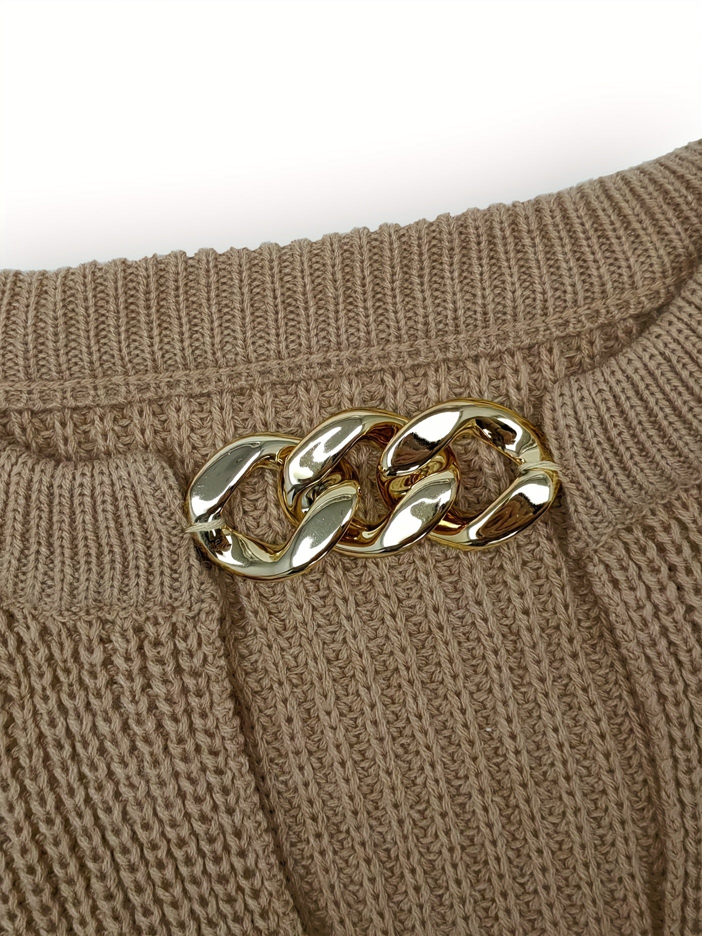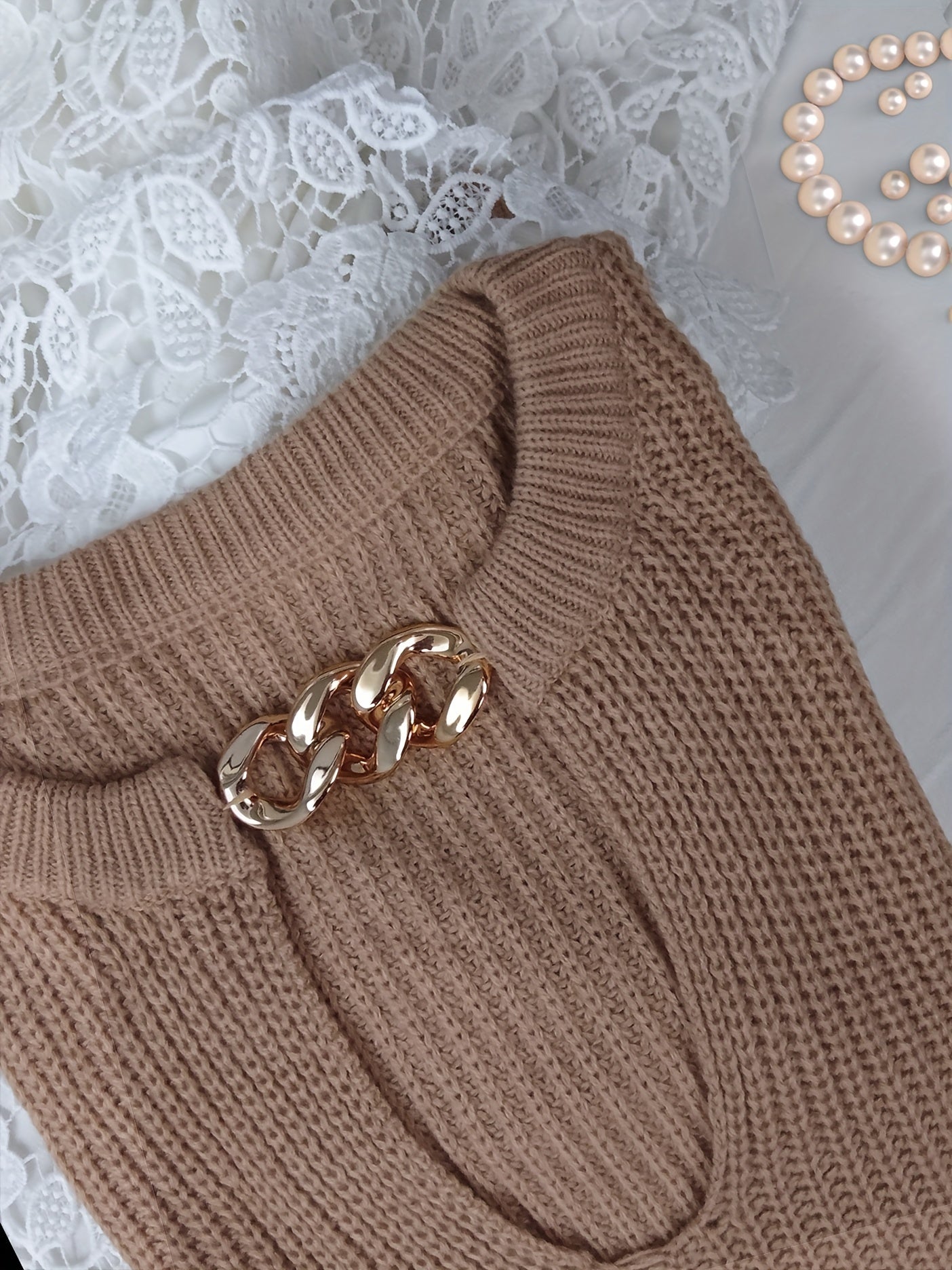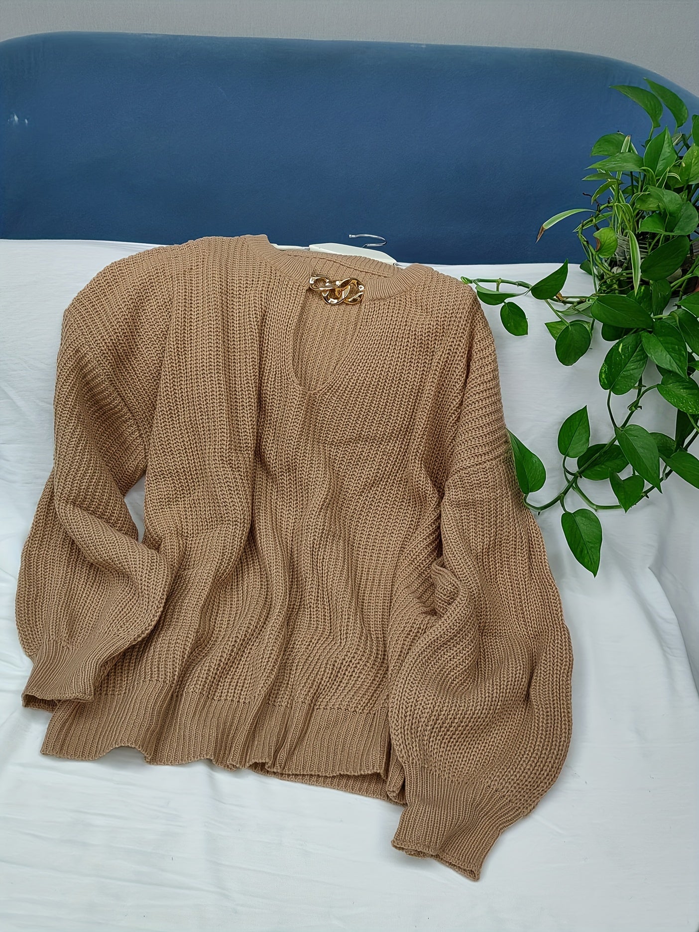 Sixsr Plus Size Chain Decor Cut Out Lantern Sleeve Sweater, Women's Plus Medium Stretch Casual Sweater