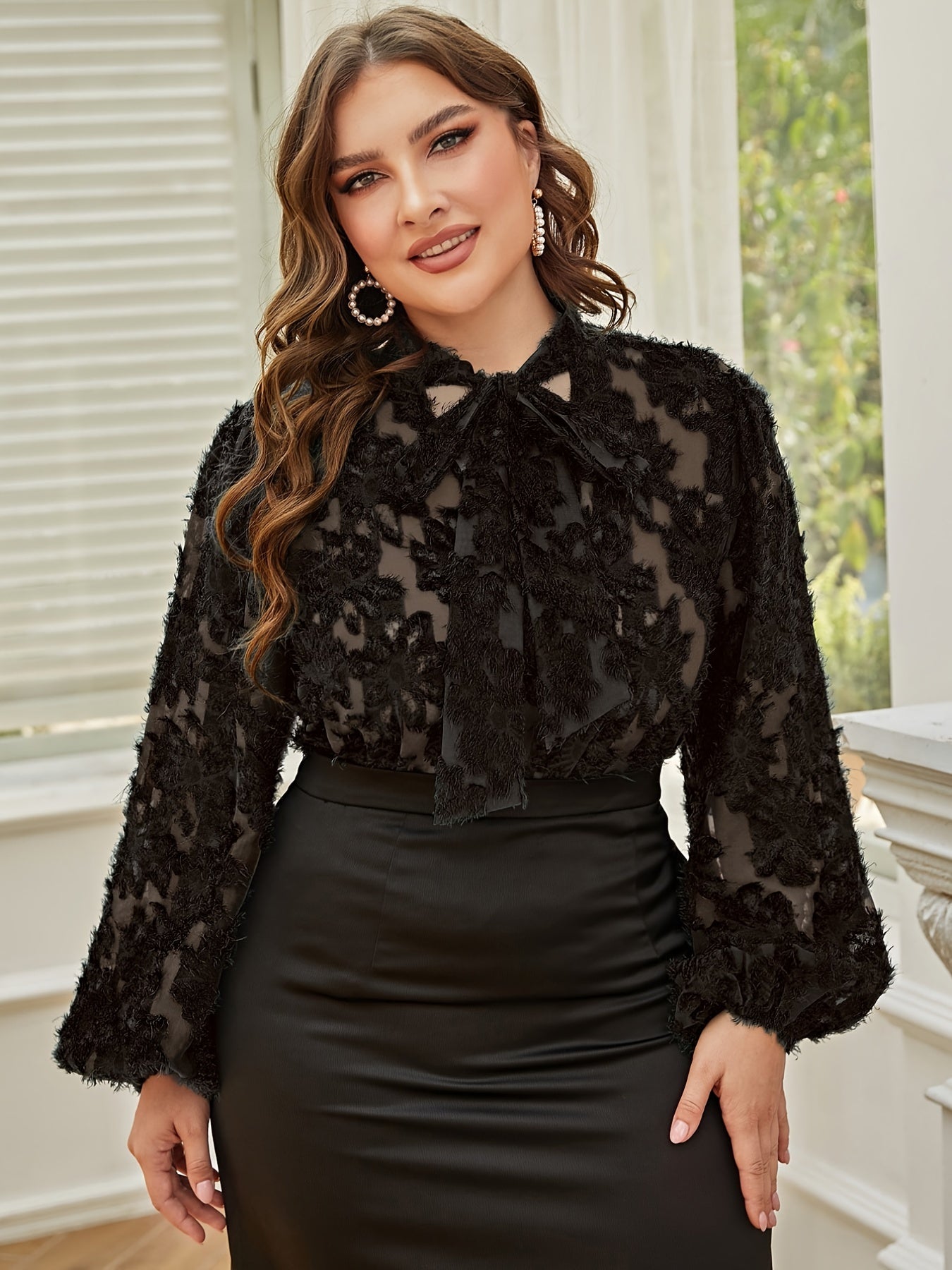 Sixsr Plus Size Elegant Top, Women's Plus Bow Front Fuzzy Long Sleeve Slight Stretch Blouse