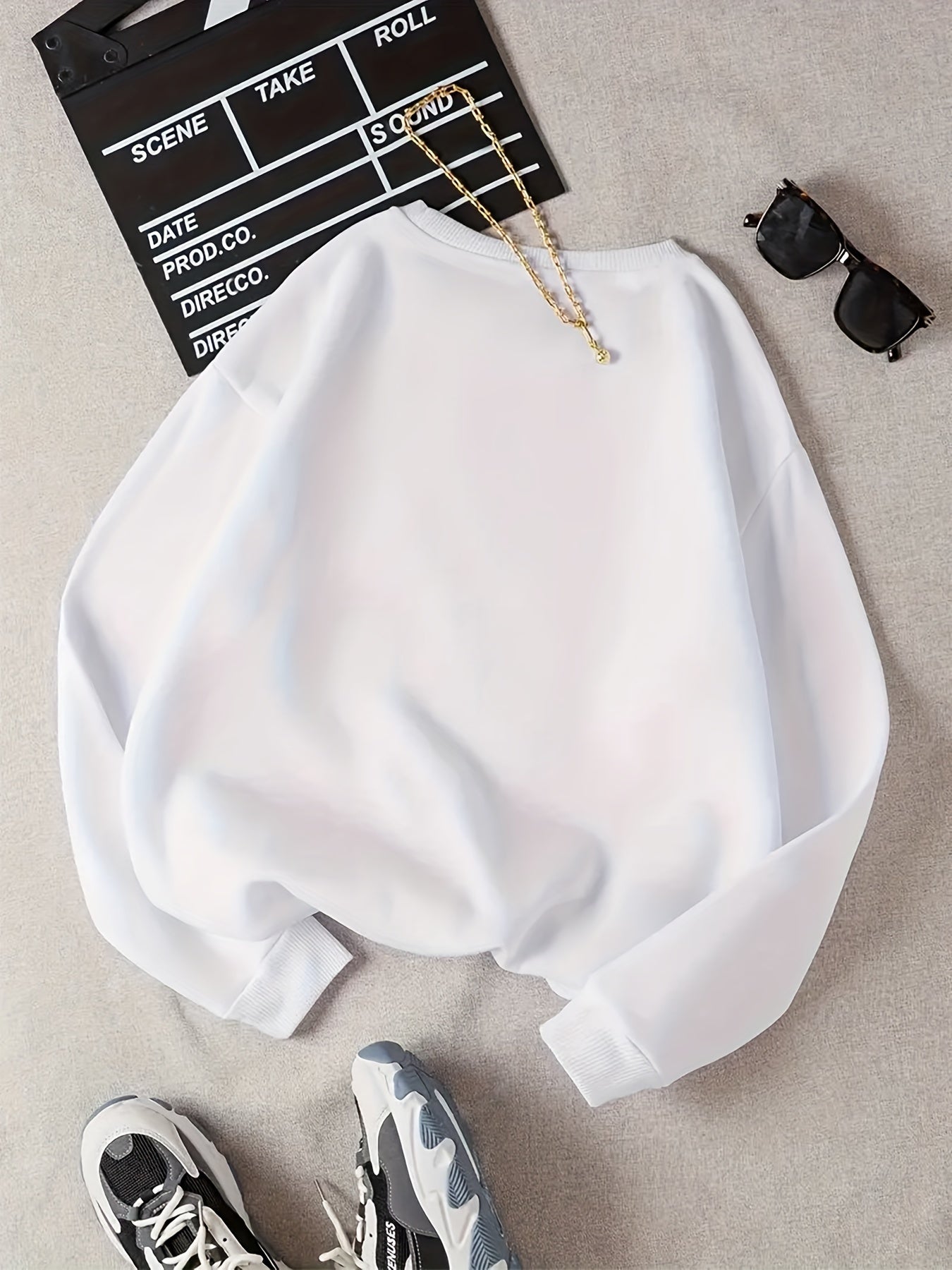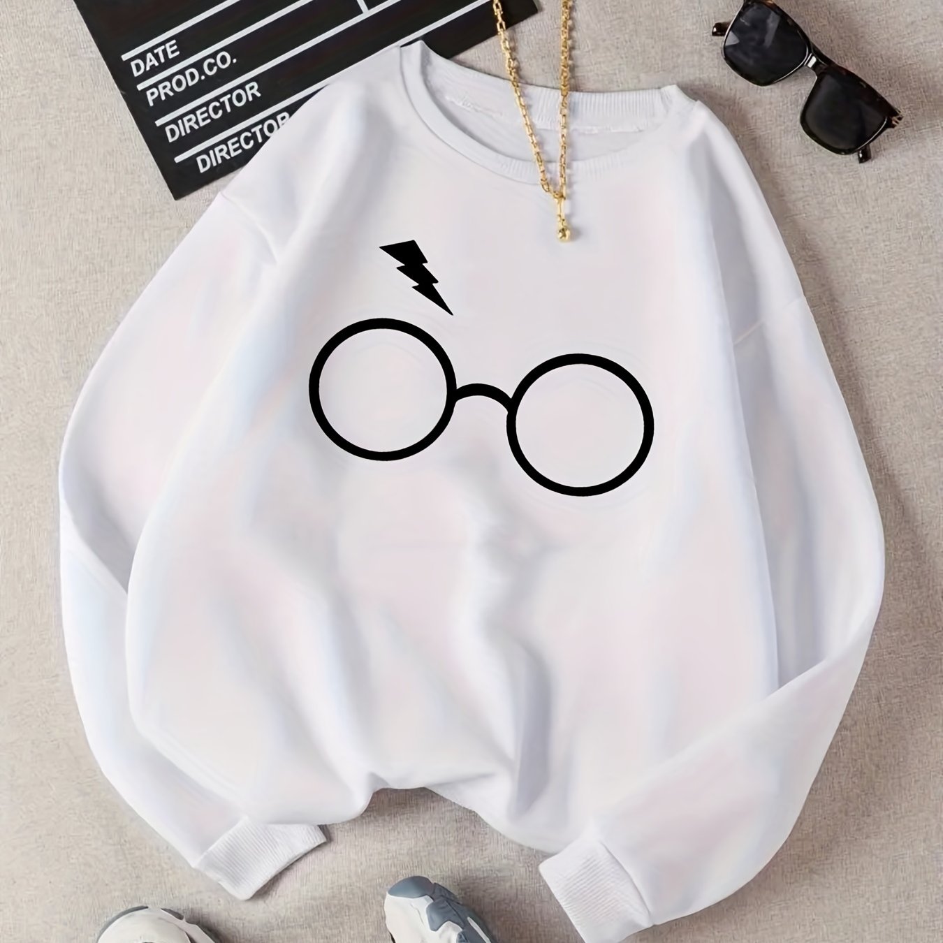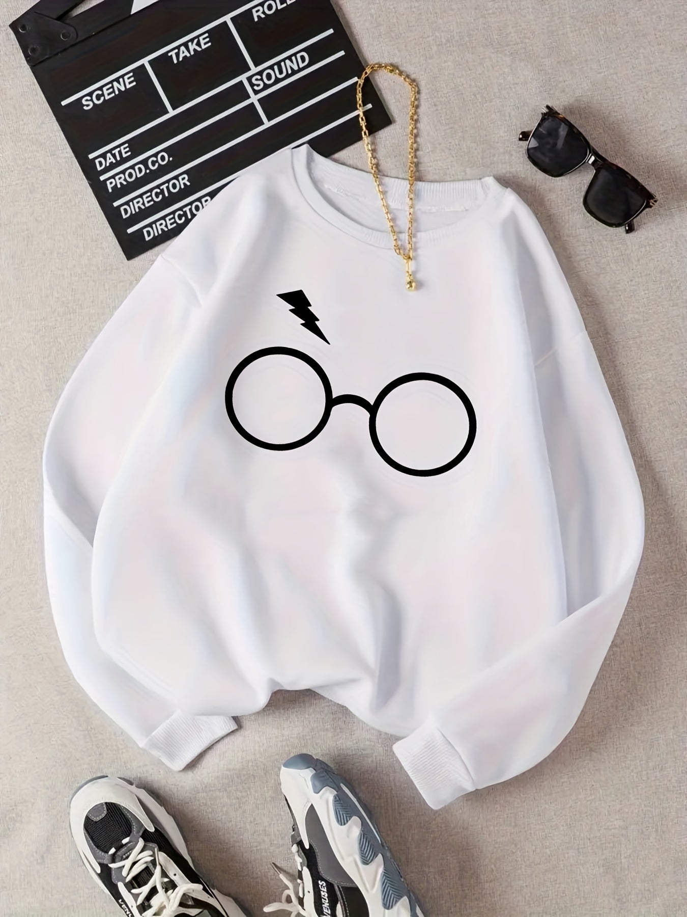 Sixsr Plus Size Preppy Sweatshirt, Women's Plus Glasses Print Long Sleeve Slight Stretch Sweatshirt, Back To Shool