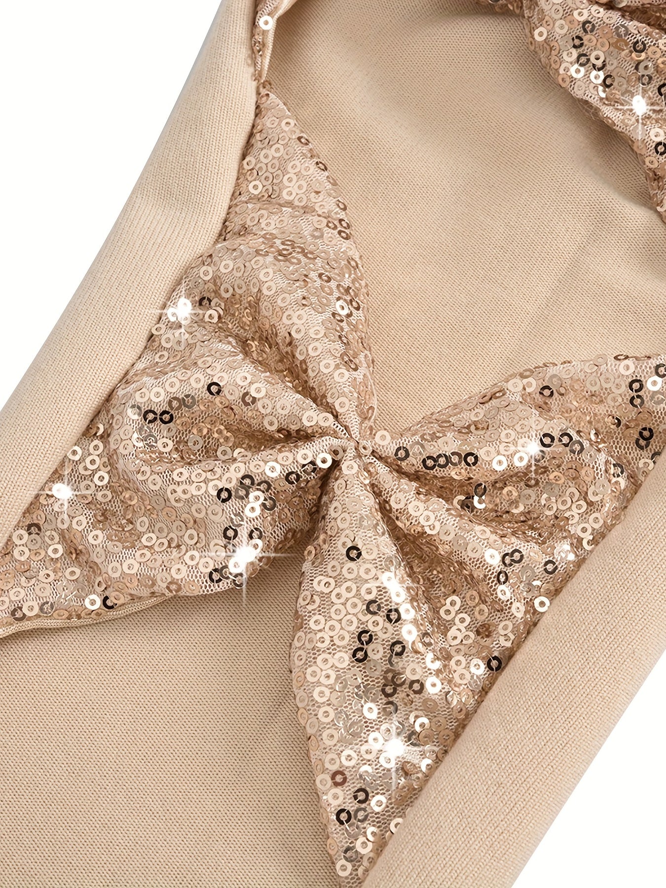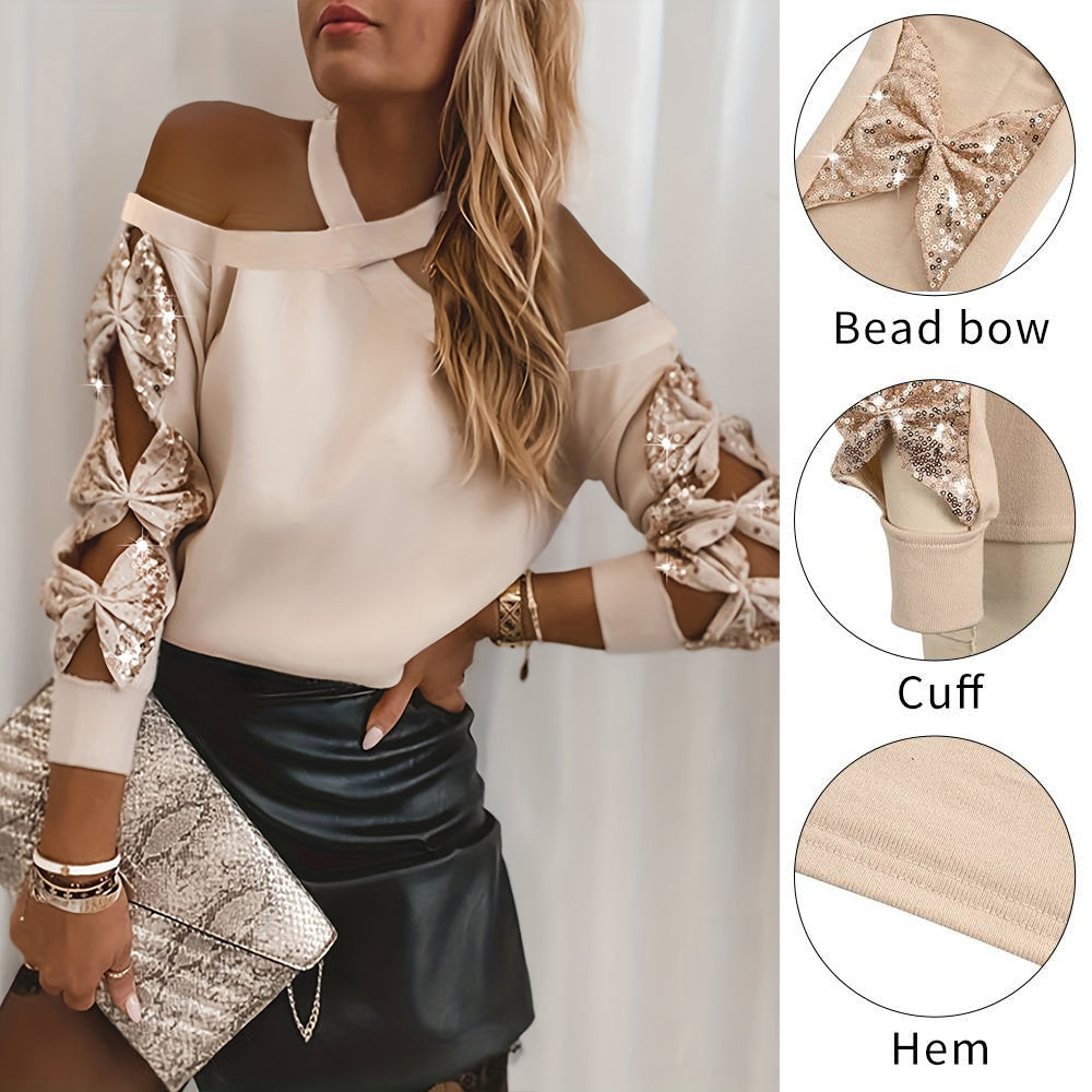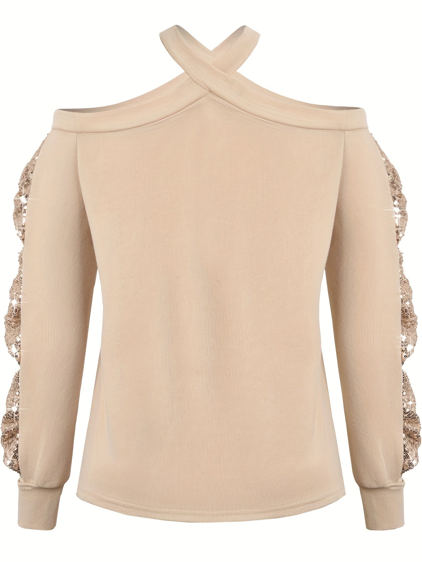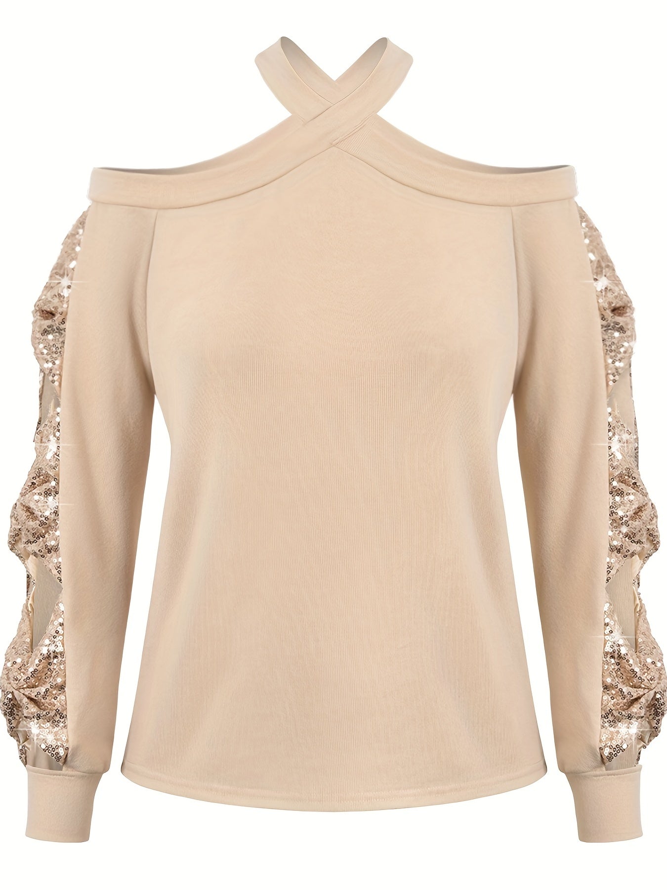 Sixsr Plus Size Sexy Top, Women's Plus Solid Sequin Decor Cold Shoulder Cut Out Long Sleeve Criss Cross Halter Neck Medium Stretch Top
