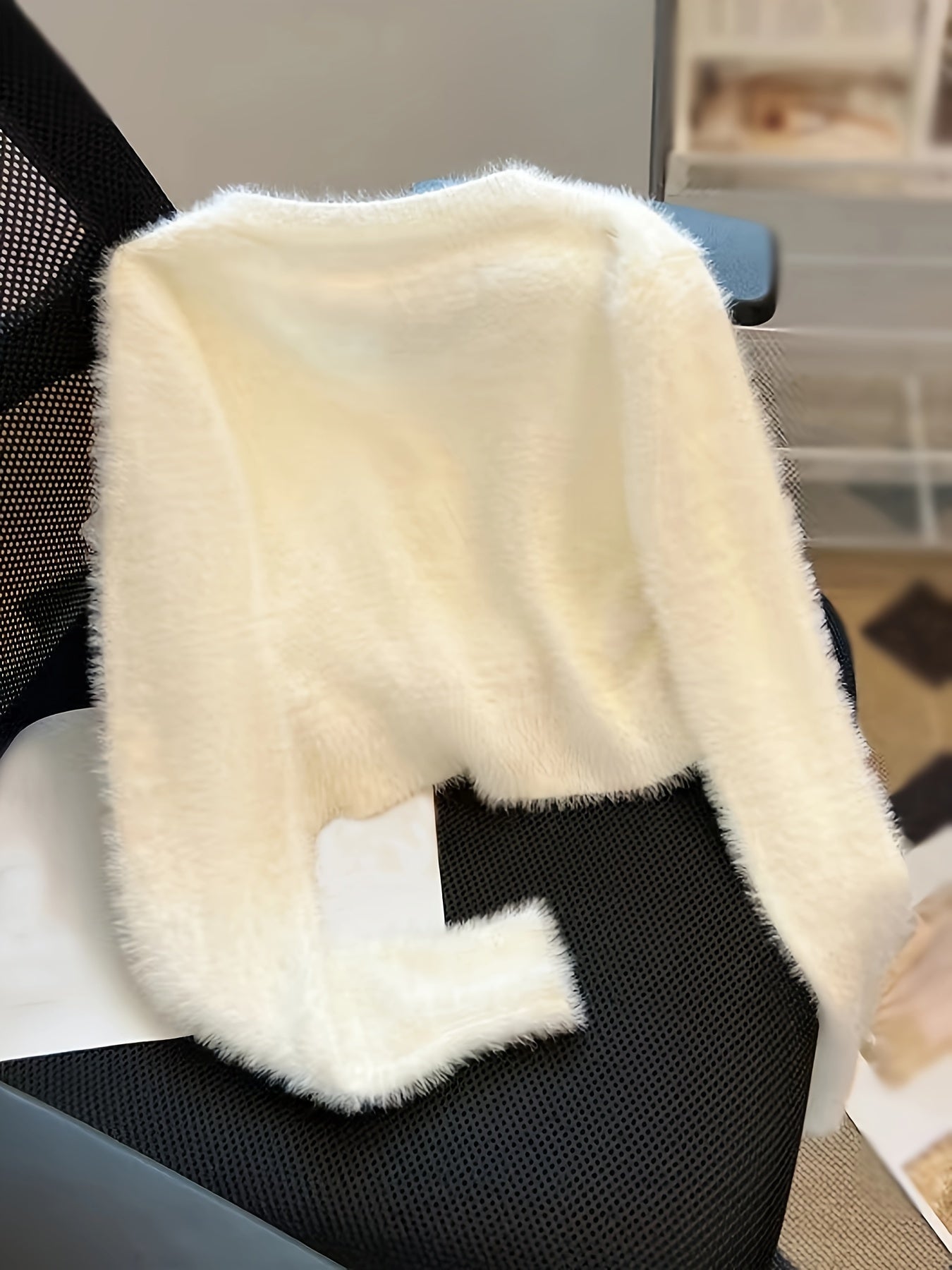 Sixsr Rhinestone Button Down Plush Cardigan, Casual Crew Neck Long Sleeve Crop Sweater, Women's Clothing