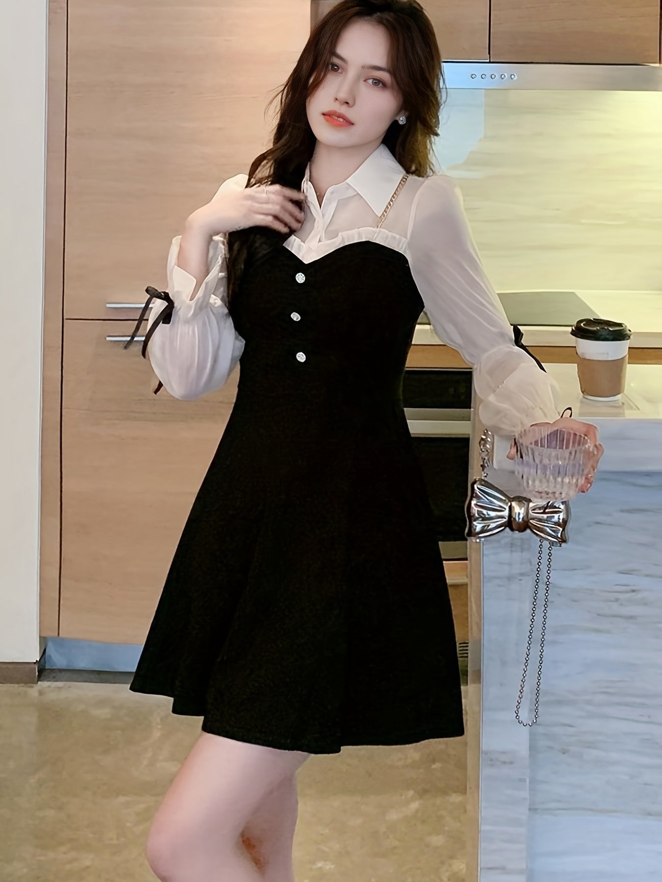 Sixsr Ruffle Trim Splicing Dress, Elegant Turn Down Collar Long Sleeve Sweetheart Neck Dress, Women's Clothing