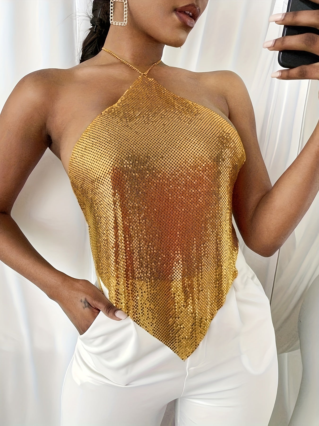 Sixsr Sequin Chain Halter Top, Casual Summer Sleeveless Top, Women's Clothing