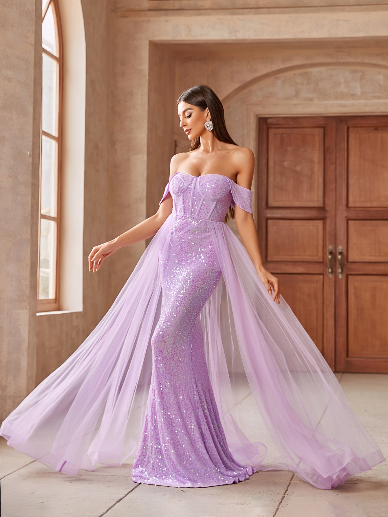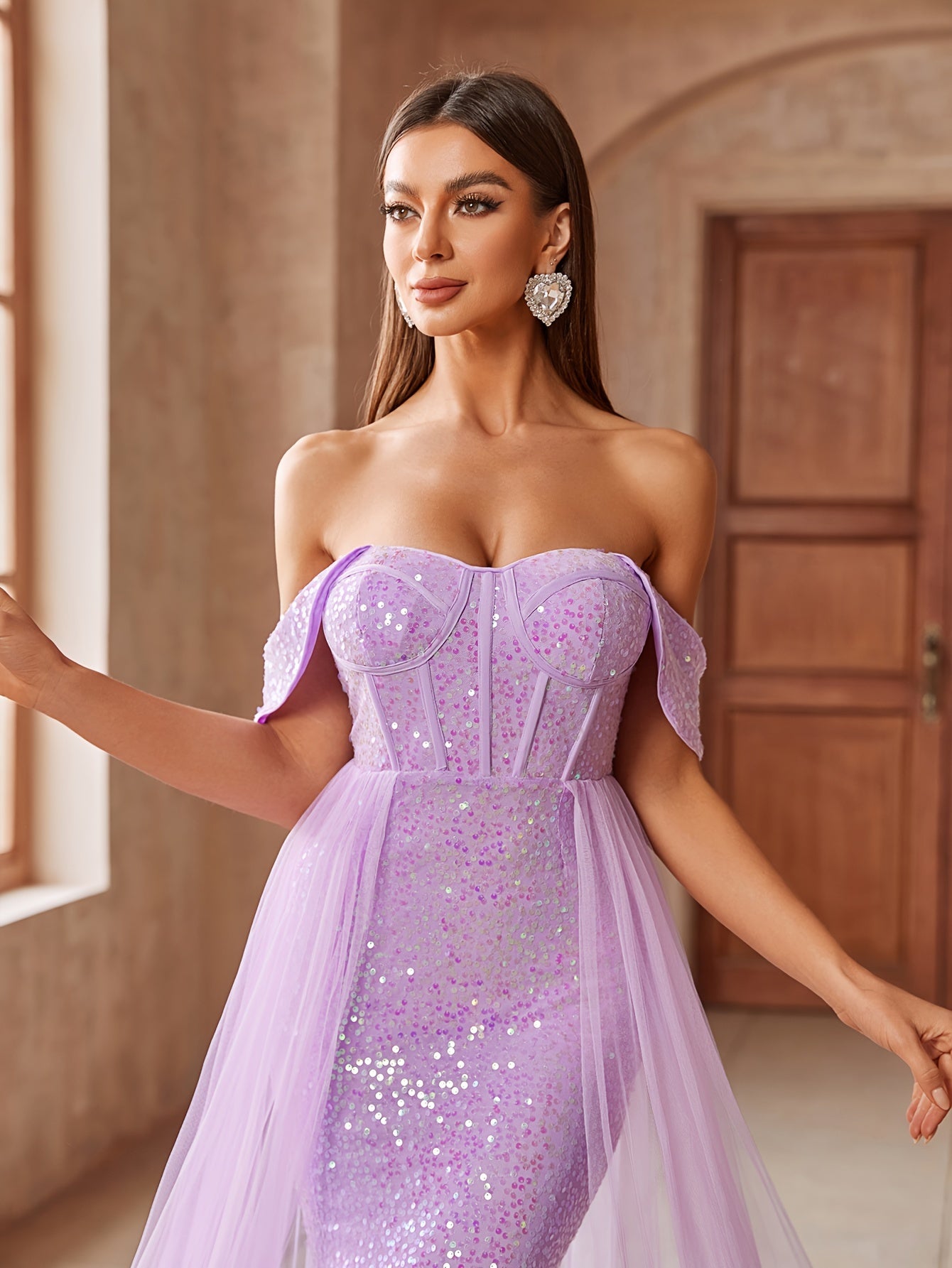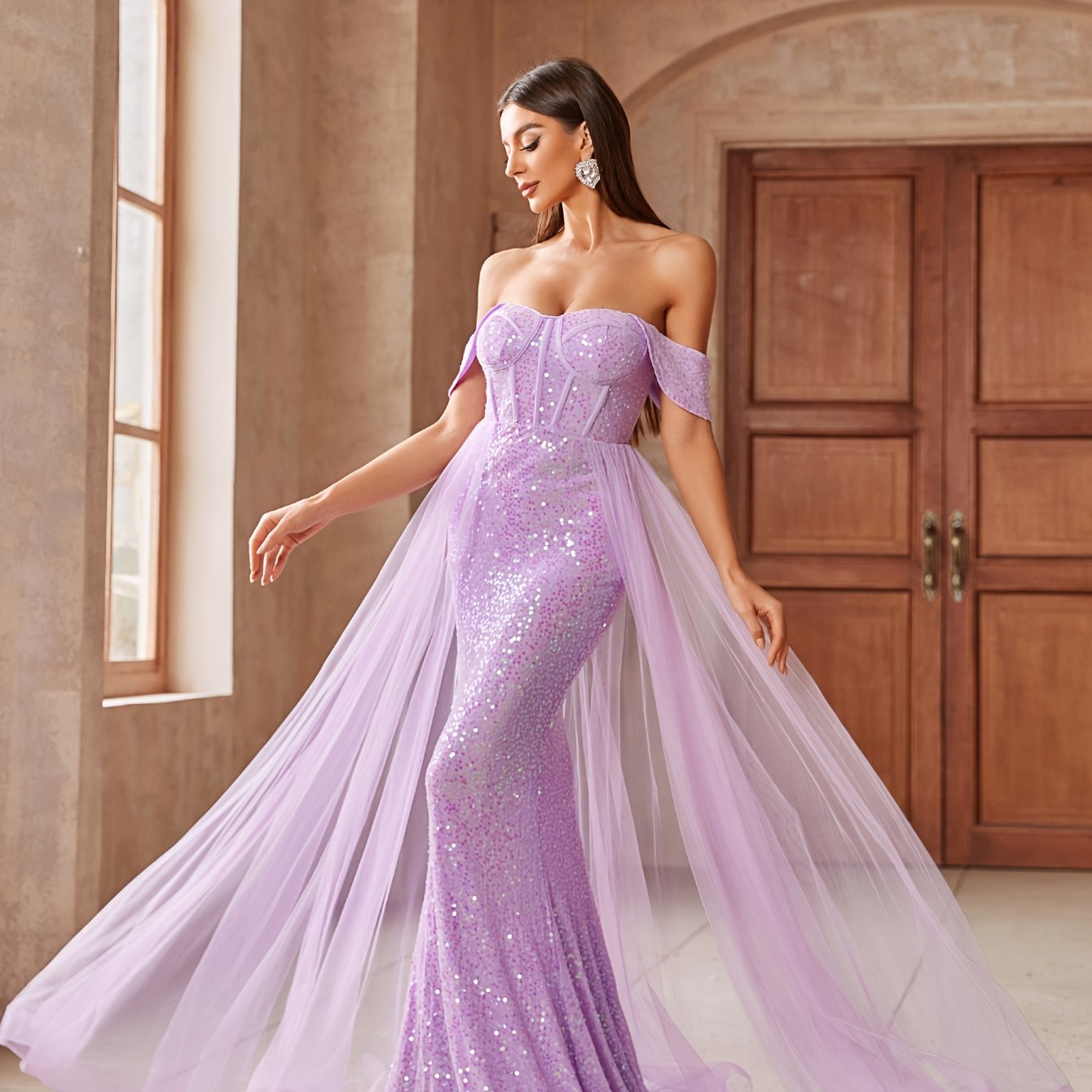 Sixsr Sequin Off Shoulder Mermaid Dress, Elegant Floor Length Mesh Overlay Cocktail Dress For Party & Banquet, Women's Clothing