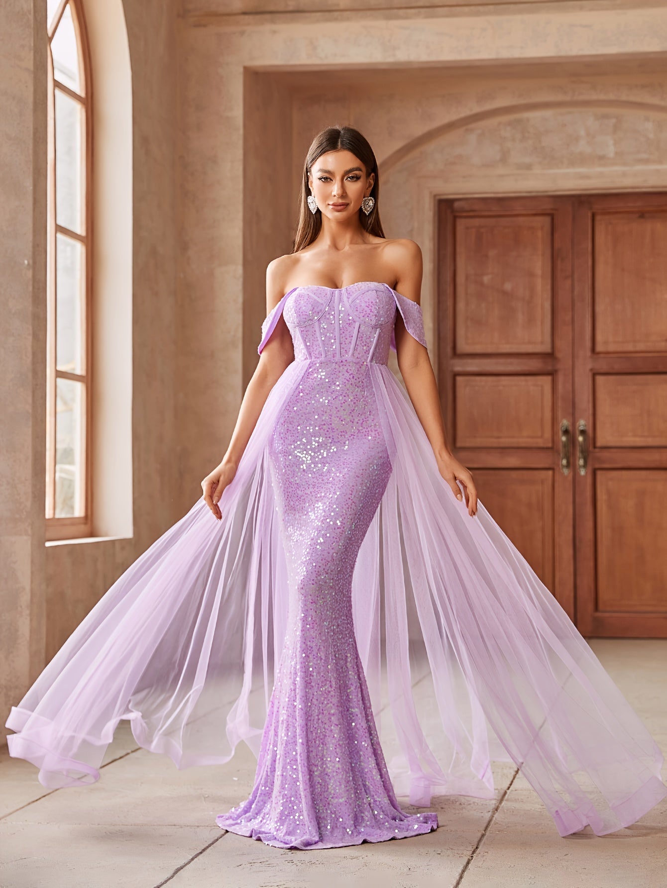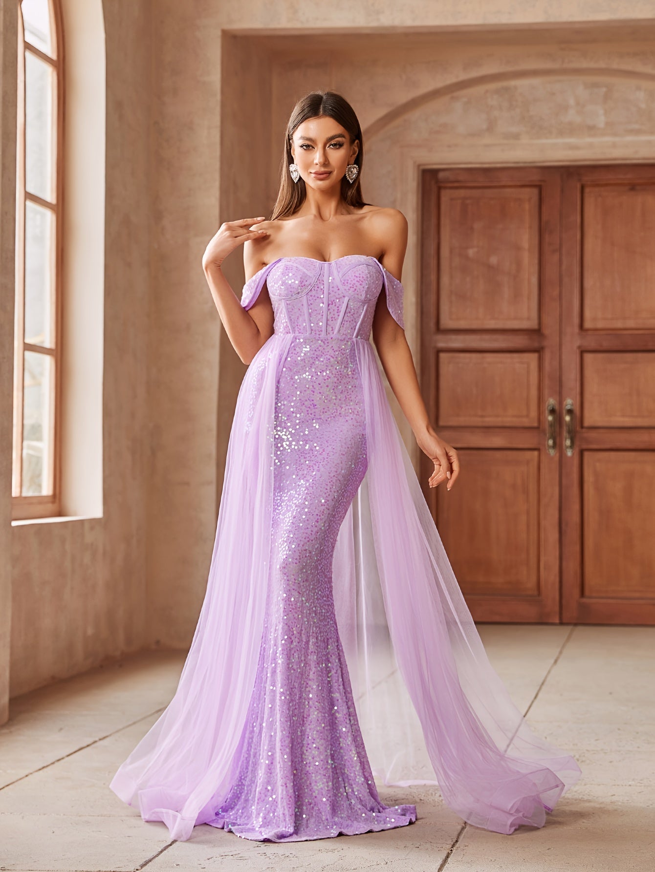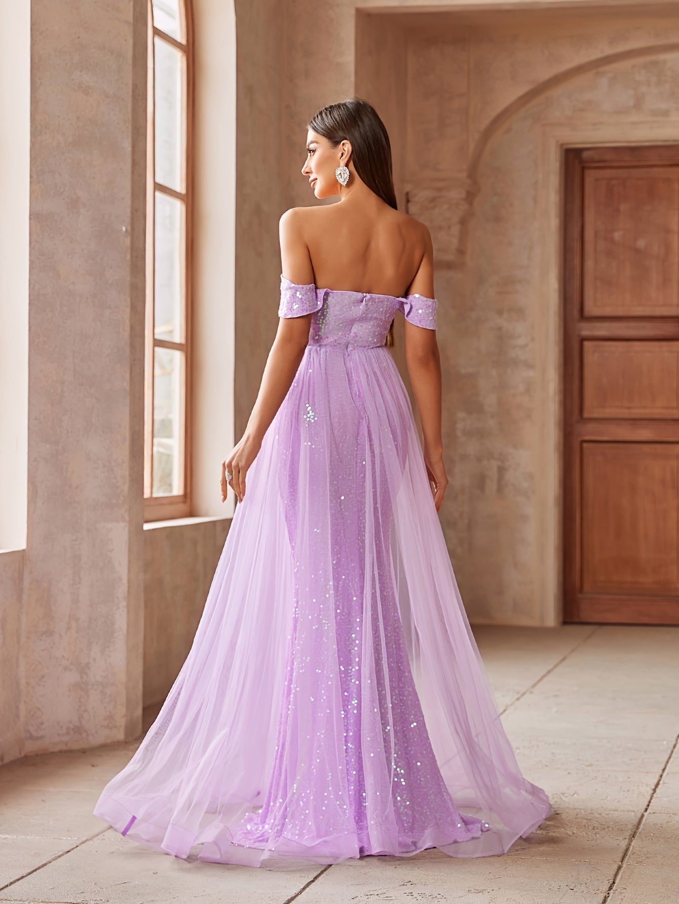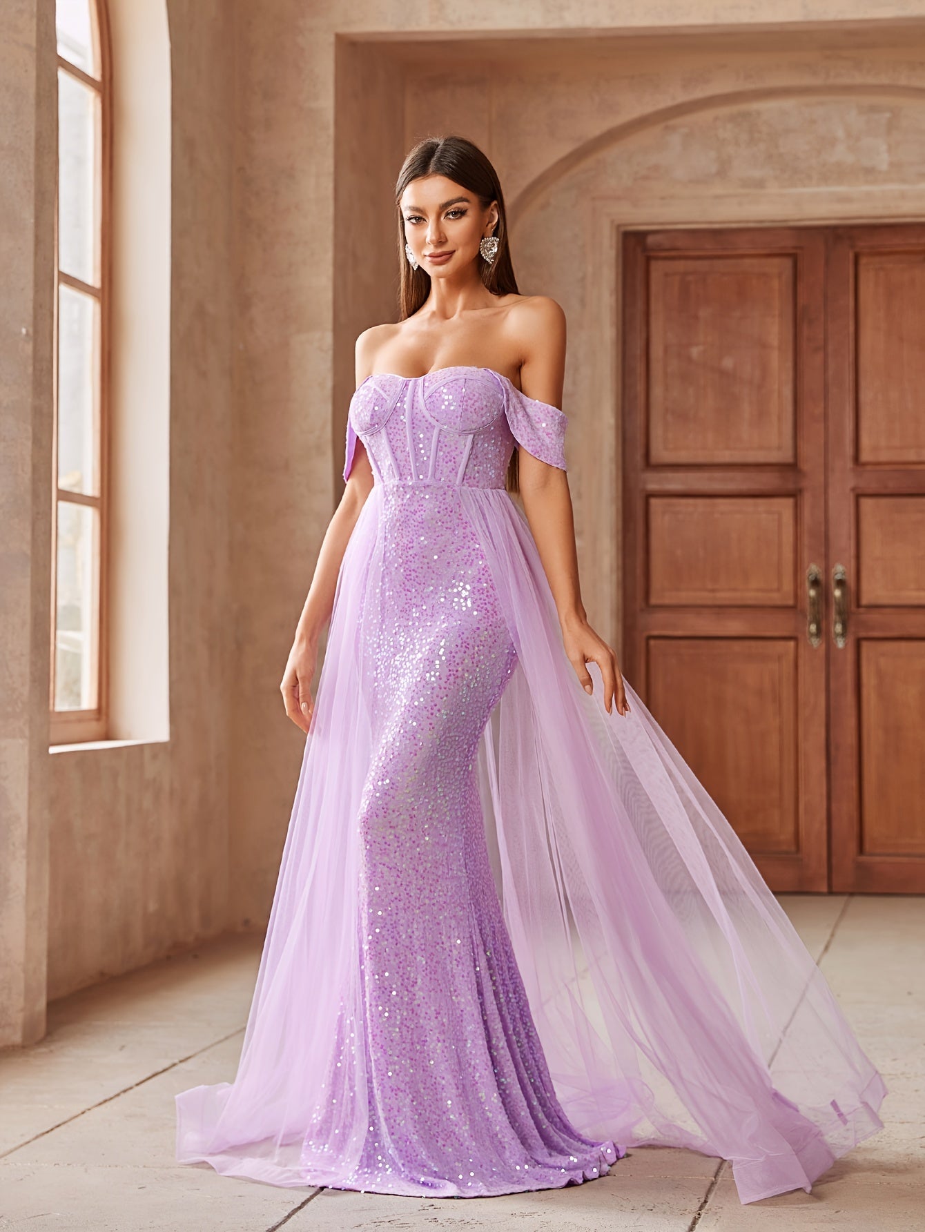 Sixsr Sequin Off Shoulder Mermaid Dress, Elegant Floor Length Mesh Overlay Cocktail Dress For Party & Banquet, Women's Clothing