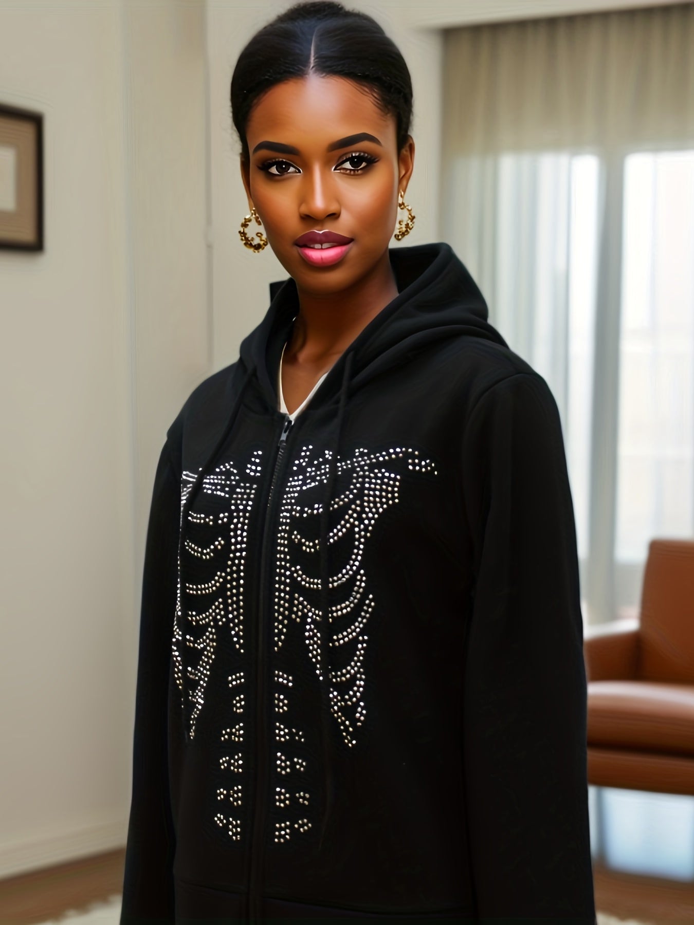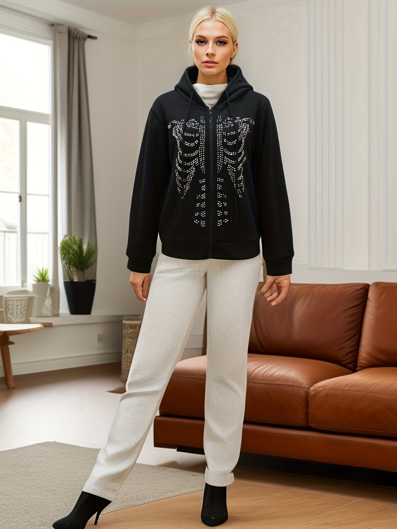 Sixsr Skeleton Print Zip Up Hoodies, Casual Drawstring Long Sleeve Sweatshirt, Women's Clothing