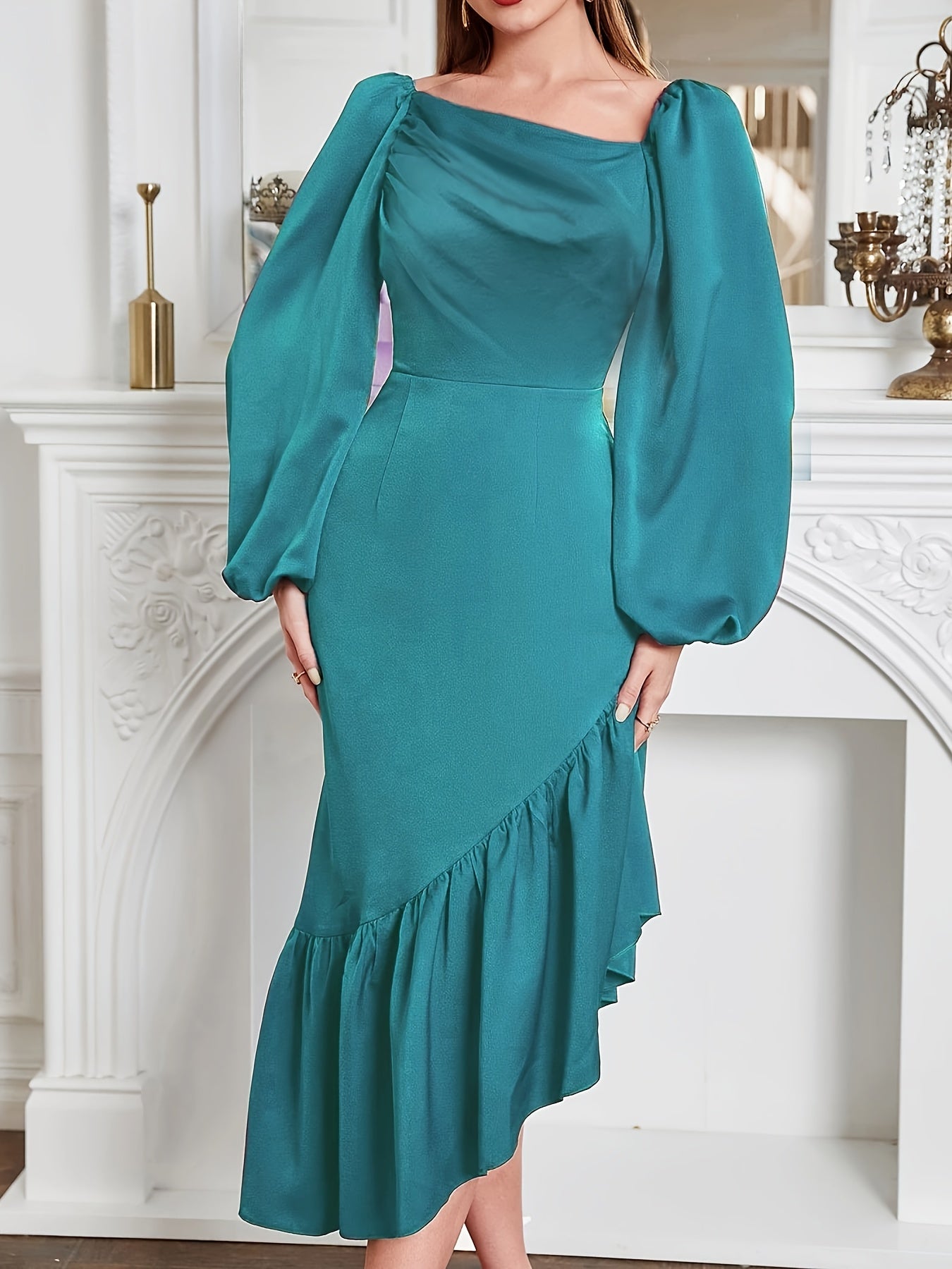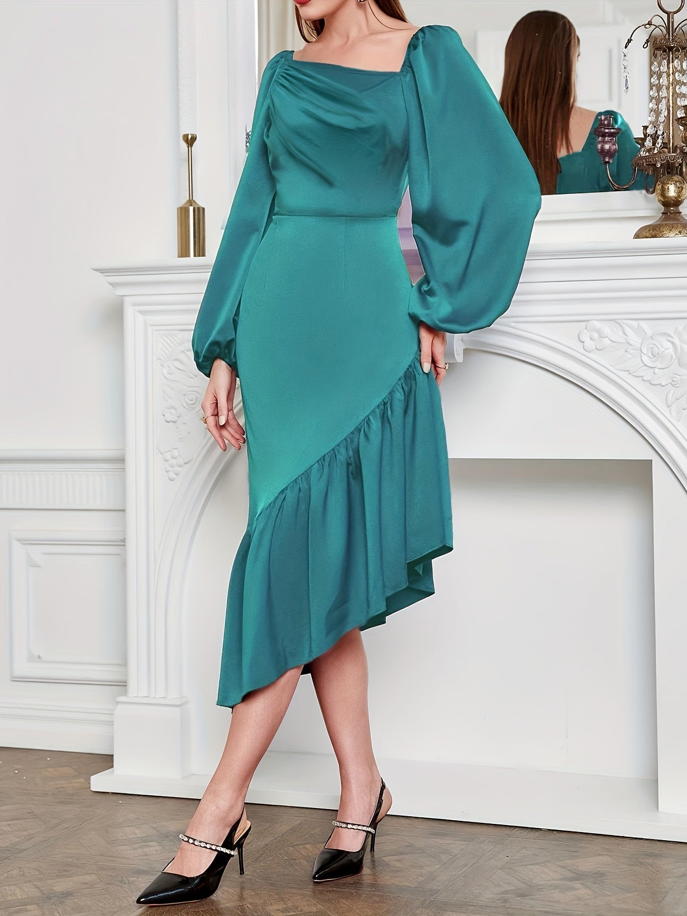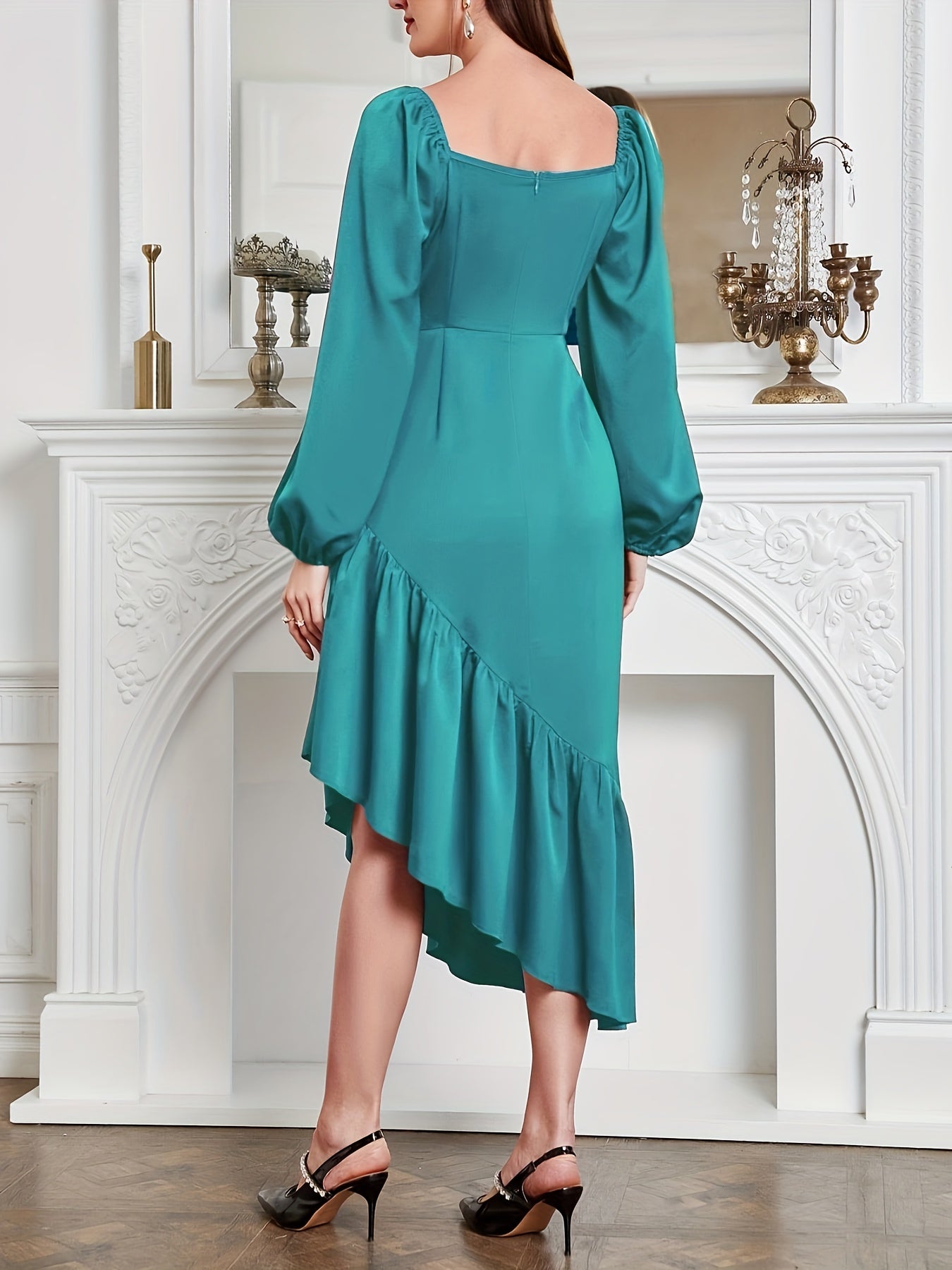 Sixsr Solid Asymmetrical Hem Smocked Dress, Elegant Lantern Sleeve Dress For Spring & Fall, Women's Clothing