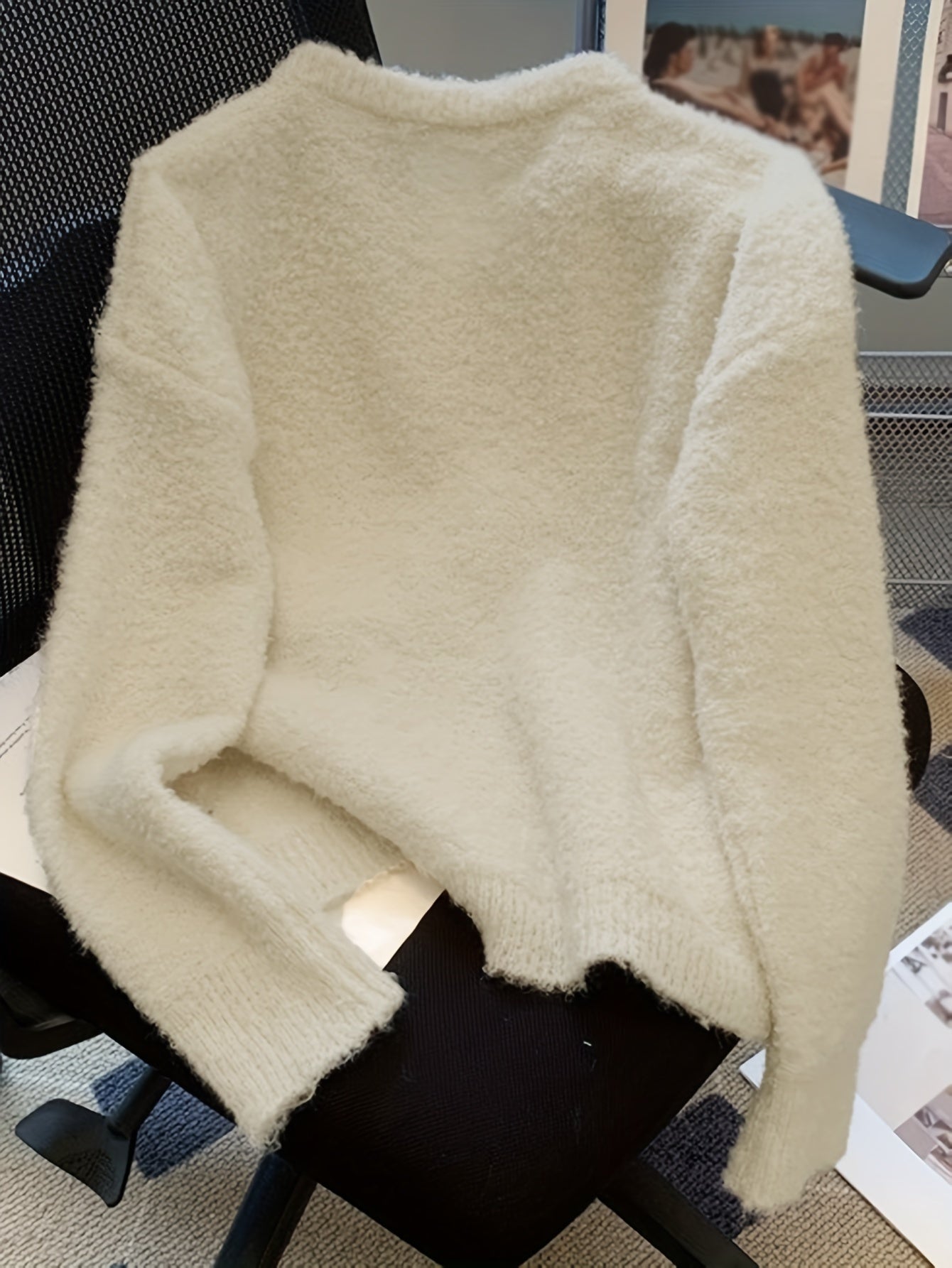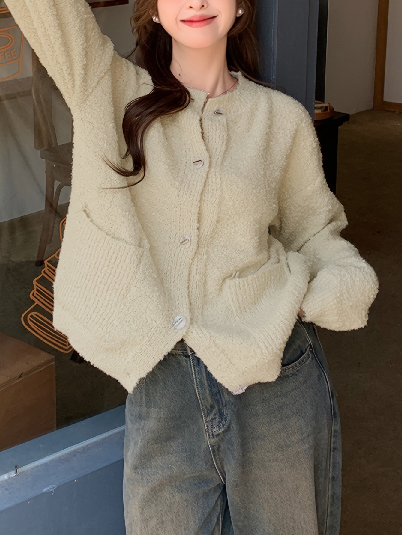 Sixsr Solid Button Up Knit Cardigan, Casual Long Sleeve Fuzzy Pocket Sweater, Women's Clothing