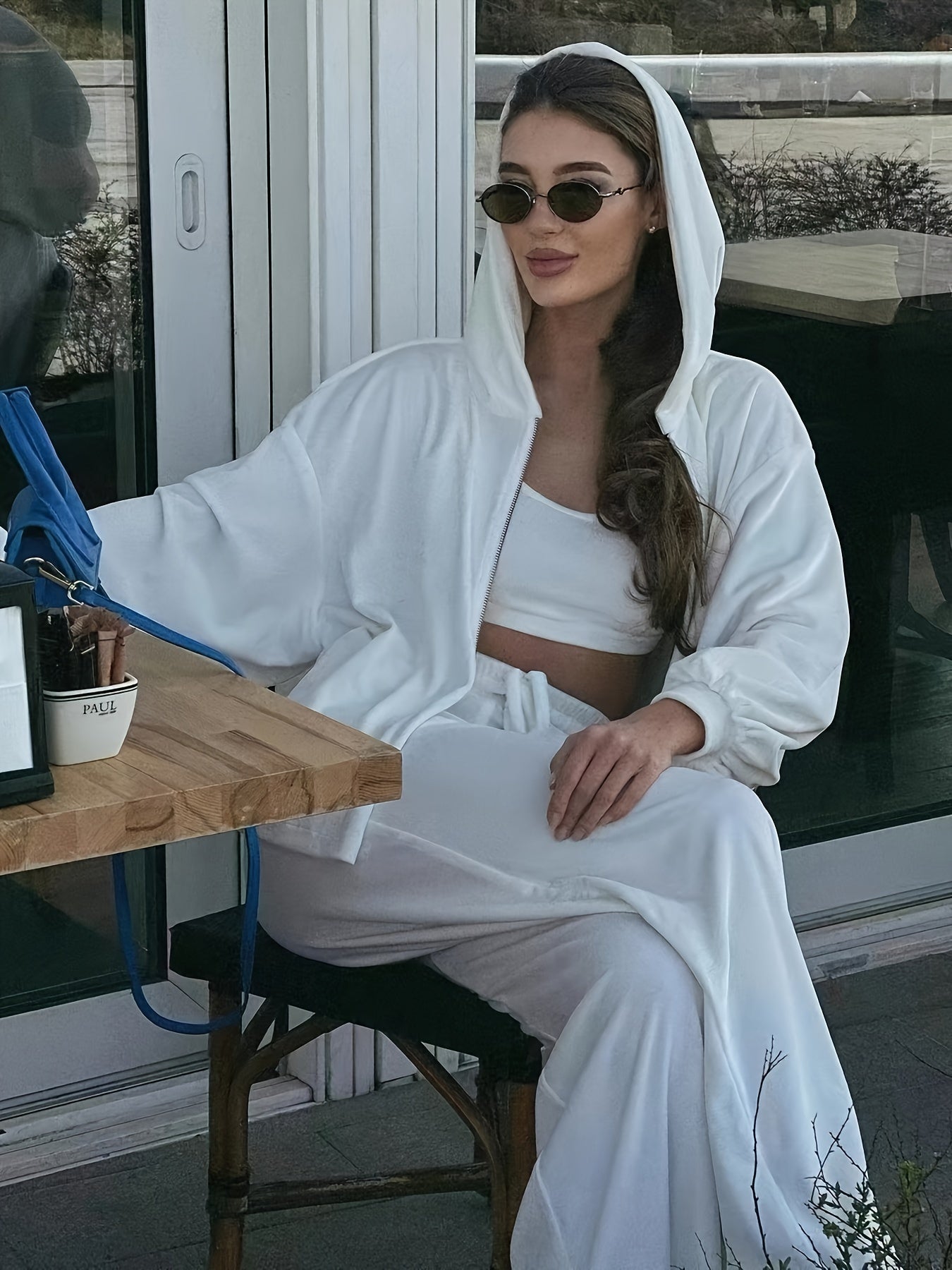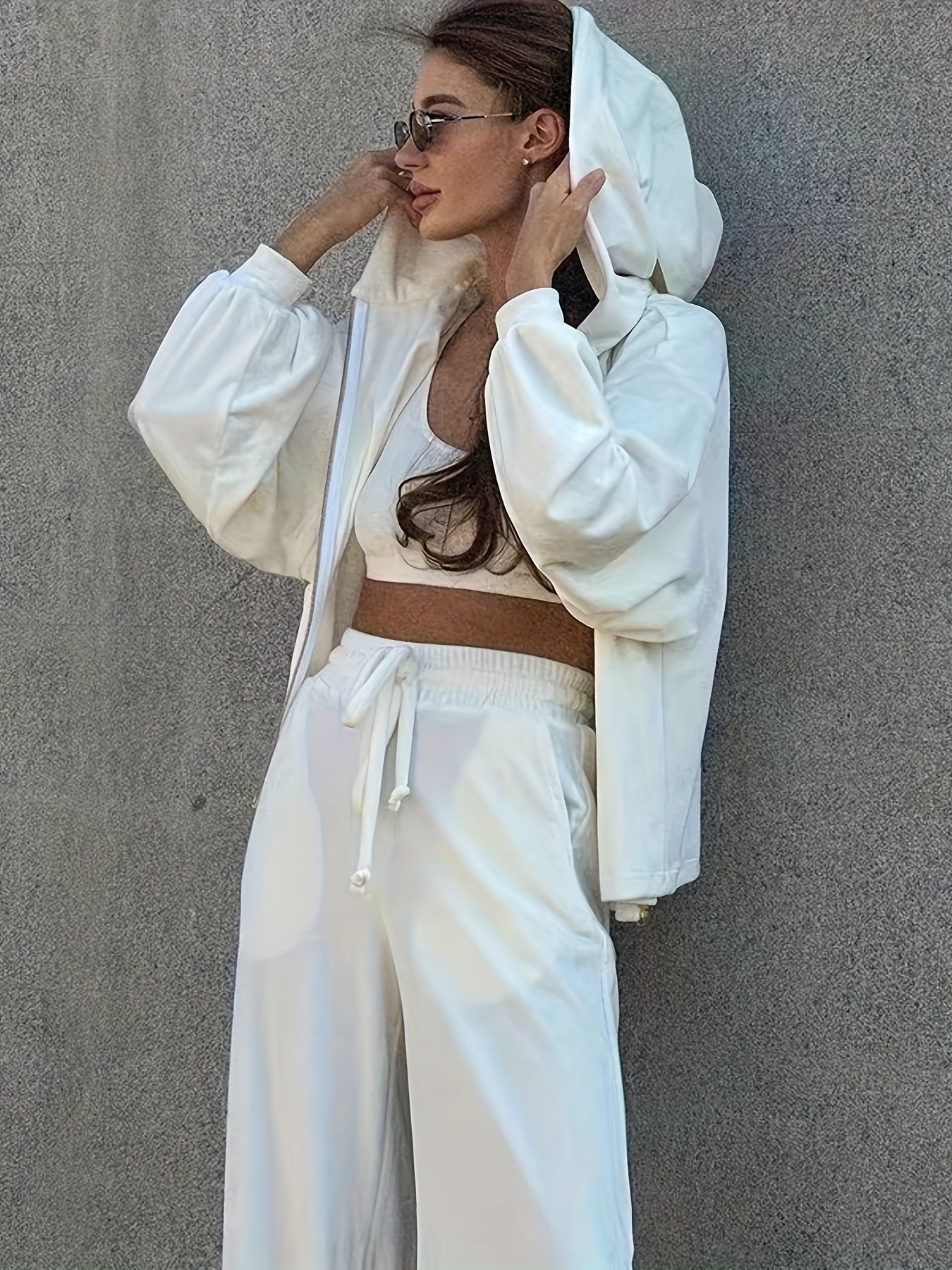 Sixsr Solid Casual Three-piece Set, Zip Up Hooded Jacket & Crop Tank Top & Drawstring Pants Outfits, Women's Clothing