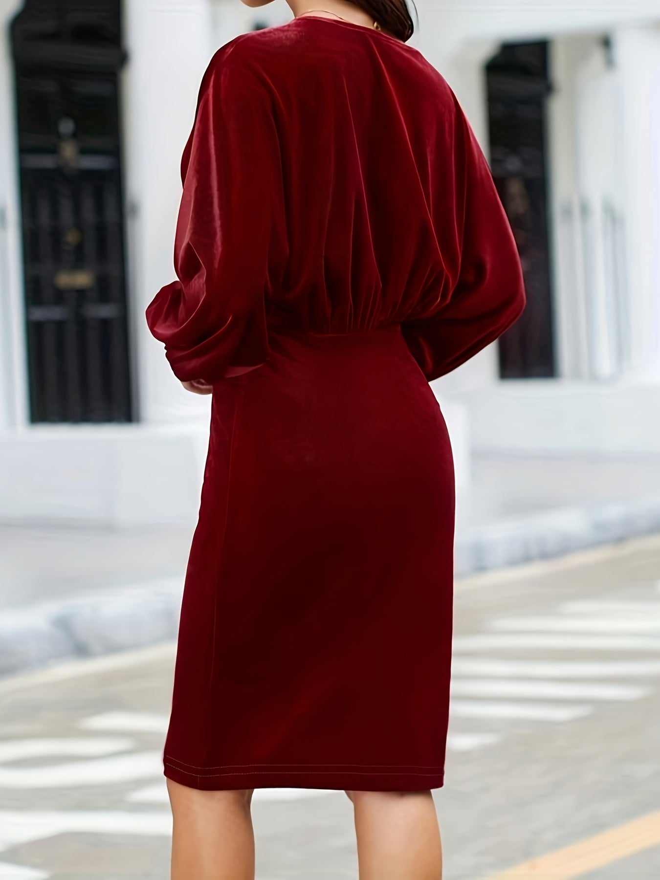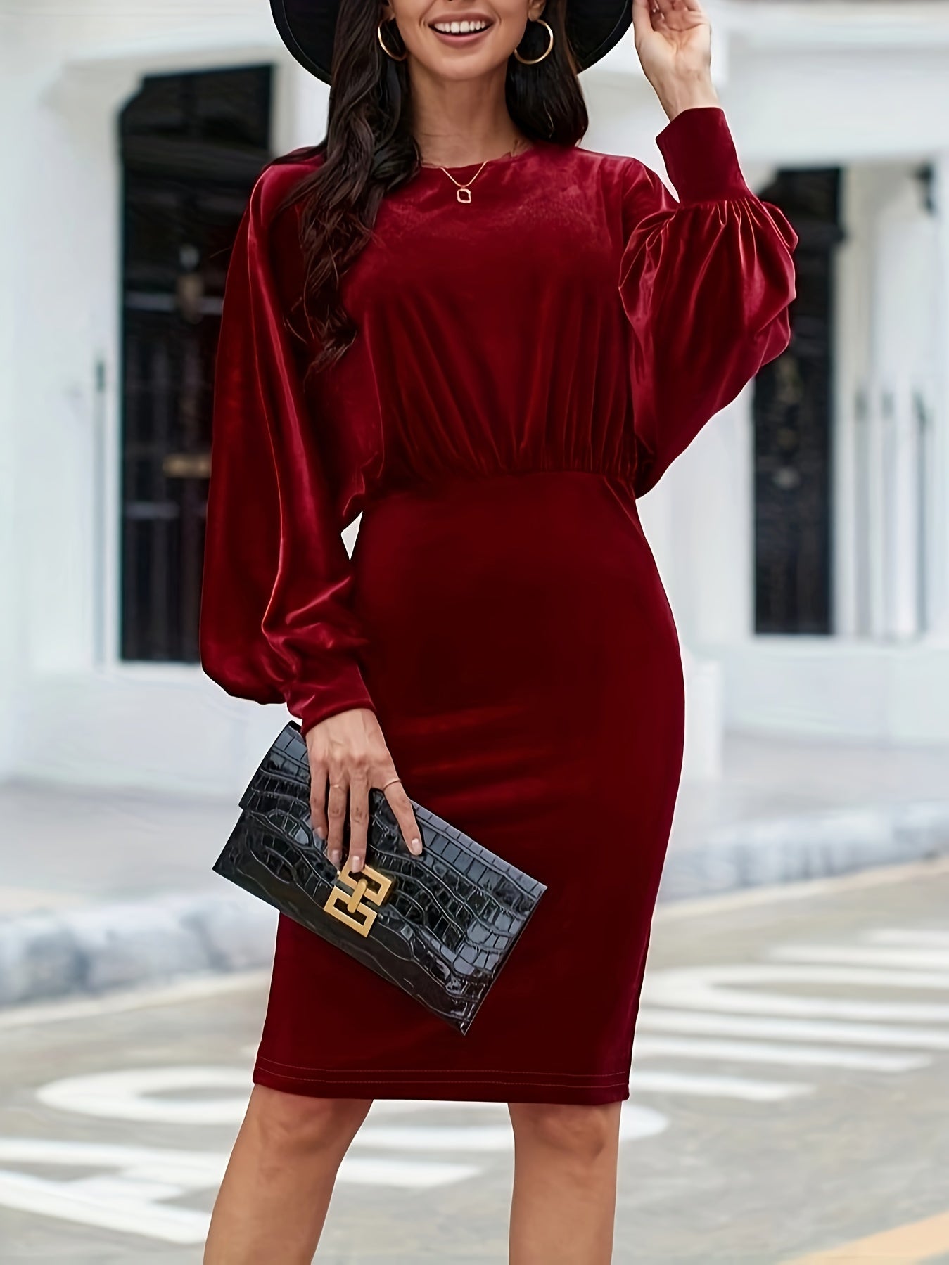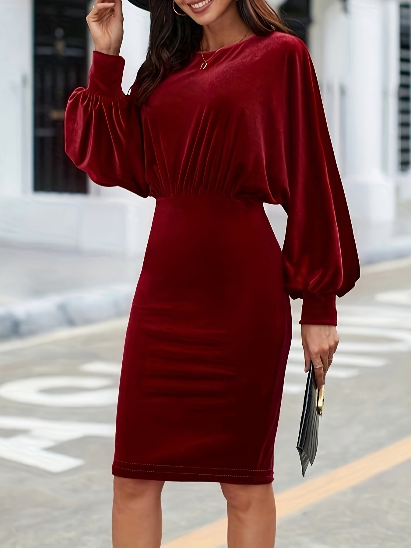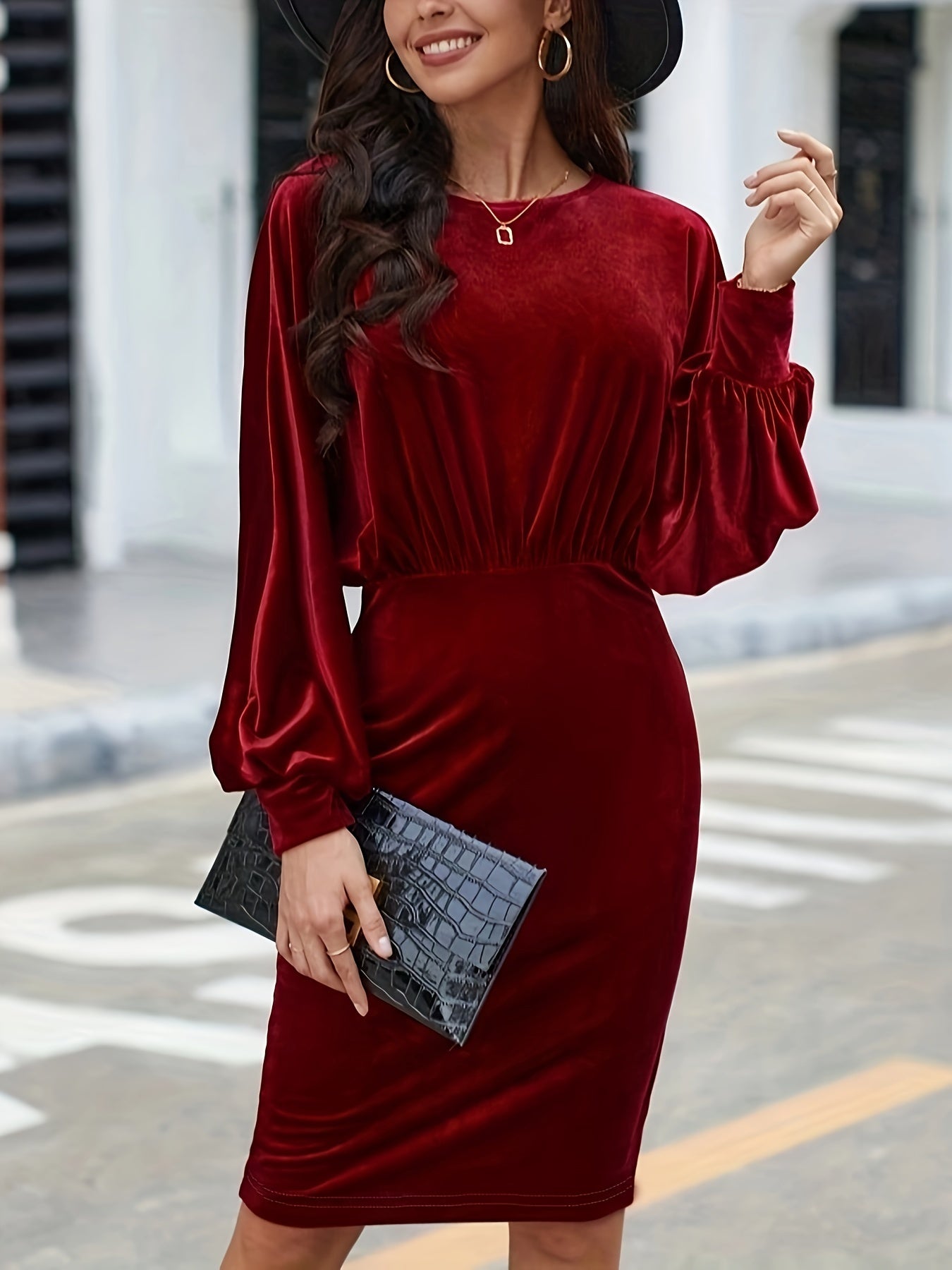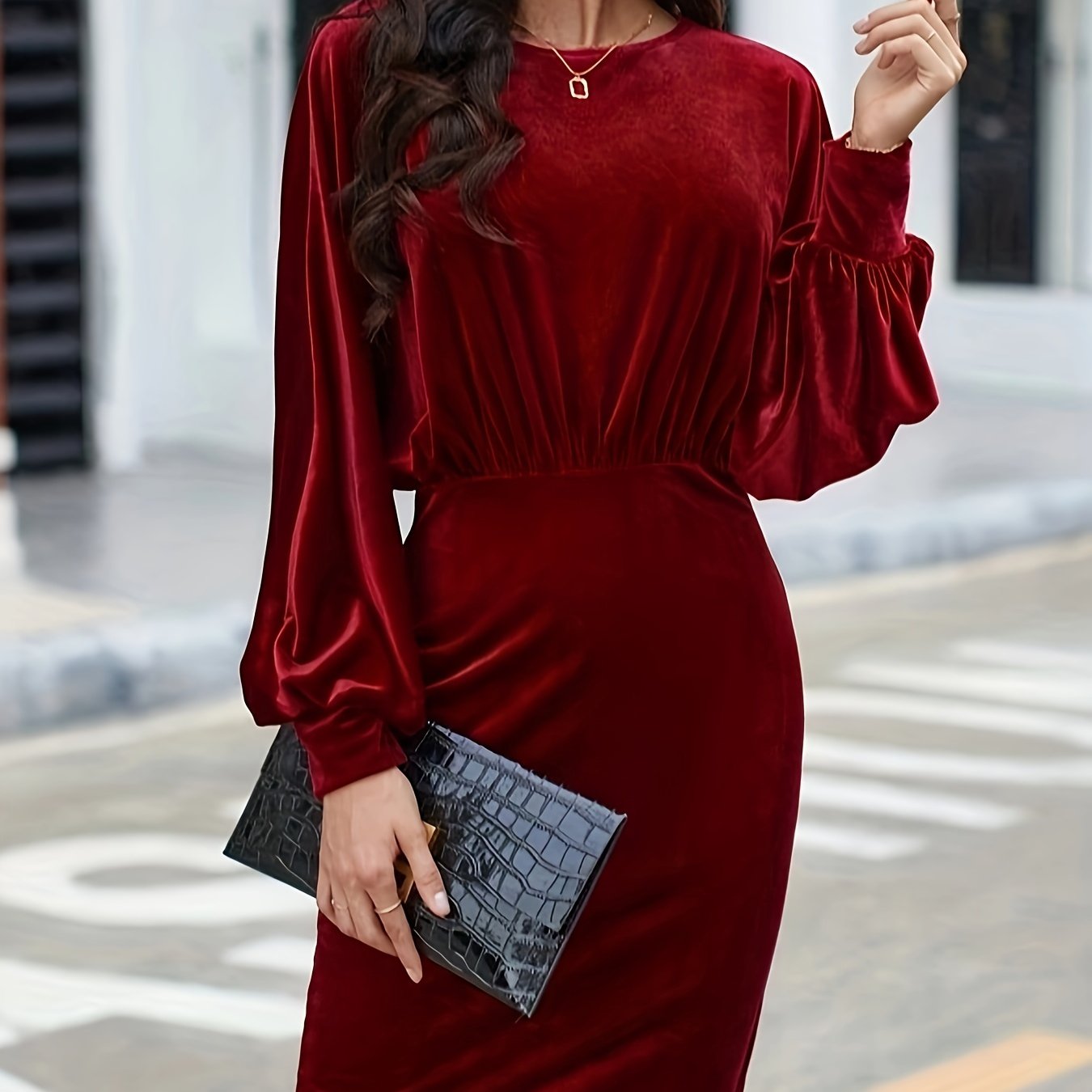 Sixsr Solid Cinched Waist Velvet Dress, Elegant Lantern Sleeve Bodycon Dress For Fall & Winter, Women's Clothing