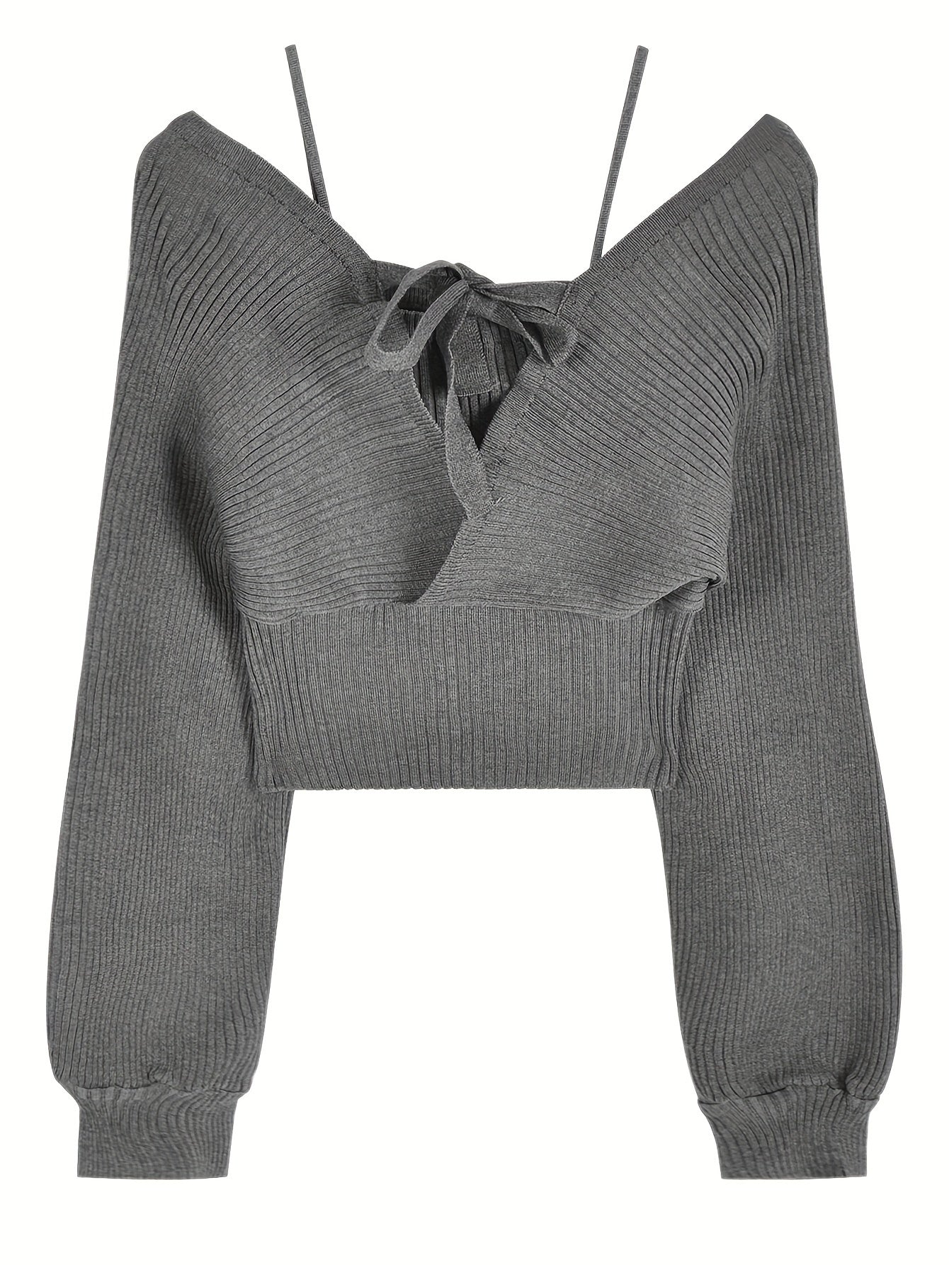 Sixsr Solid Color Faux Twinset Sweater, Chic Long Sleeve Crop Tied Sweater For Fall & Winter, Women's Clothing