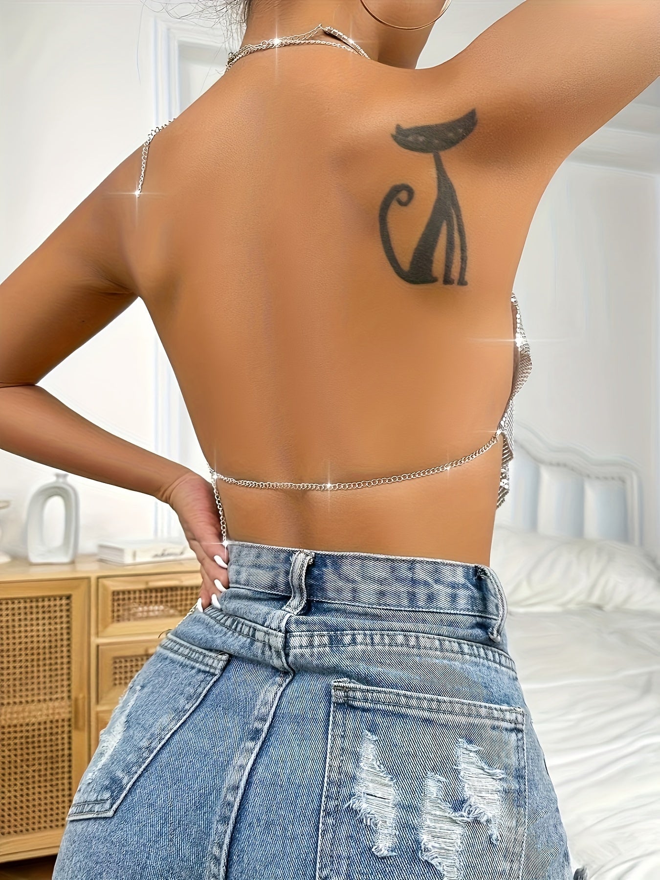Sixsr Solid Cowl Neck Hanky Hem Halter Top, Versatile Chain Strap Backless Halter Neck Top For Club & Party, Women's Clothing
