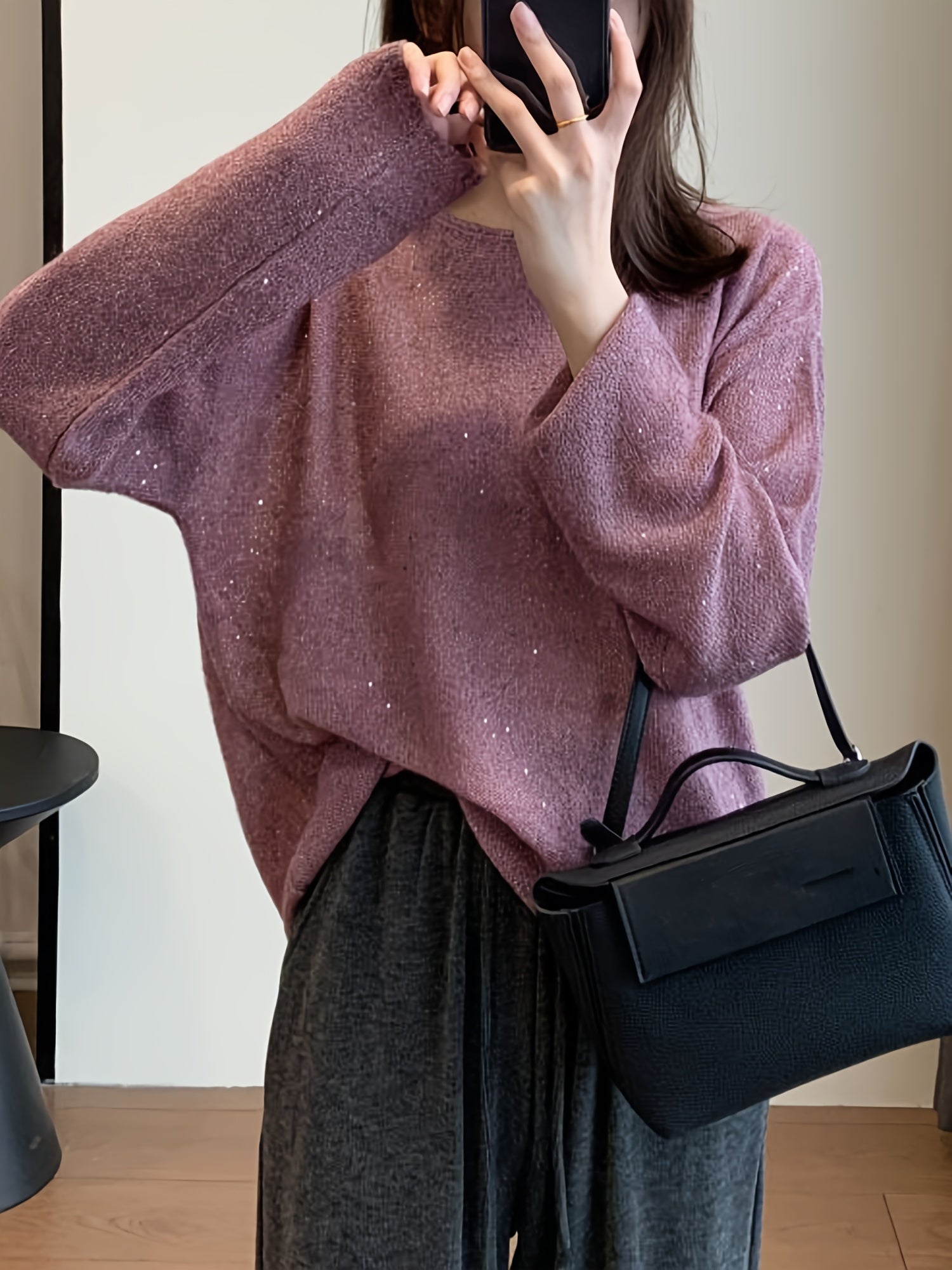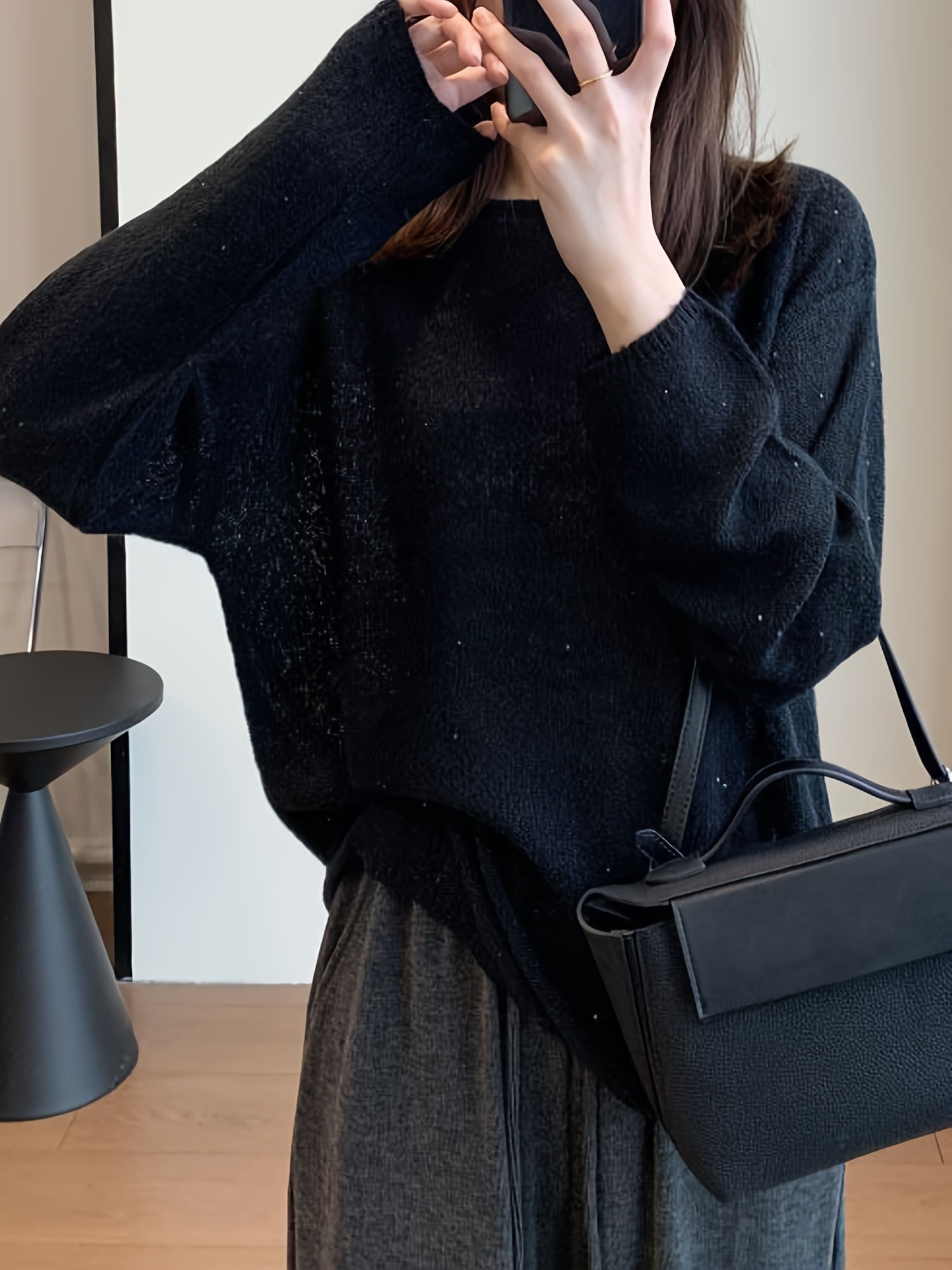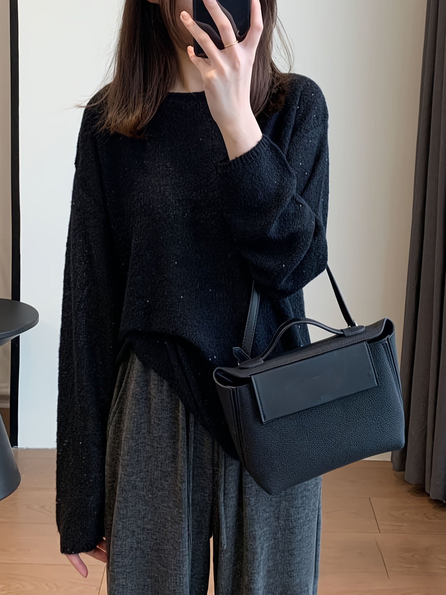 Sixsr Solid Crew Neck Pullover Sweater, Elegant Long Sleeve Drop Shoulder Sweater, Women's Clothing