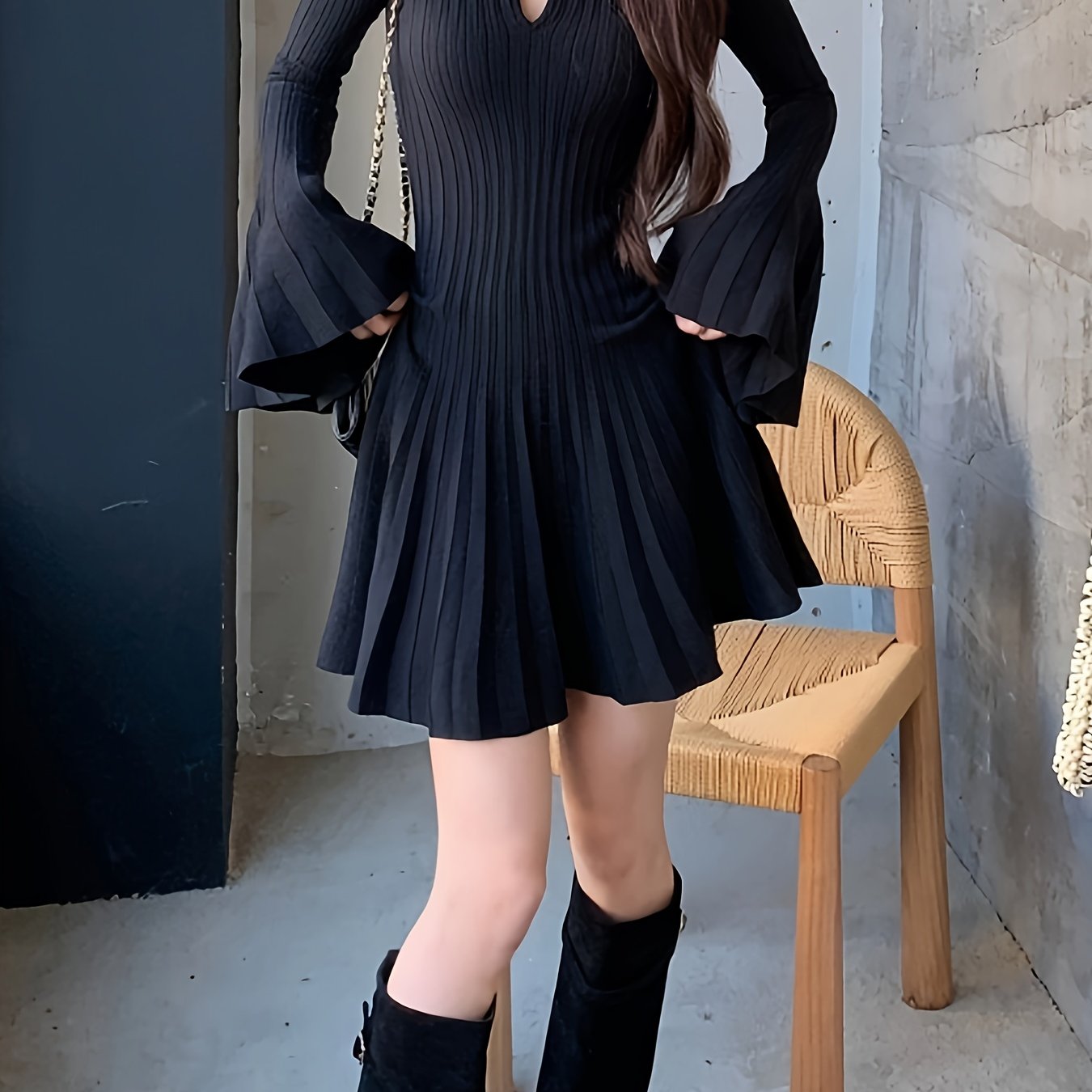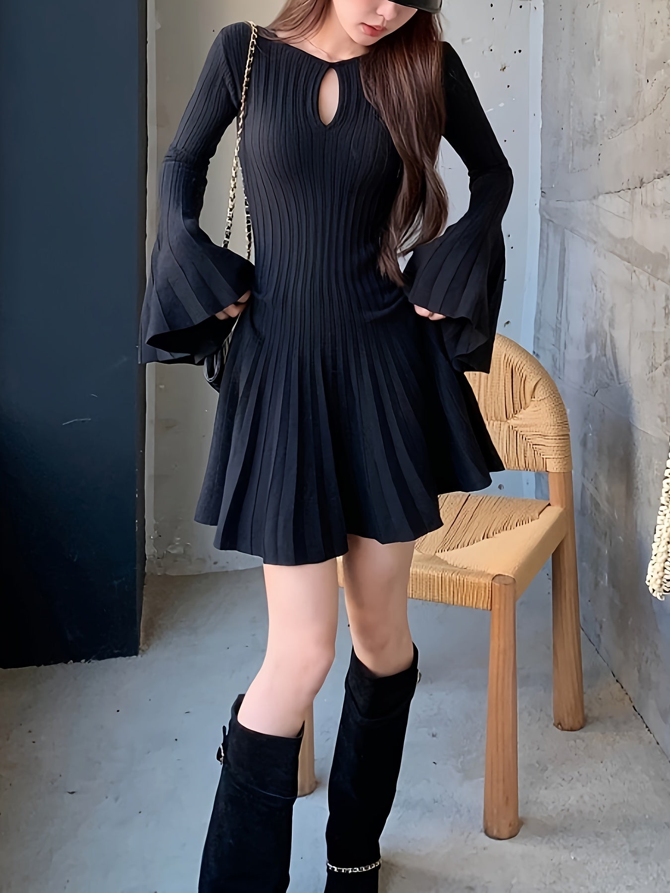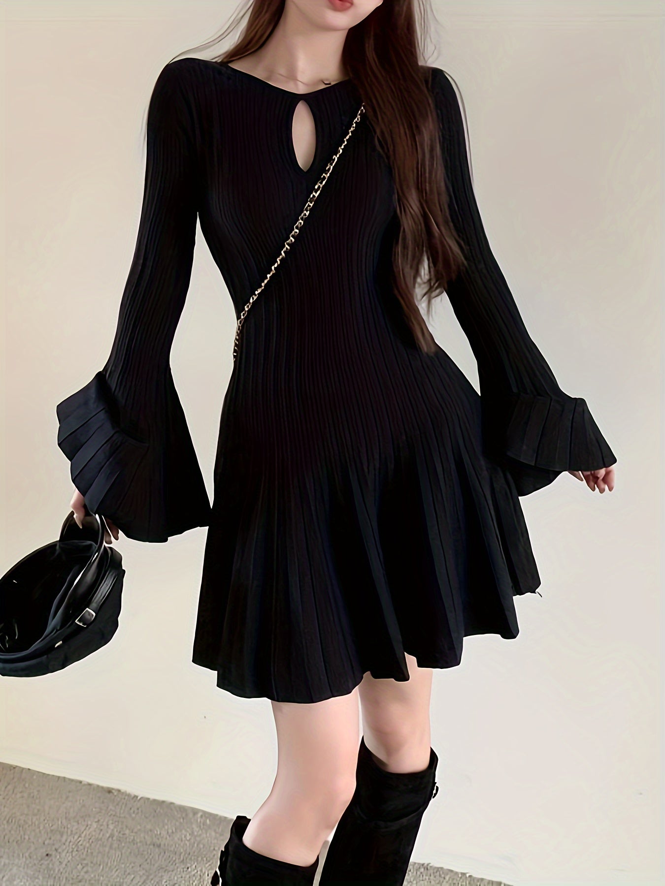 Sixsr Solid Cut Out Pleated Dress, Elegant Flare Sleeve Crew Neck Dress For Spring & Fall, Women's Clothing