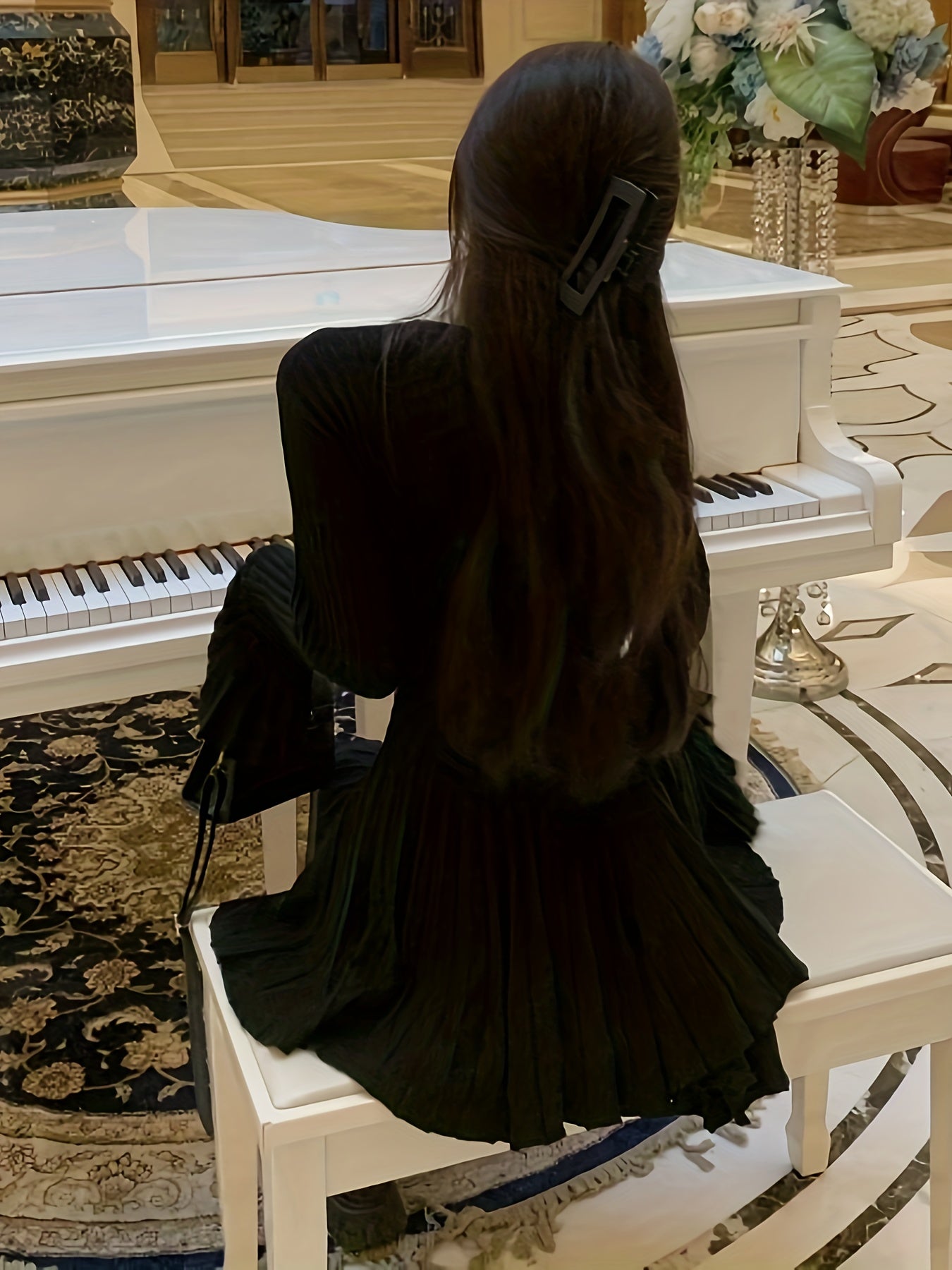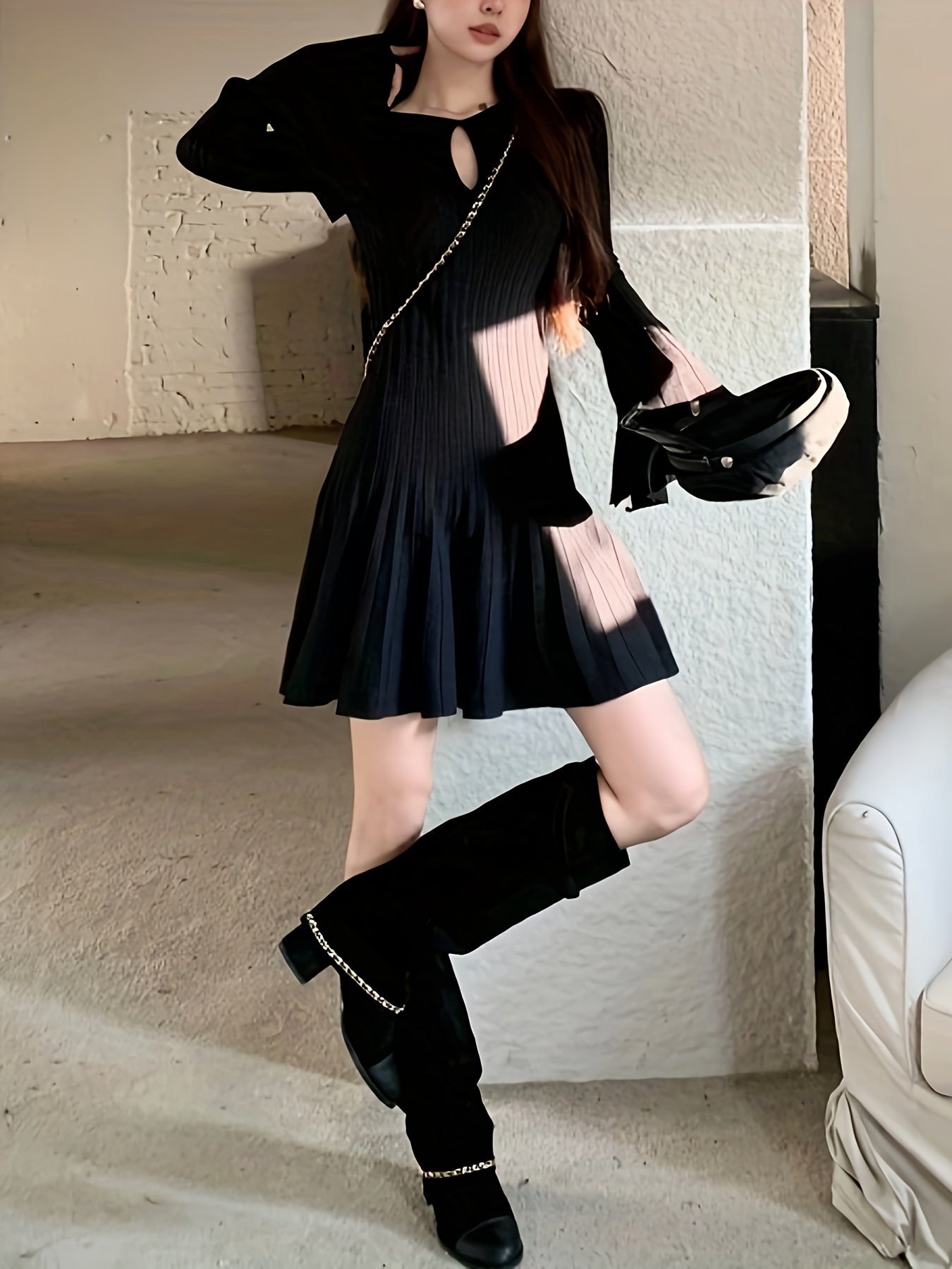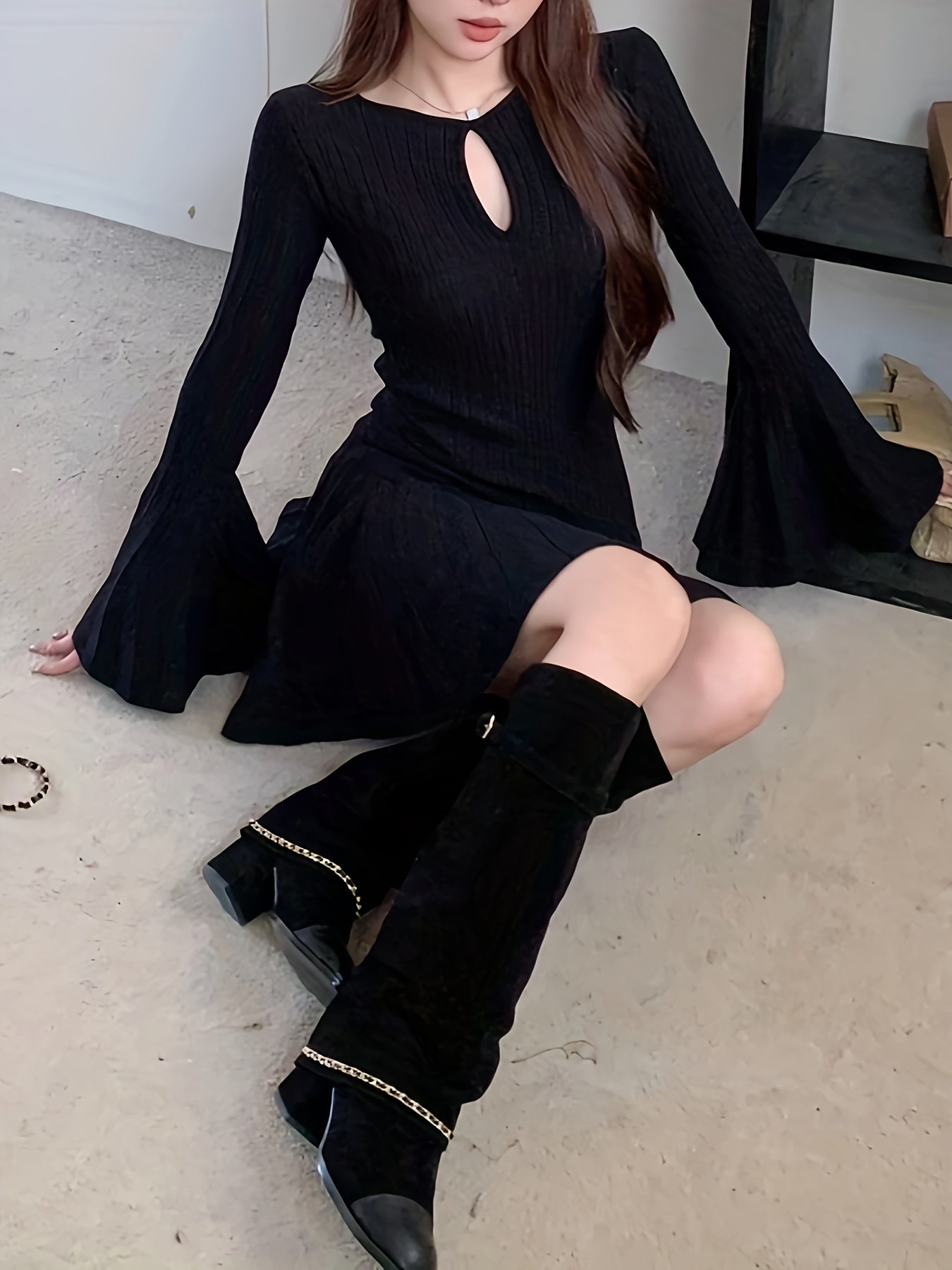 Sixsr Solid Cut Out Pleated Dress, Elegant Flare Sleeve Crew Neck Dress For Spring & Fall, Women's Clothing