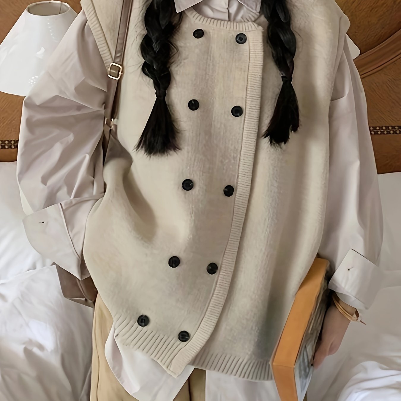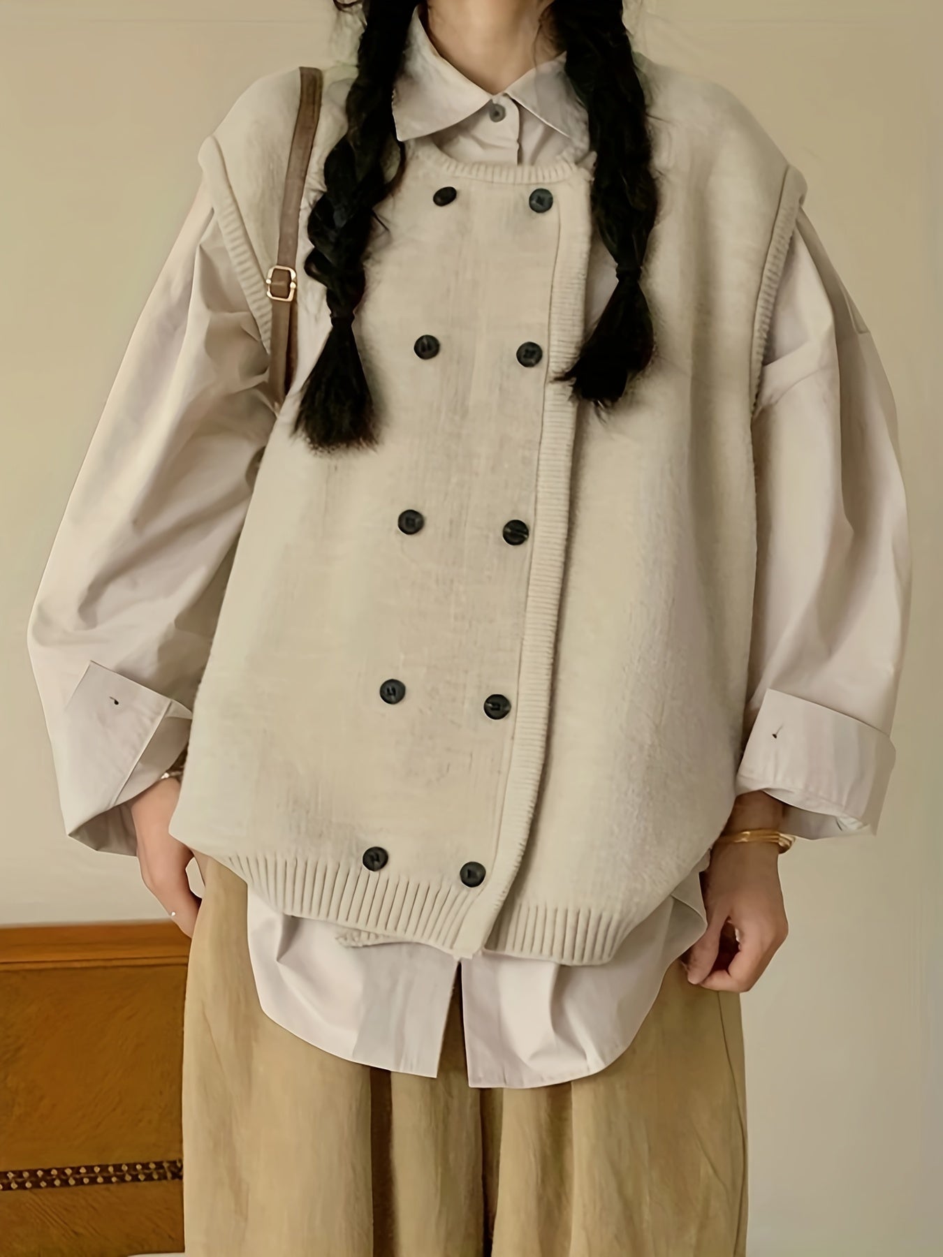 Sixsr Solid Double Breasted Knitted Vest, Casual Crew Neck Sleeveless Loose Sweater, Women's Clothing