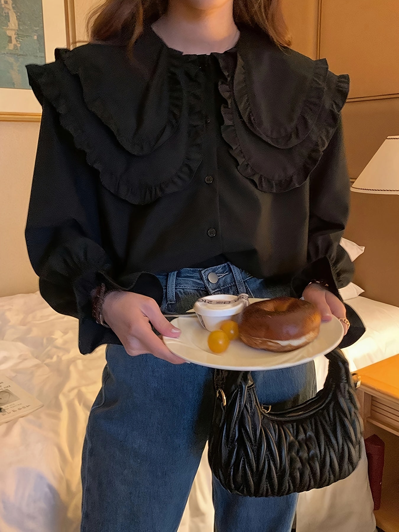 Sixsr Solid Lapel Collar Lettuce Trim Blouse, Long Sleeve Button Up Casual Blouse, Women's Clothing