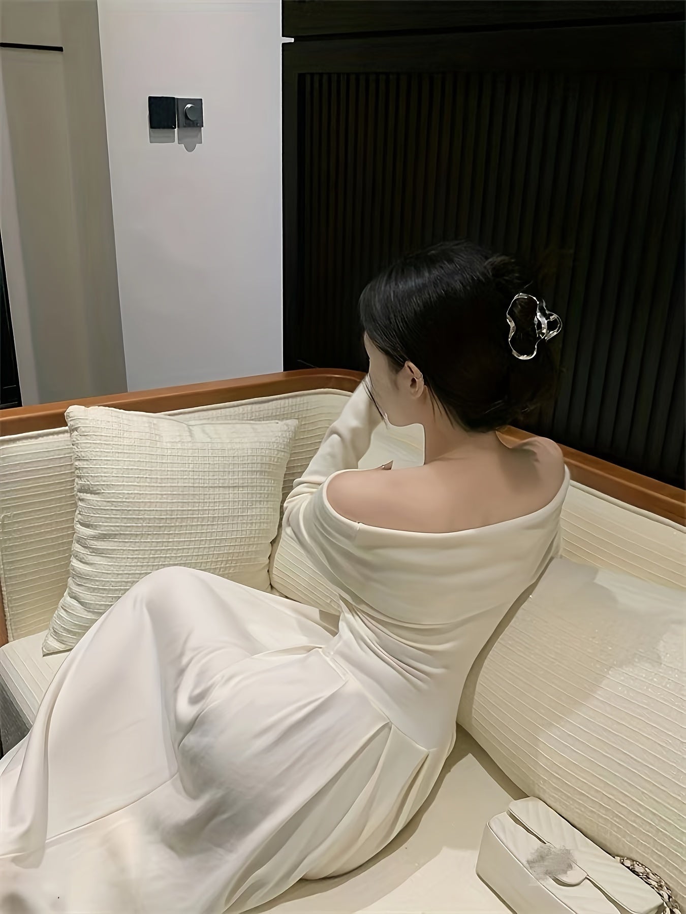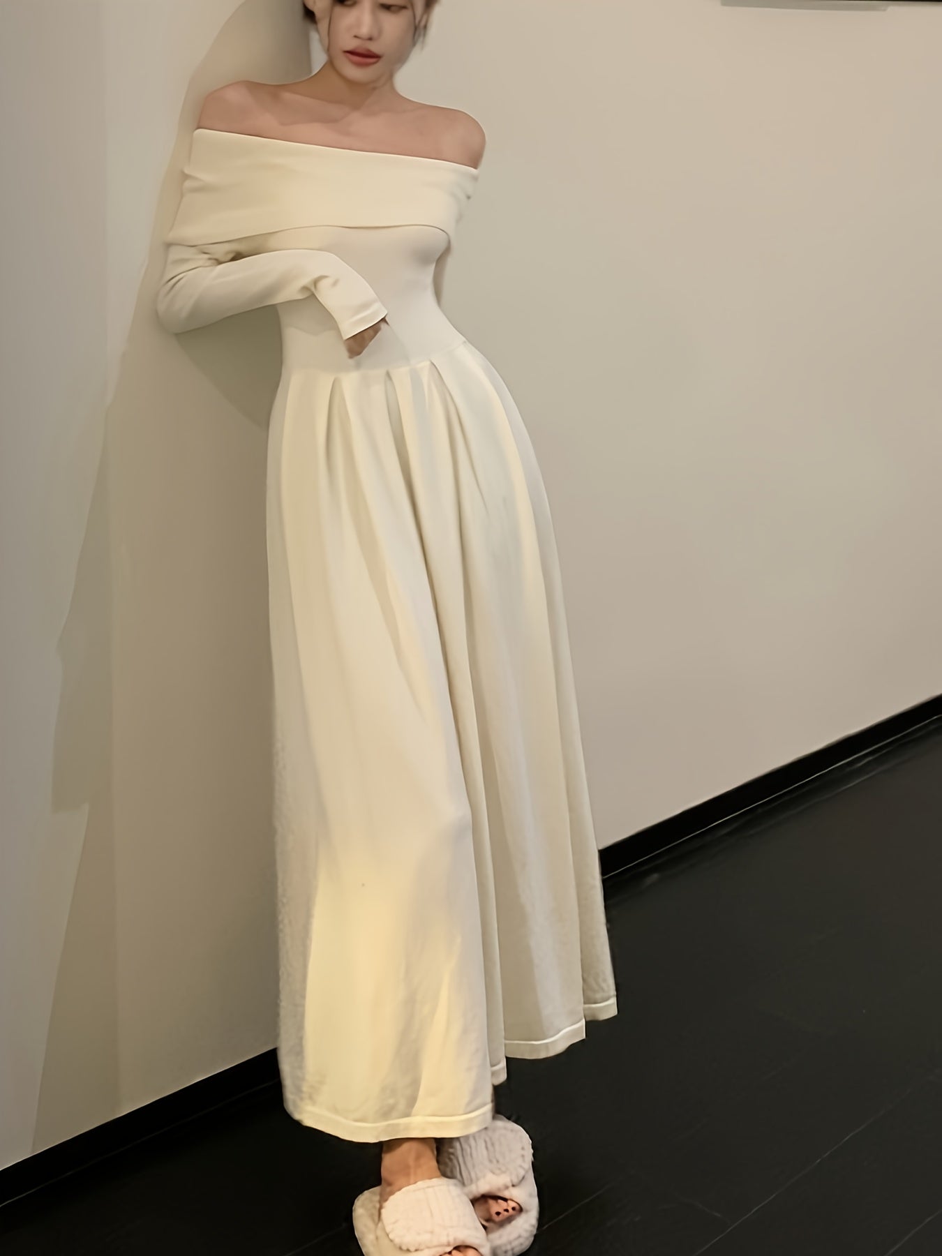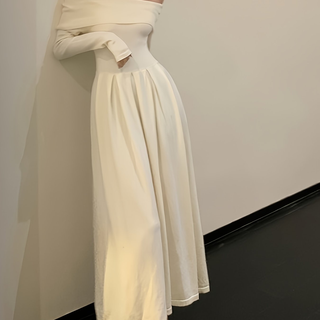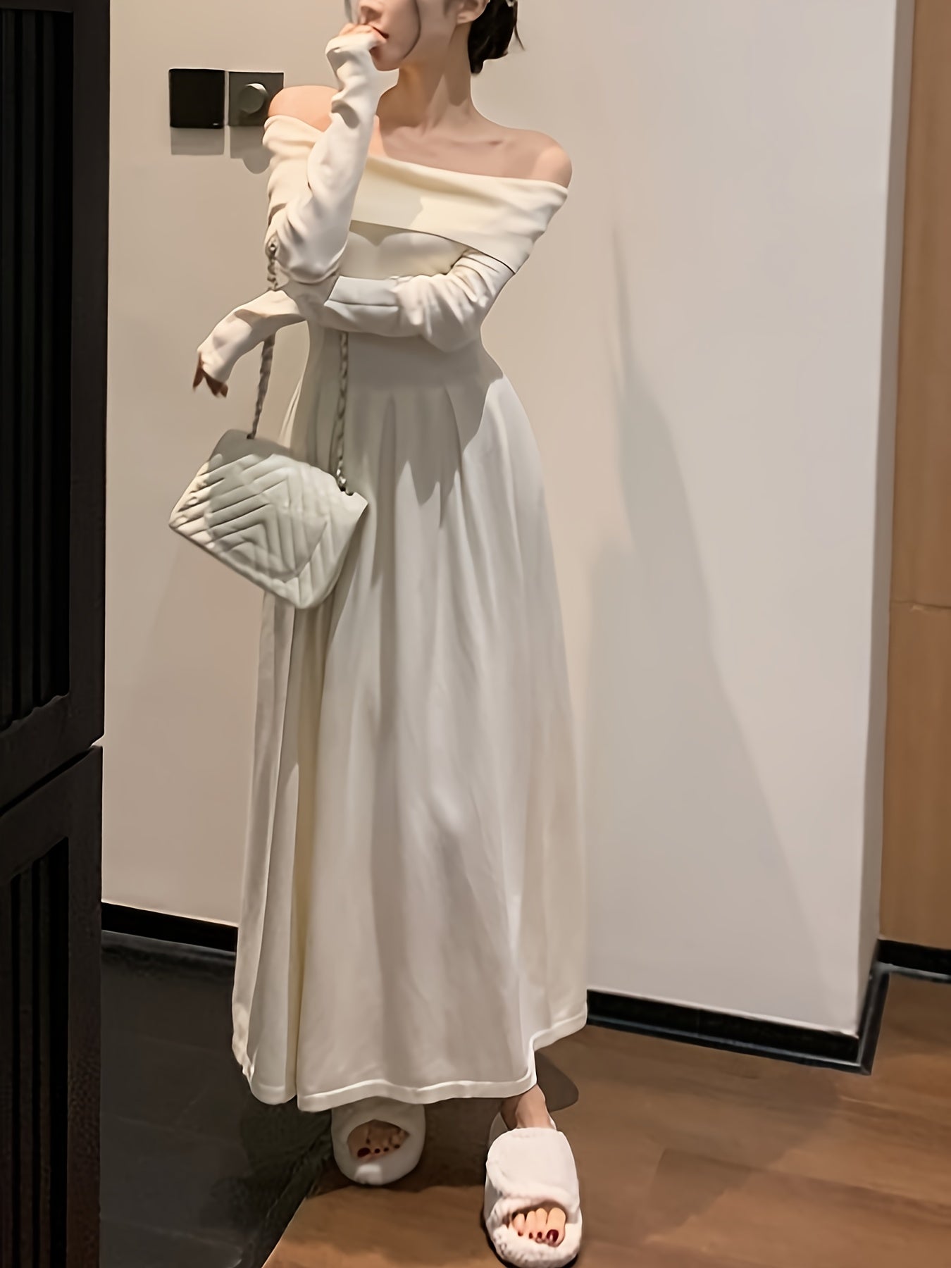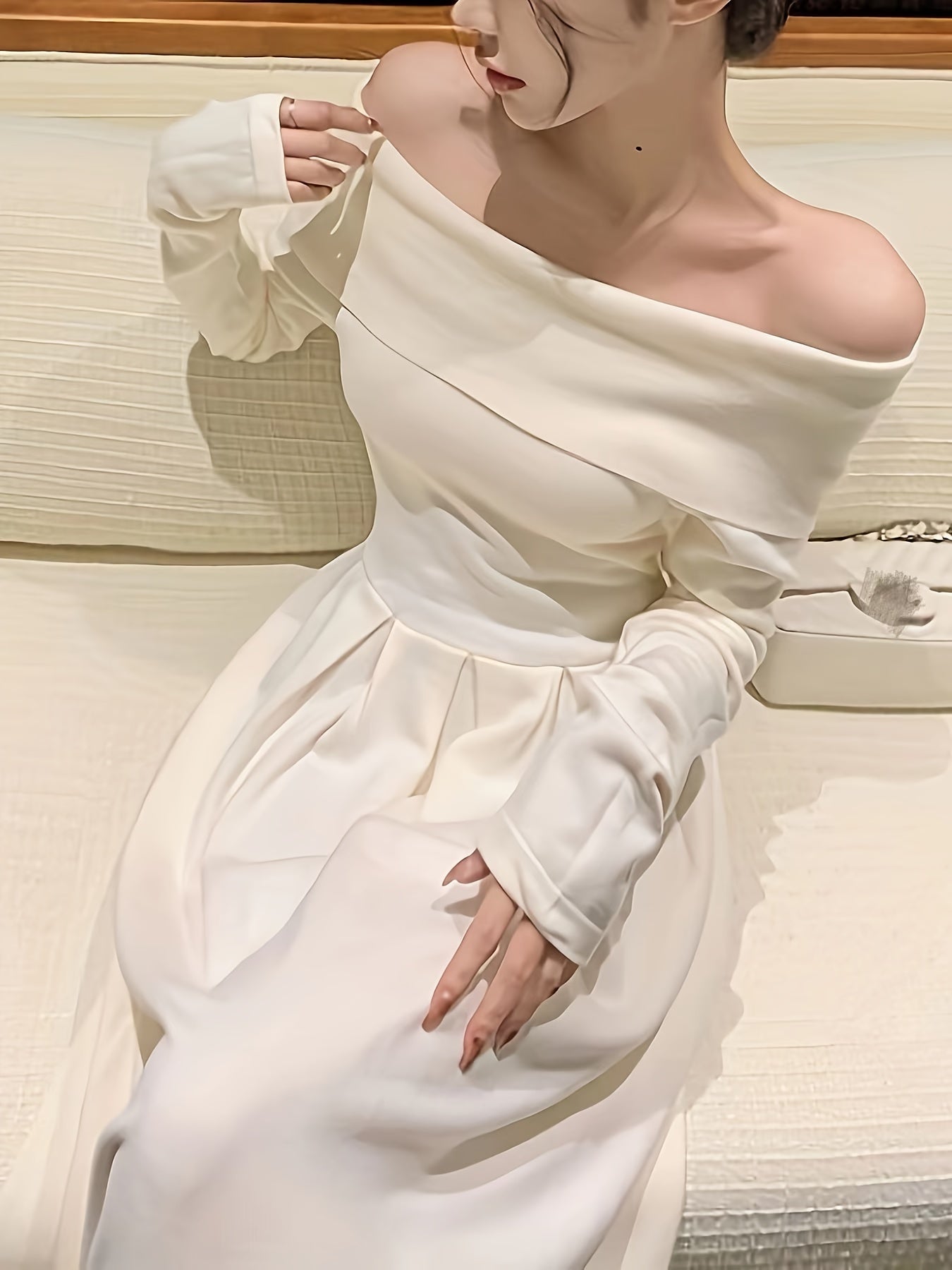 Sixsr Solid Off Shoulder Aline Dress, Elegant Ruffle Hem Long Sleeve Slim Dress For Spring & Fall, Women's Clothing