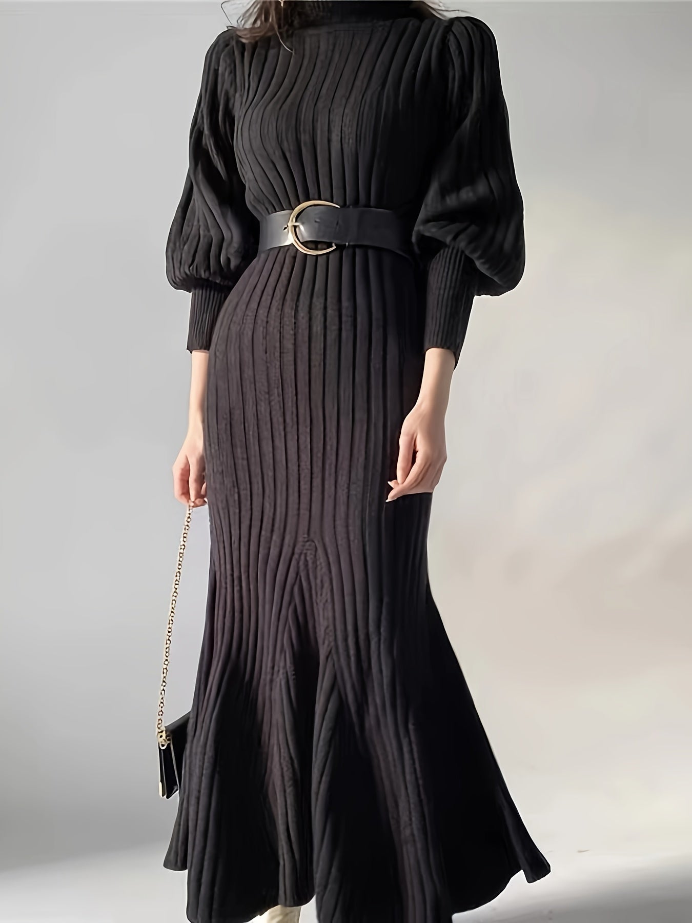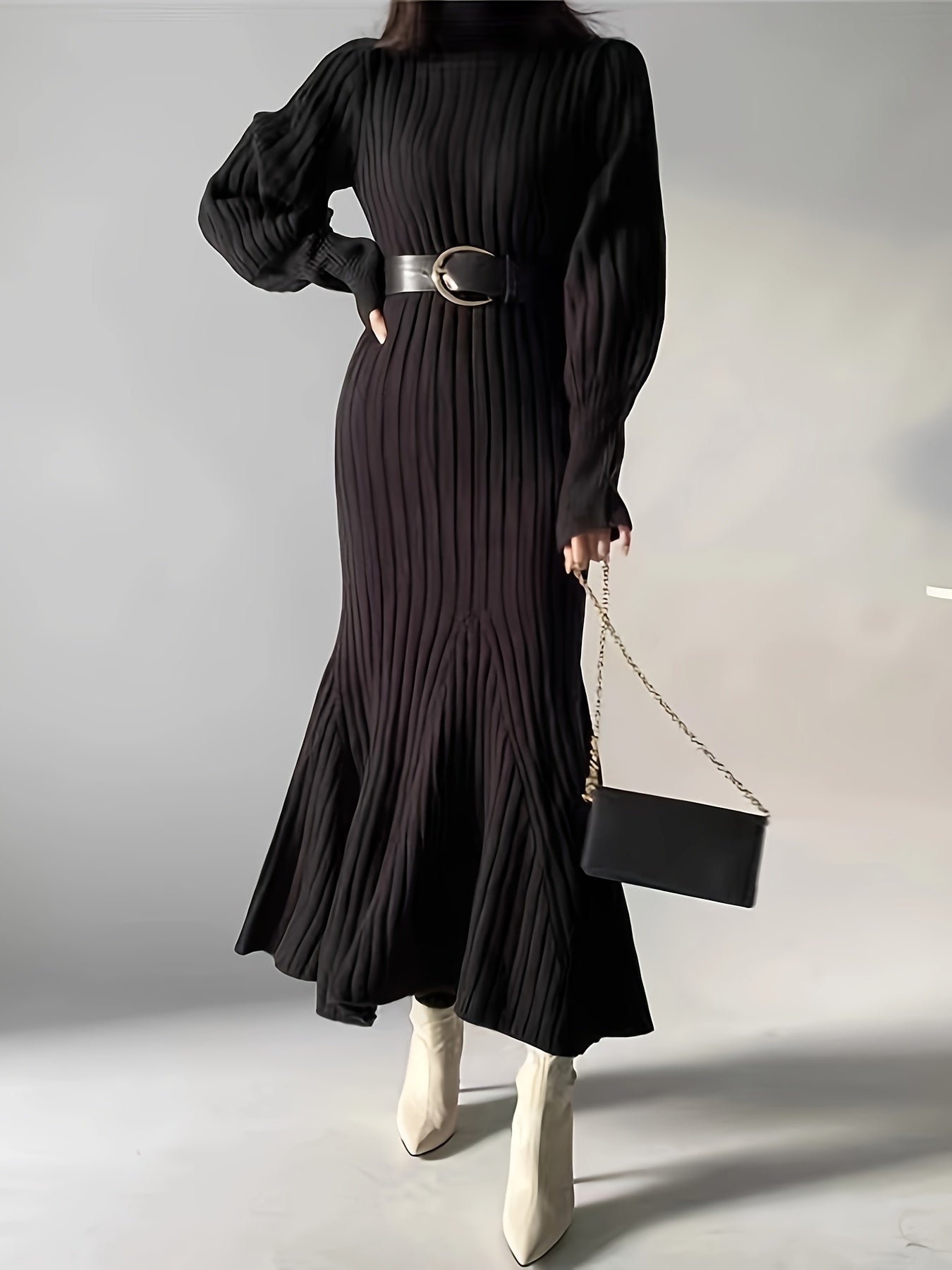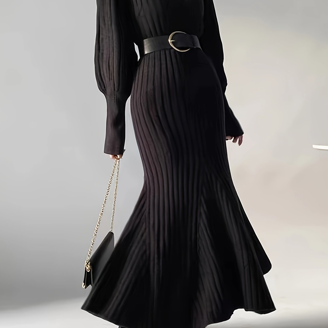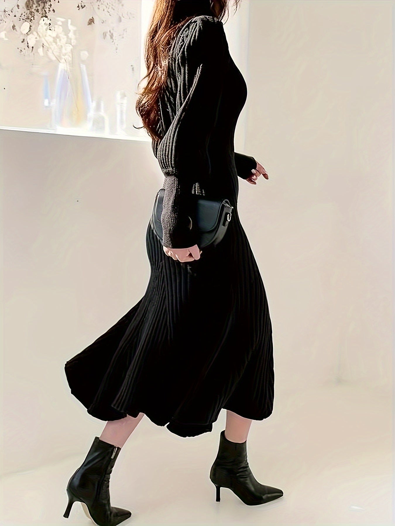 Sixsr Solid Ruffle Hem Dress, Elegant Ribbed Turtle Neck Long Sleeve Dress, Women's Clothing