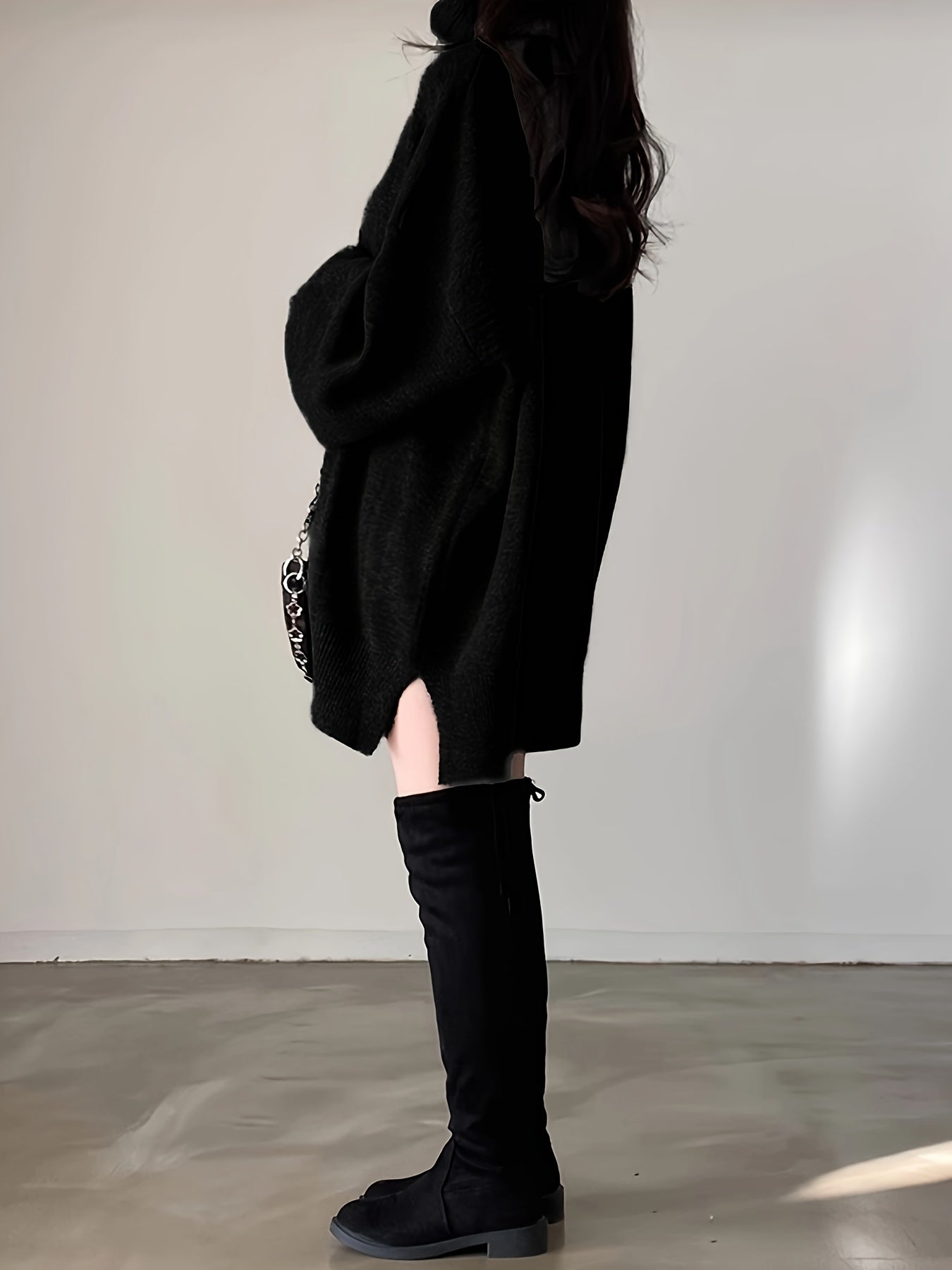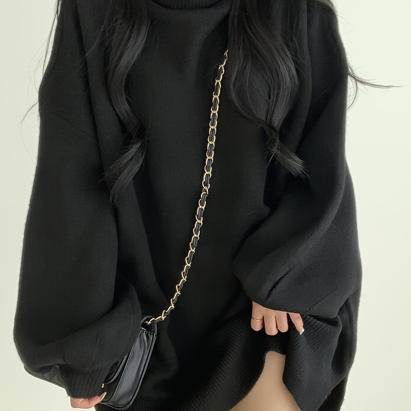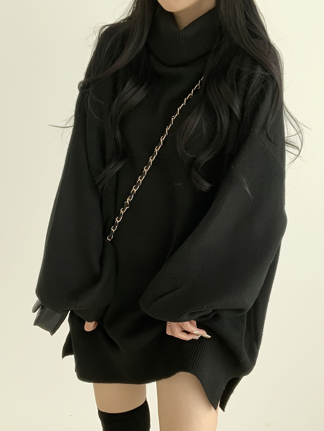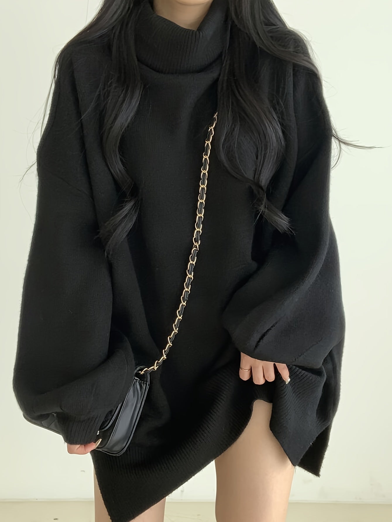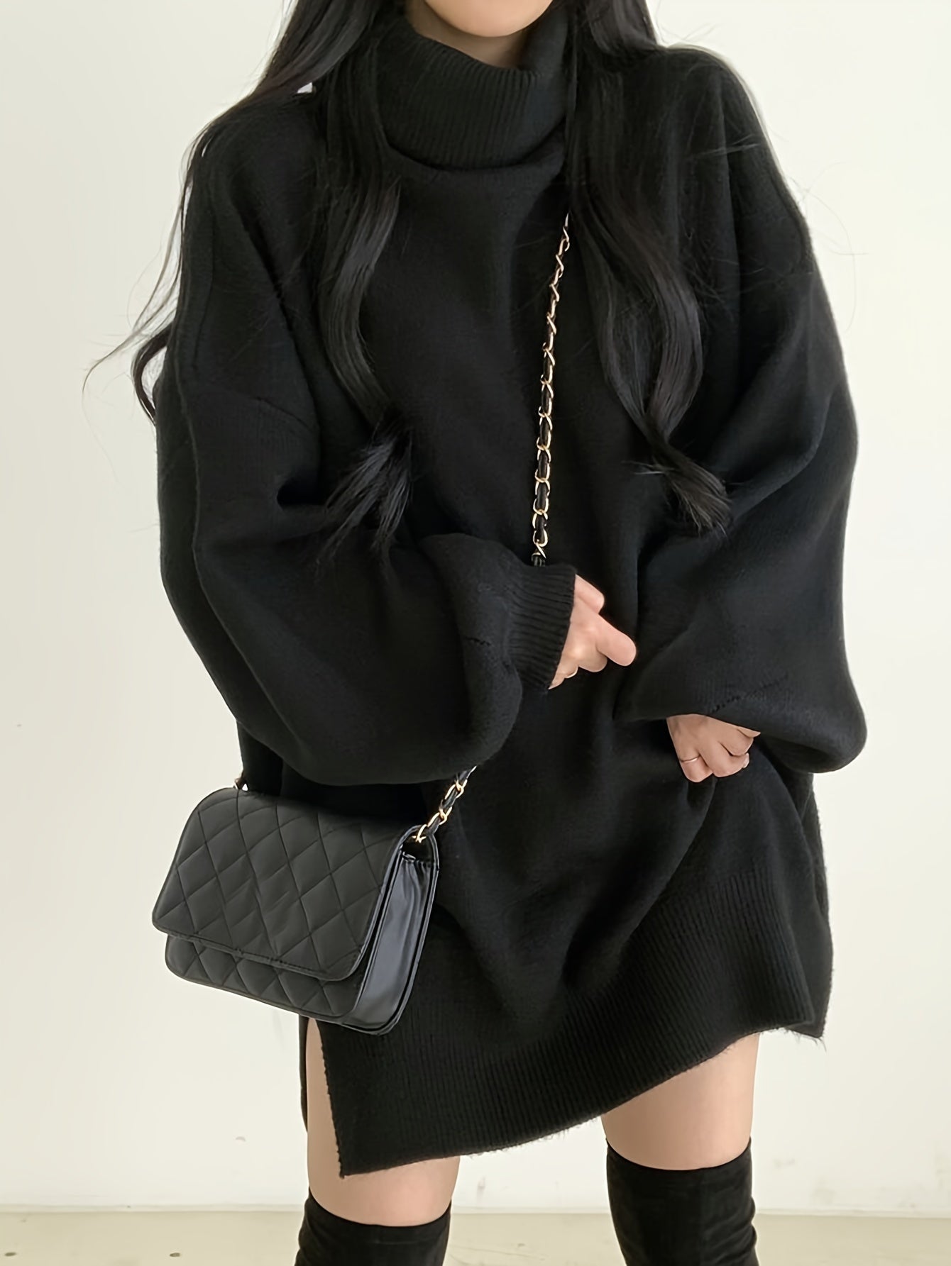 Sixsr Solid Turtle Neck Pullover Sweater, Casual Lantern Sleeve Split Oversized Sweater, Women's Clothing