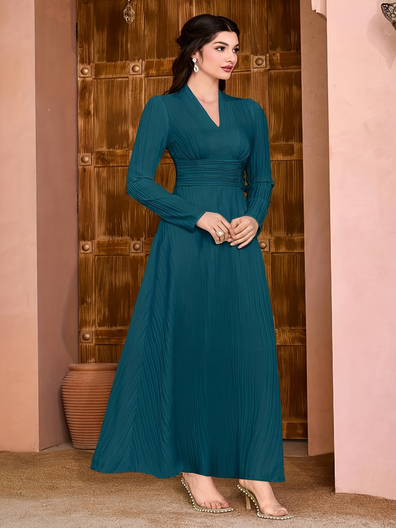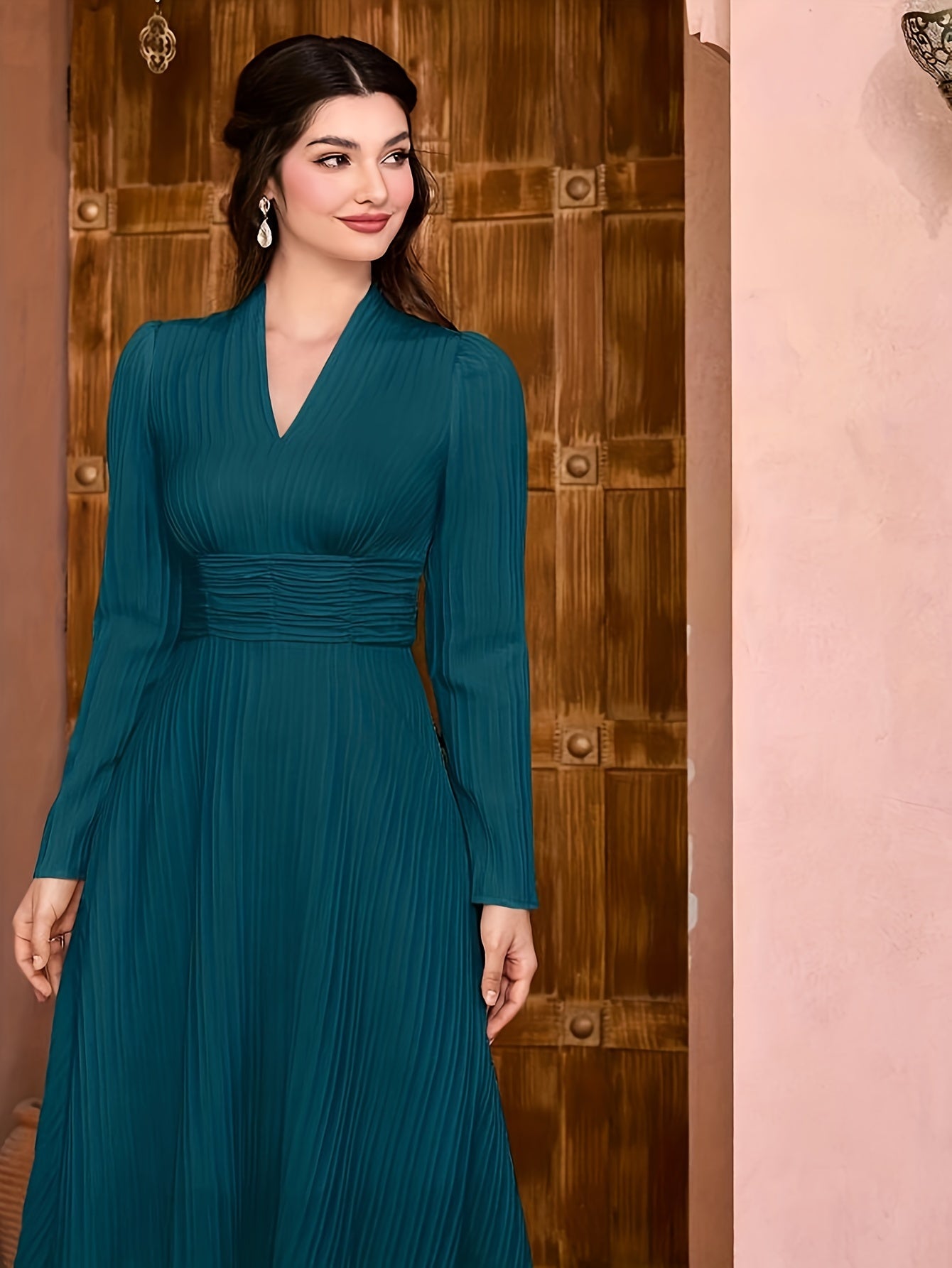 Sixsr Solid V Neck Dress, Elegant Long Sleeve Shirred Waist Dress, Women's Clothing