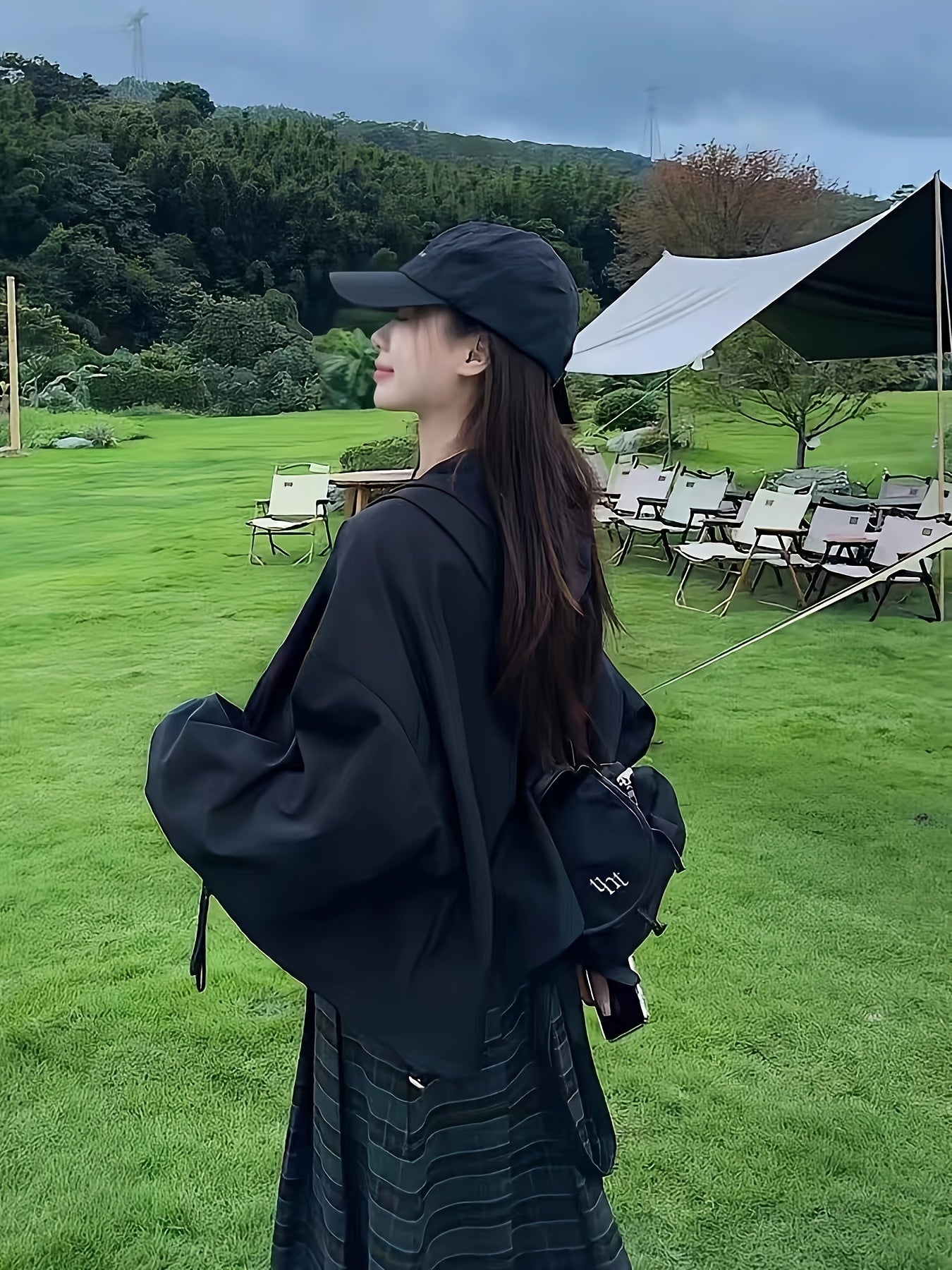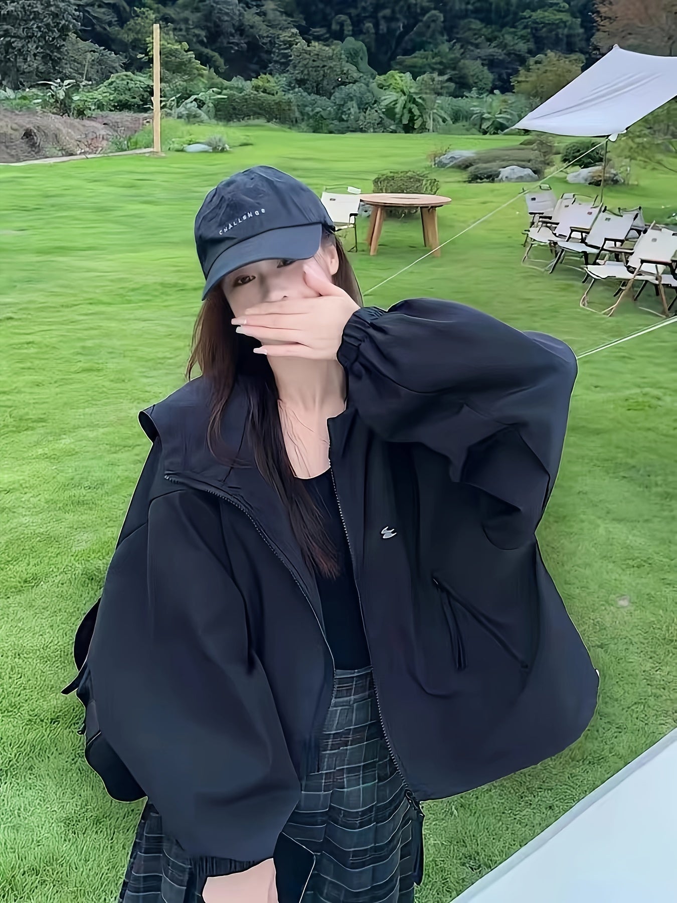 Sixsr Solid Zipper Drawstring Hooded Jacket, Casual Long Sleeve Loose Outwear For Spring & Fall, Women's Clothing