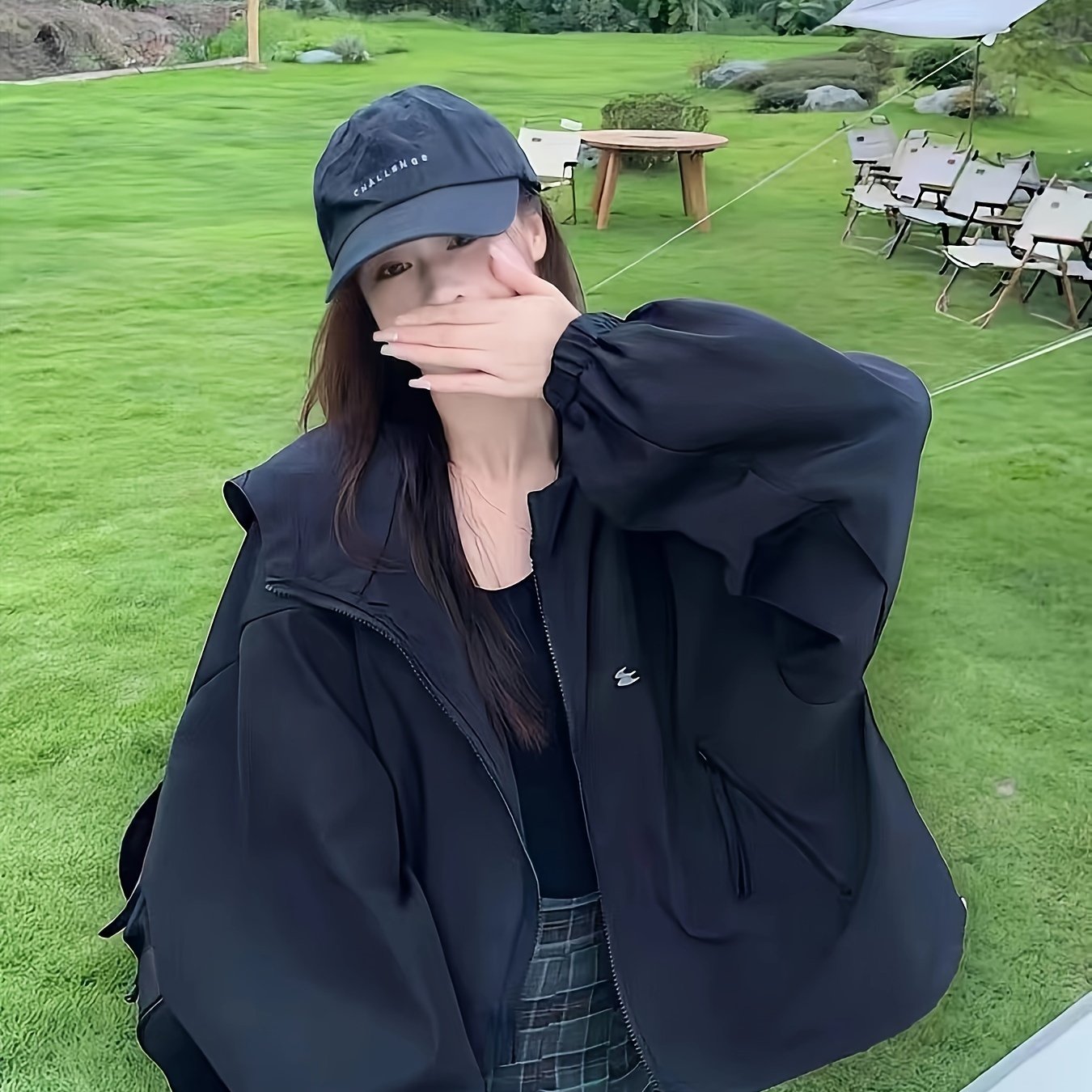 Sixsr Solid Zipper Drawstring Hooded Jacket, Casual Long Sleeve Loose Outwear For Spring & Fall, Women's Clothing