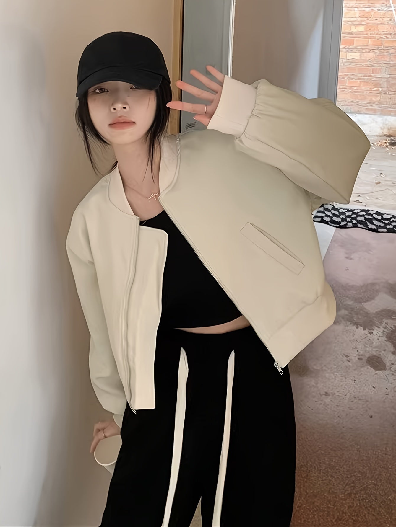 Sixsr Solid Zipper Pockets Bomber Jacket, Casual Long Sleeve Outwear For Fall & Winter, Women's Clothing