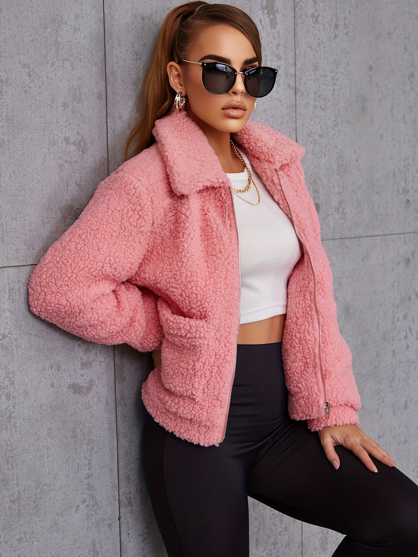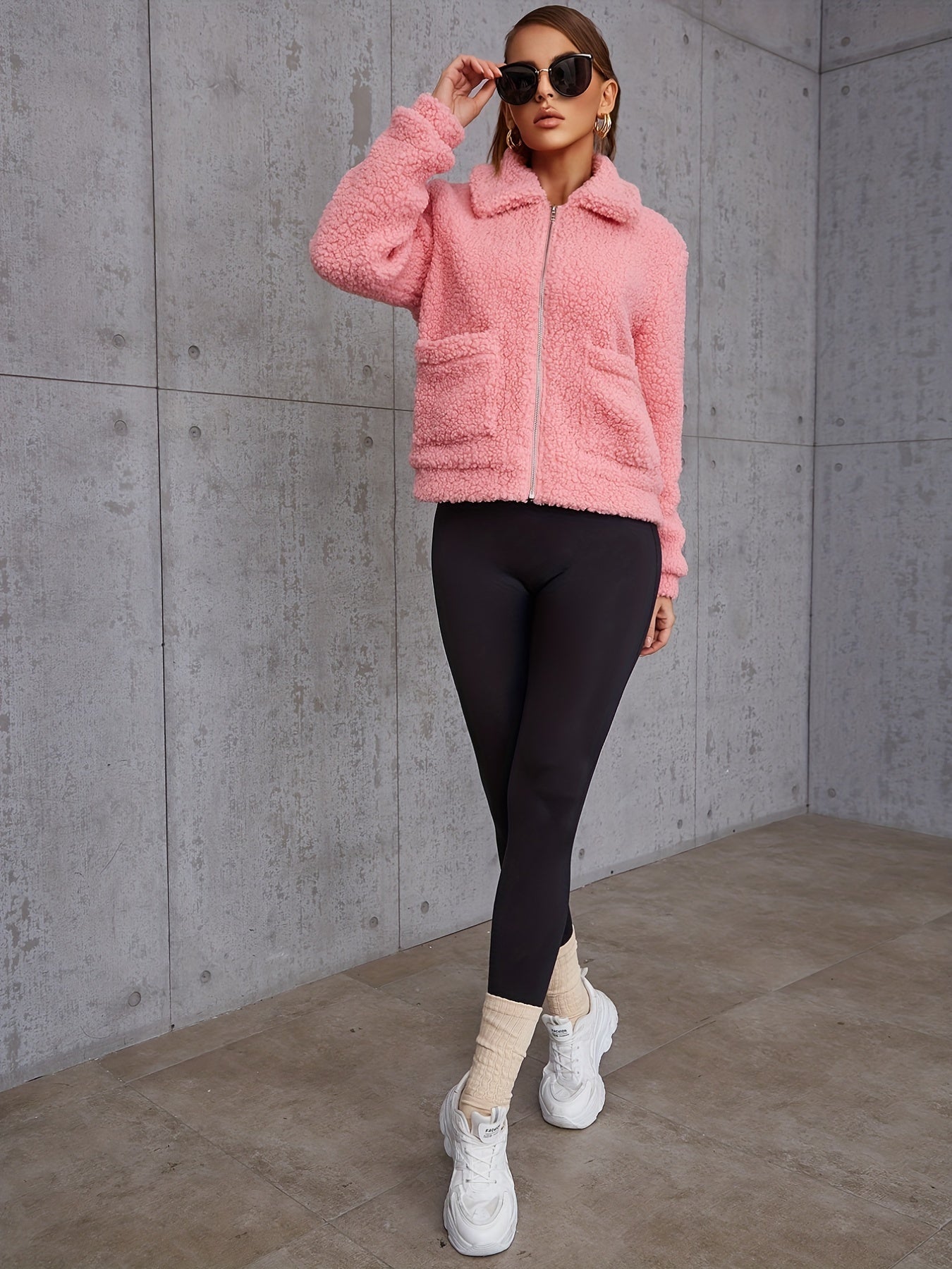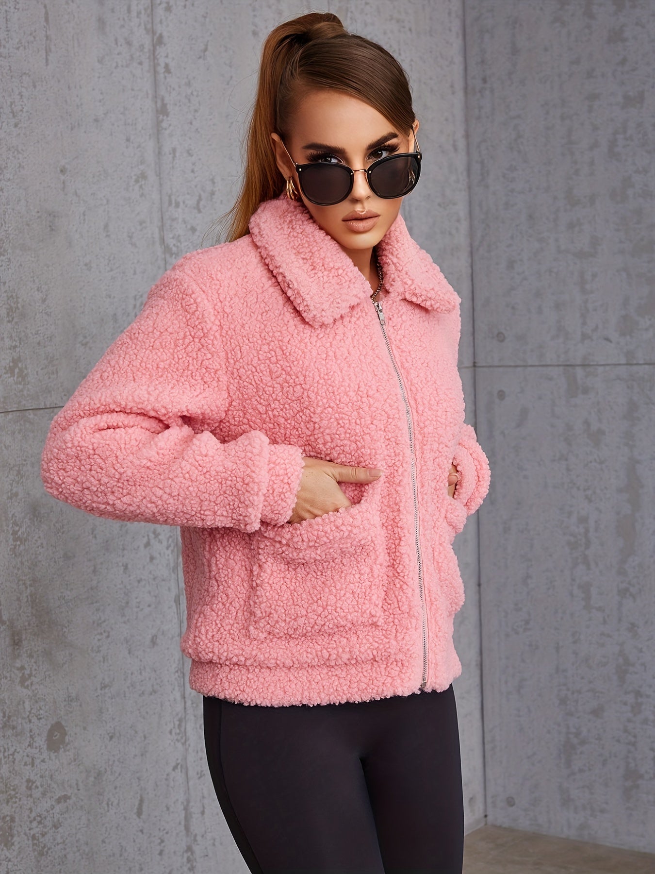 Sixsr Solid Zipper Up Lapel Neck Plush Coat, Casual Long Sleeve Outerwear For Fall & Winter, Women's Clothing