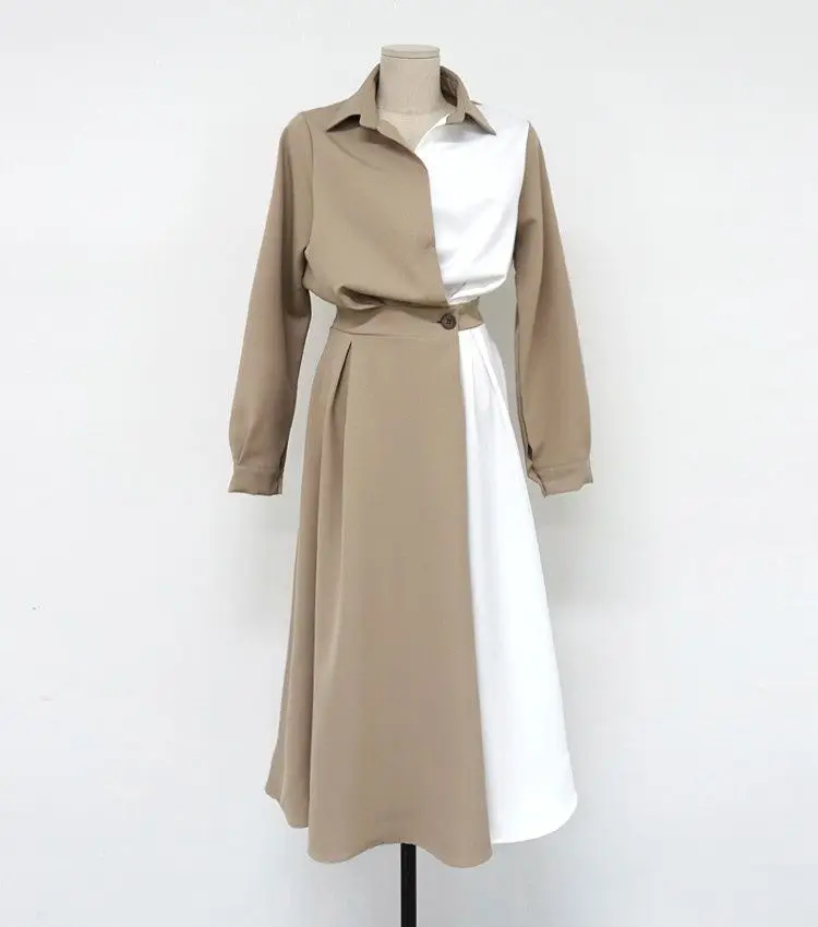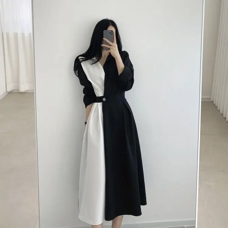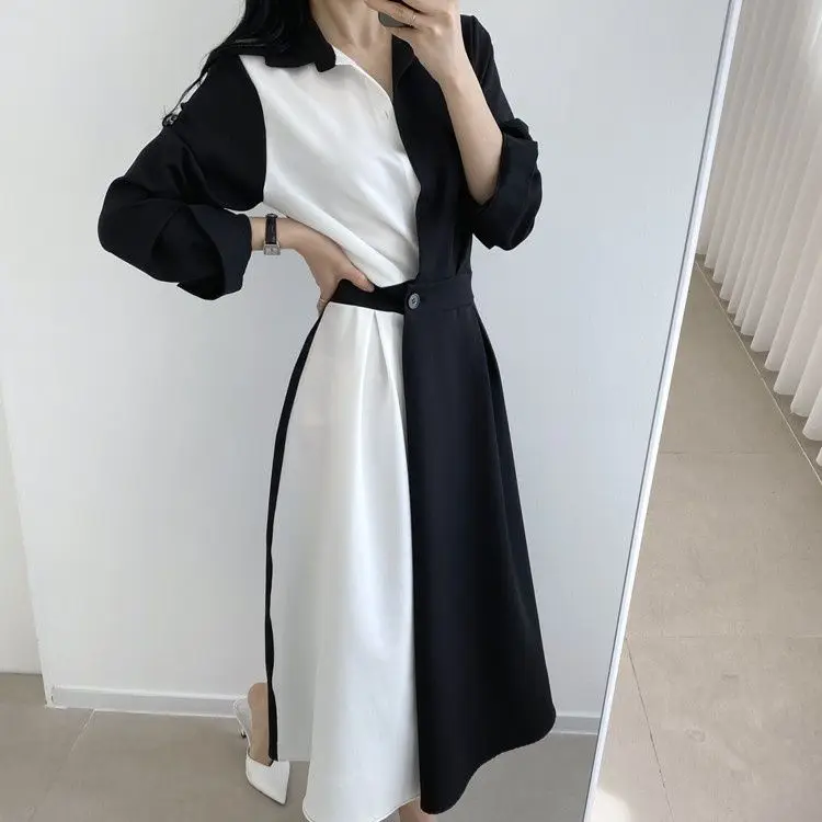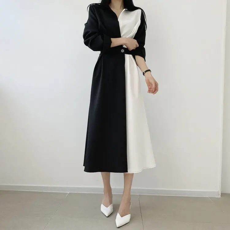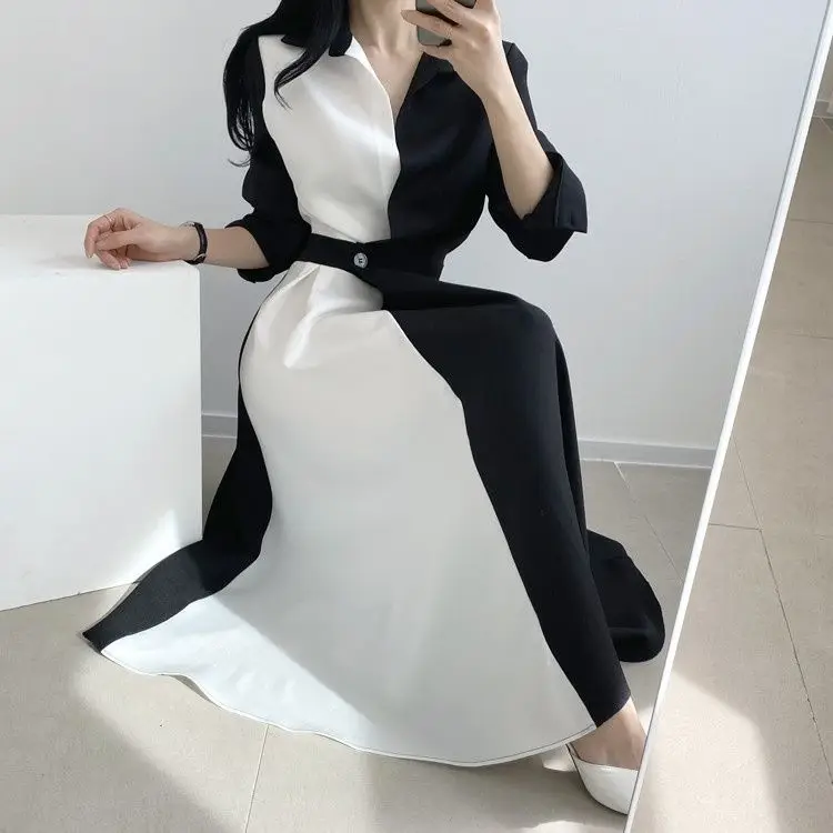 Sixsr Spring Autumn Retro Temperament Contrast Color Lapel Long-Sleeved Shirt Female Midi Dress Korean Elegant Fashion Slim Chic Dress