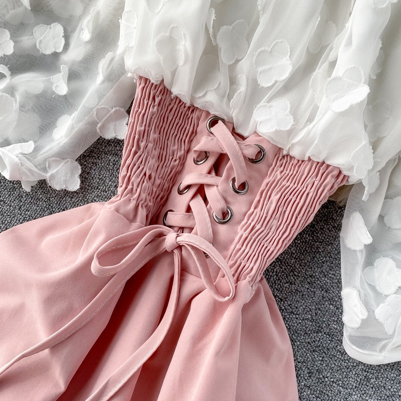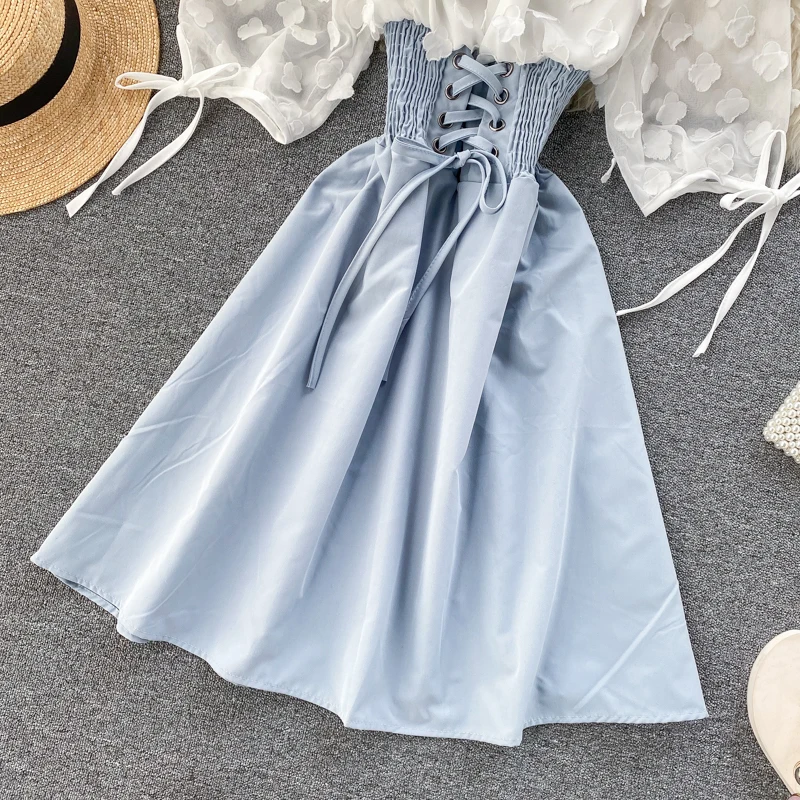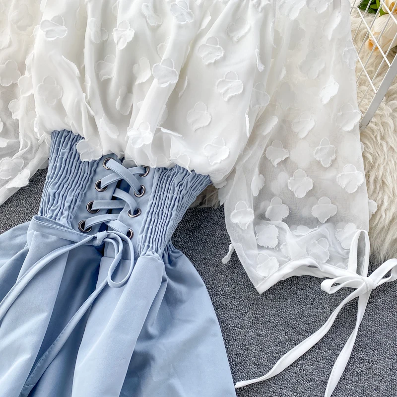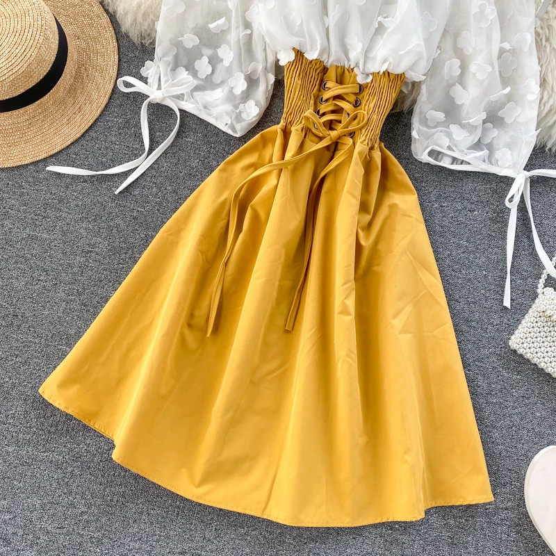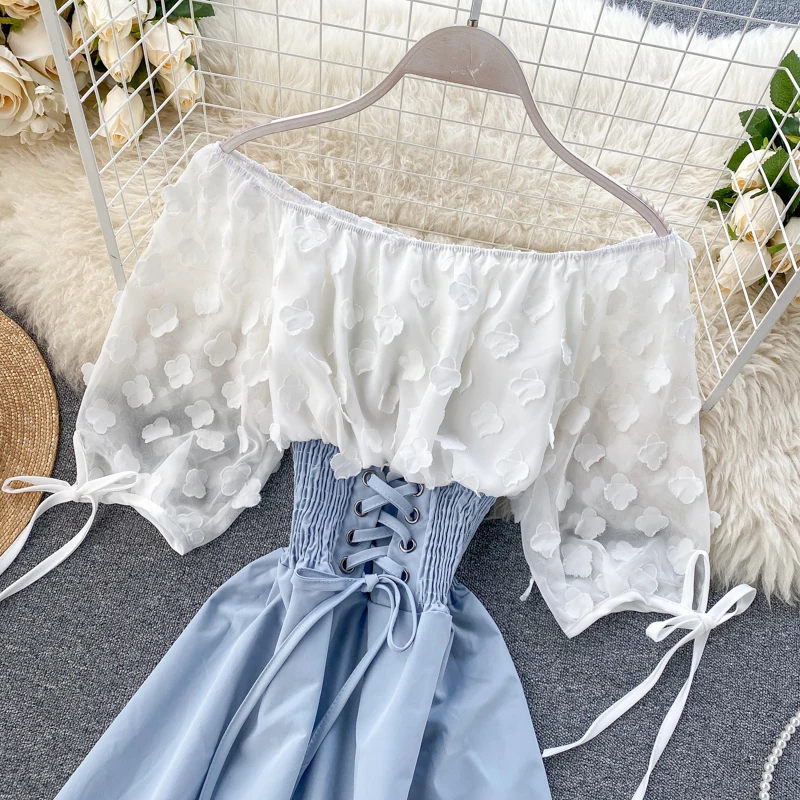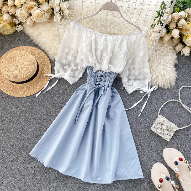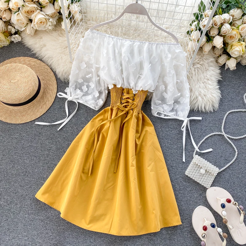 Sixsr Spring Outfits Sexy Off Shoulder patchwork Summer Short Dress Party flower chiffon Slim waist lace up Women casual A-Line beach dress