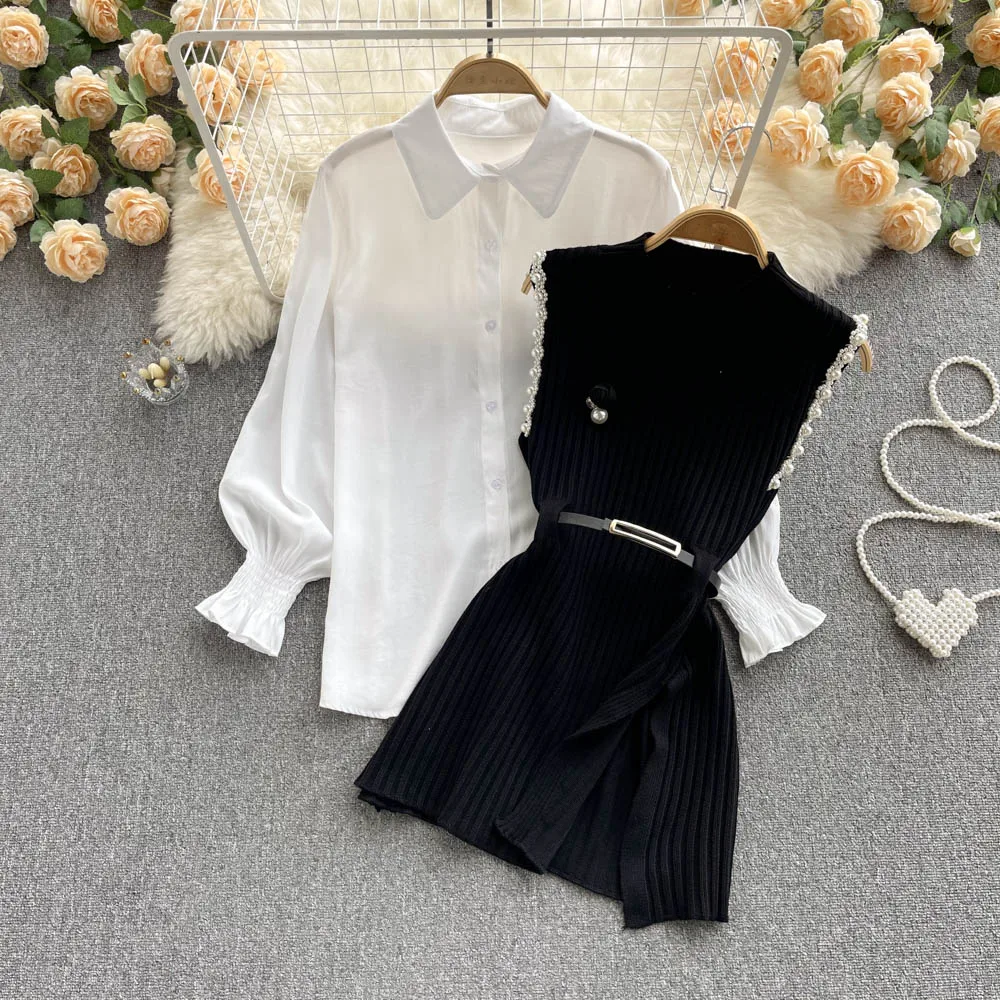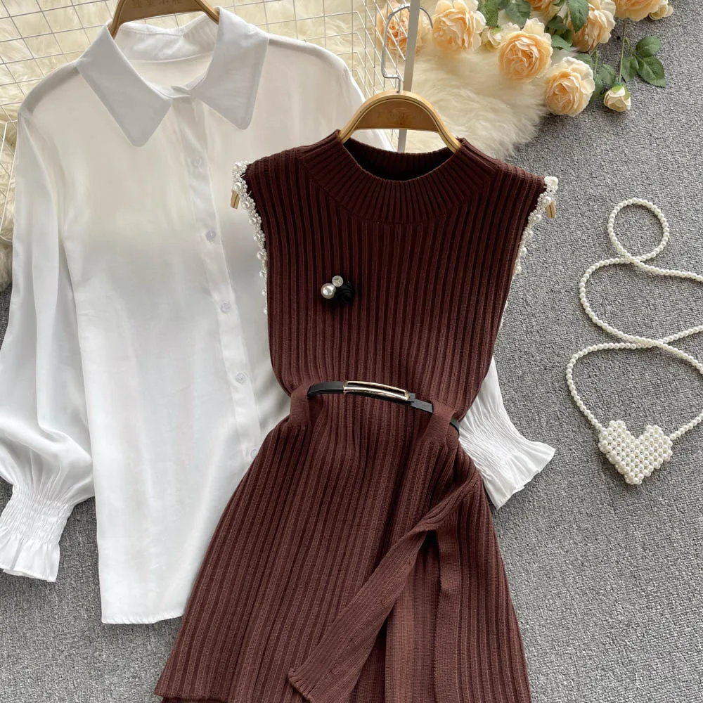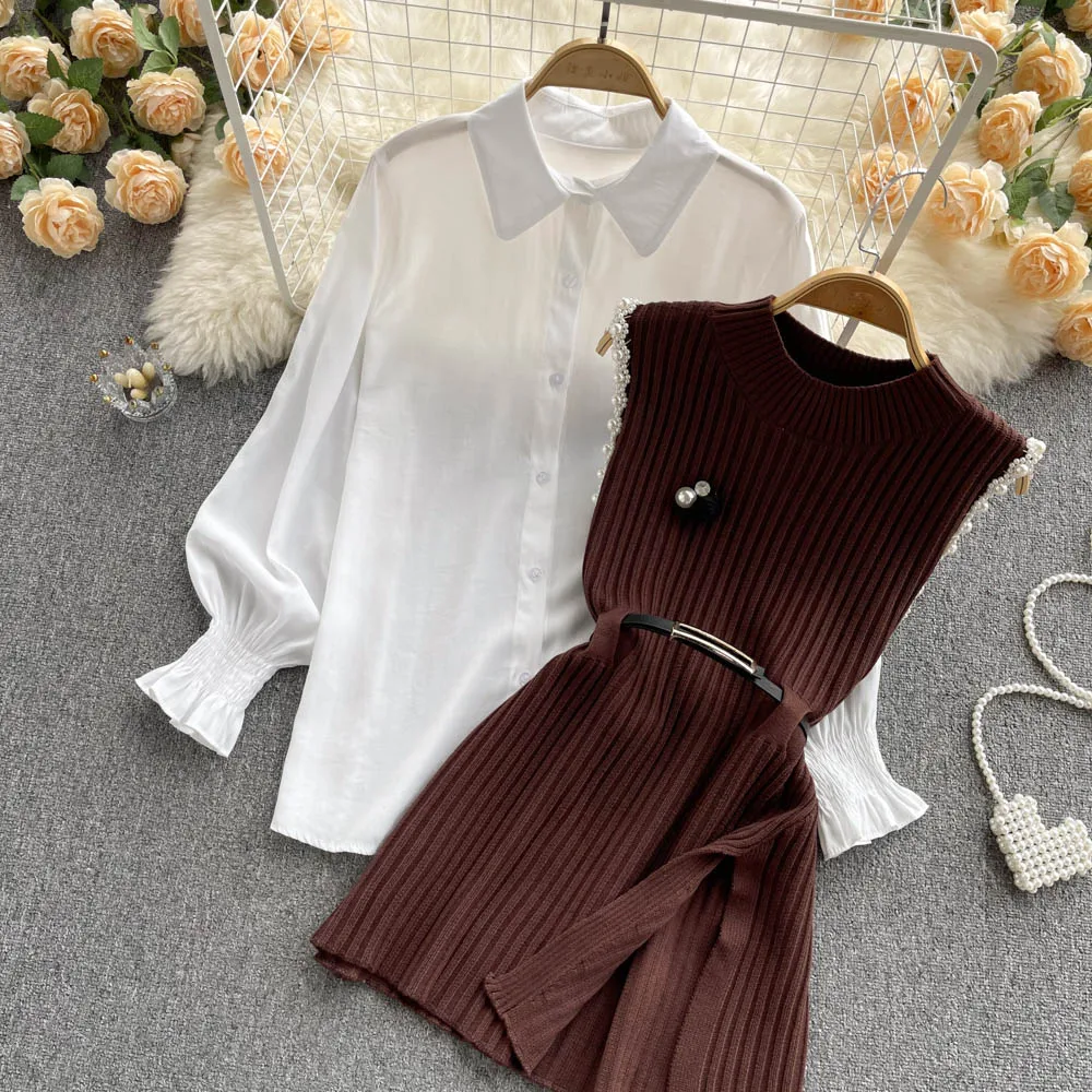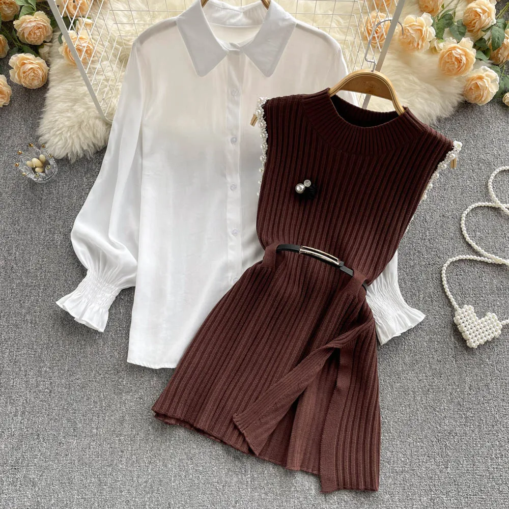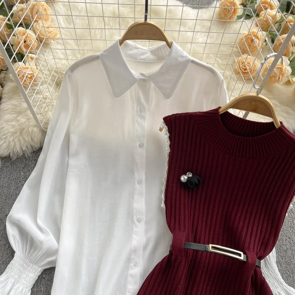 Sixsr Spring Outfits Women Sleeve White Shirt Fashion Two Piece Suit Red Cotton Sweater Vest Lady Casual Preppy Style White Belt
