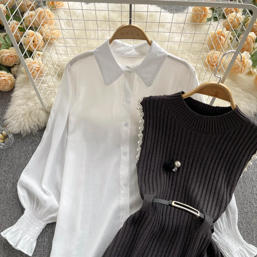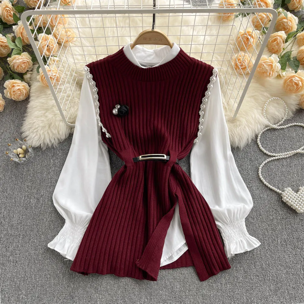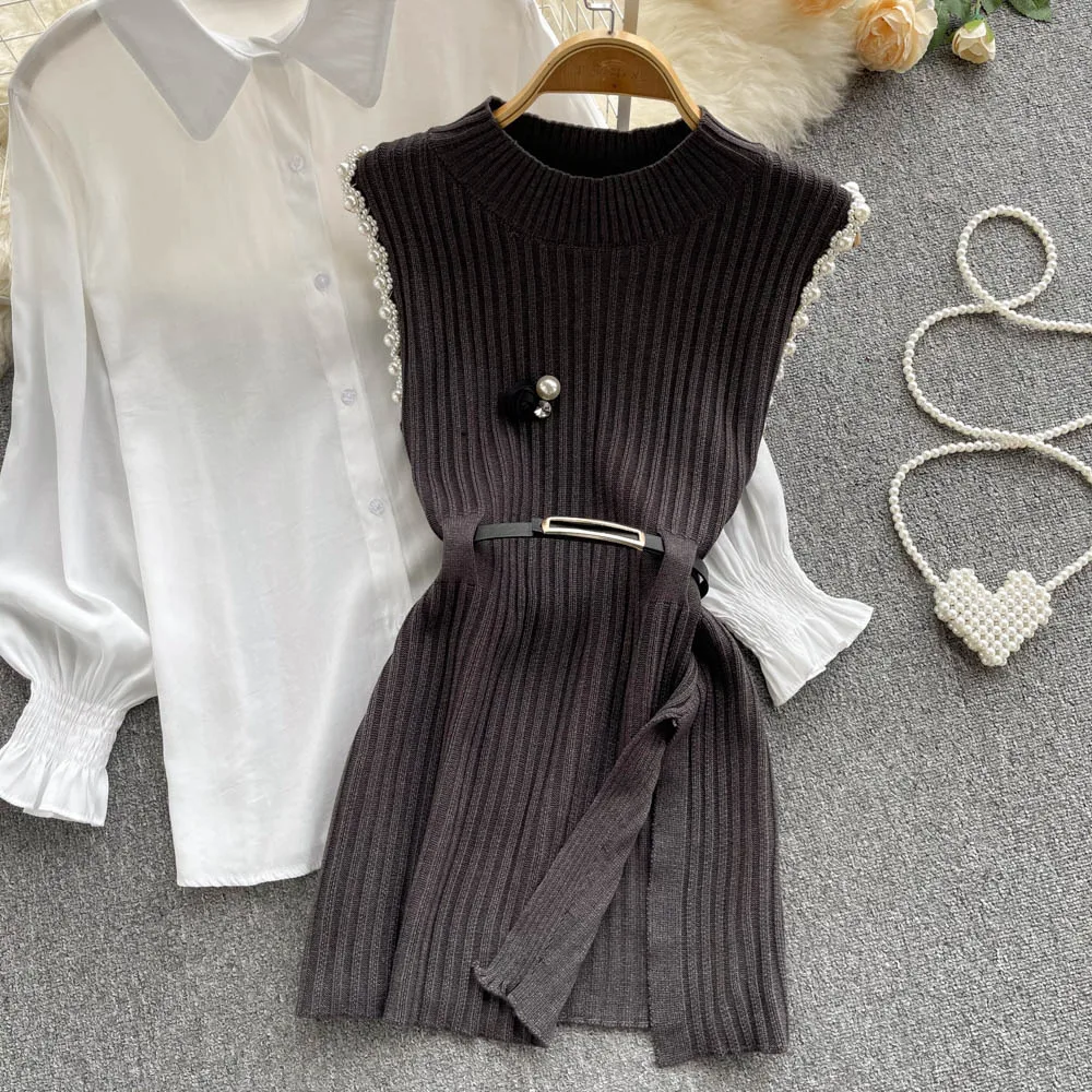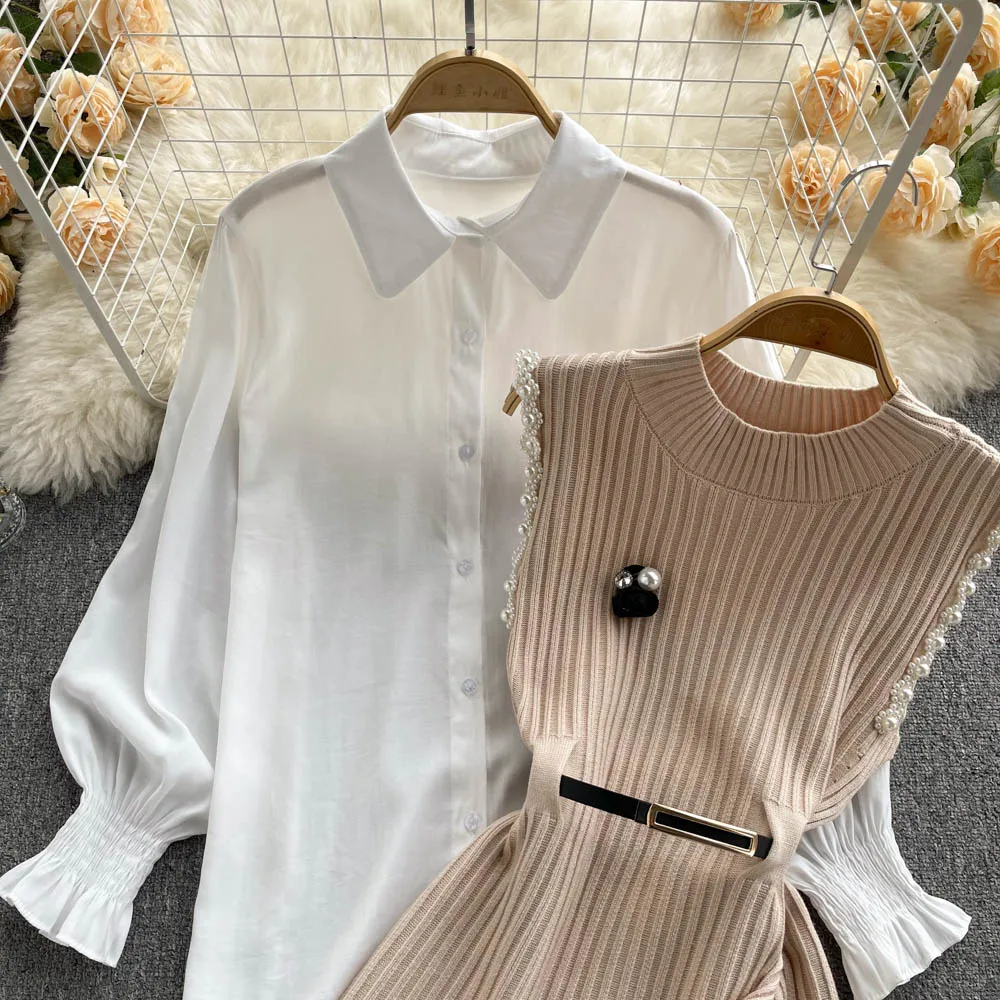 Sixsr Spring Outfits Women Sleeve White Shirt Fashion Two Piece Suit Red Cotton Sweater Vest Lady Casual Preppy Style White Belt