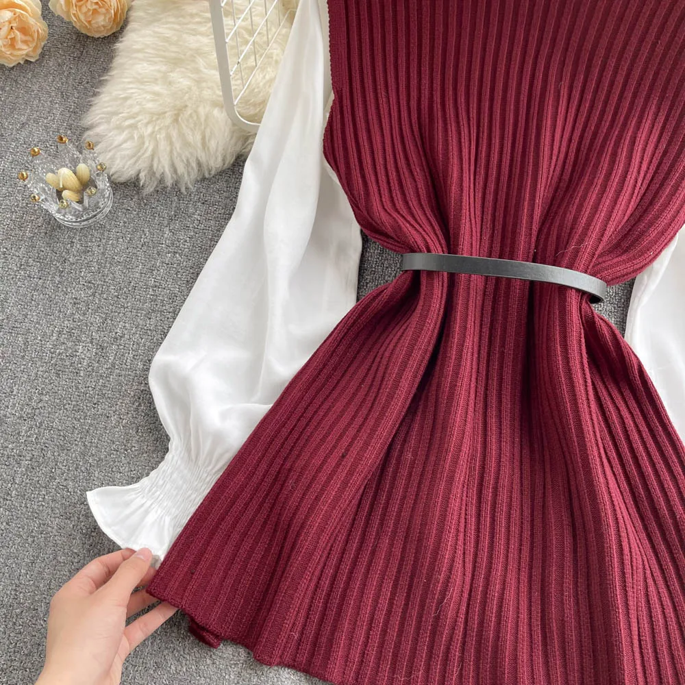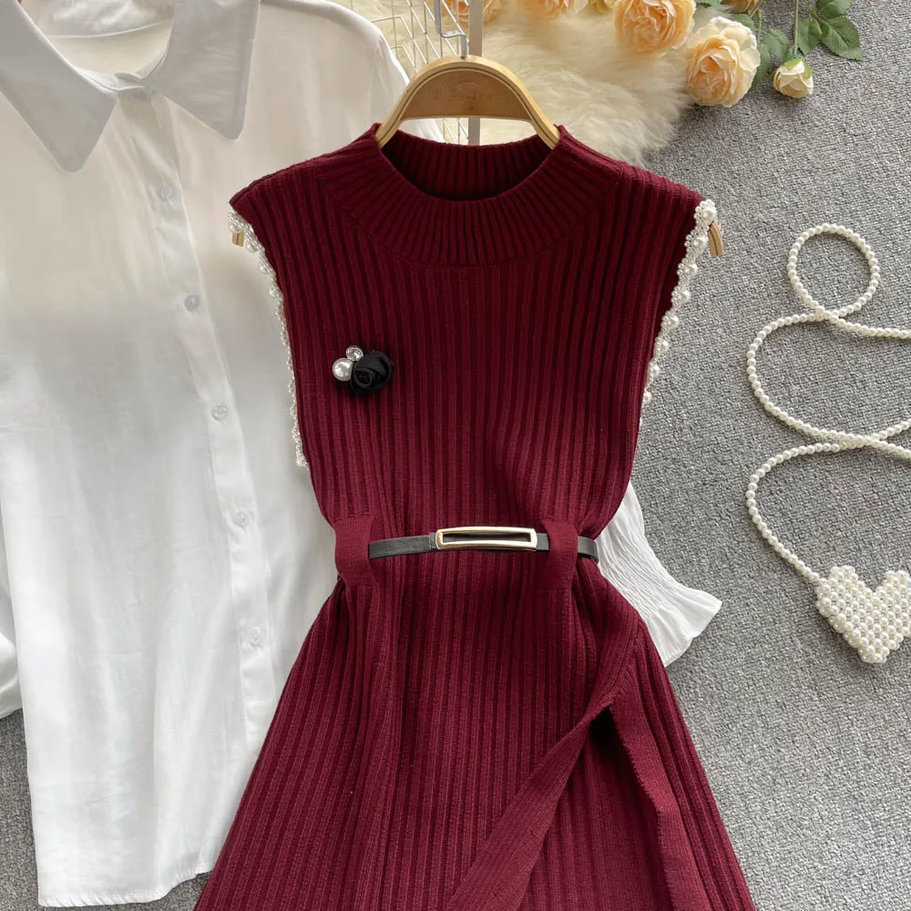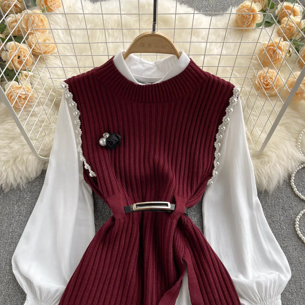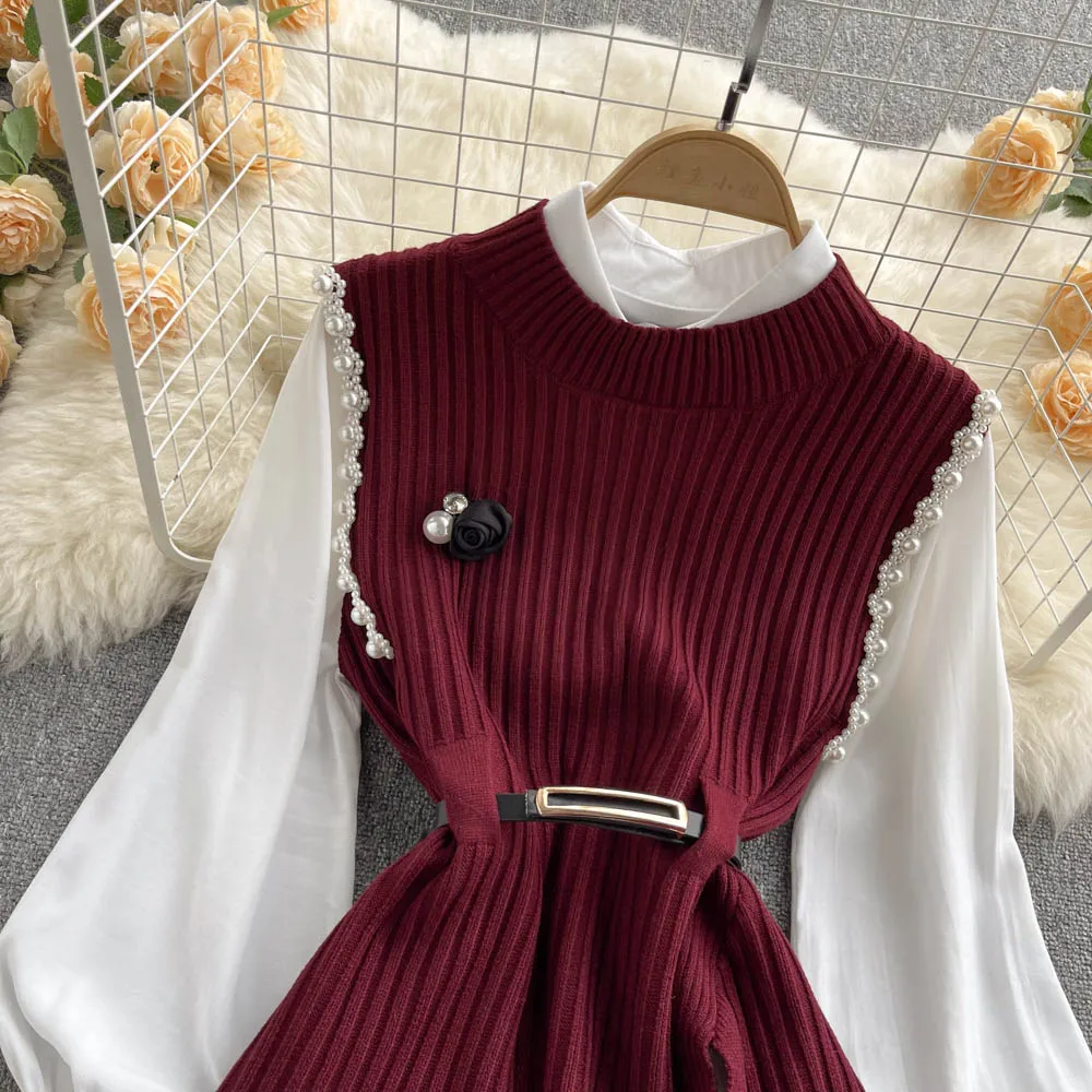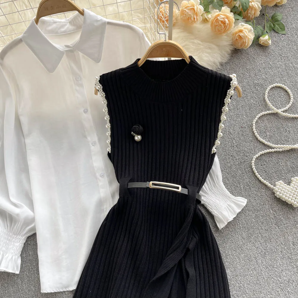 Sixsr Spring Outfits Women Sleeve White Shirt Fashion Two Piece Suit Red Cotton Sweater Vest Lady Casual Preppy Style White Belt