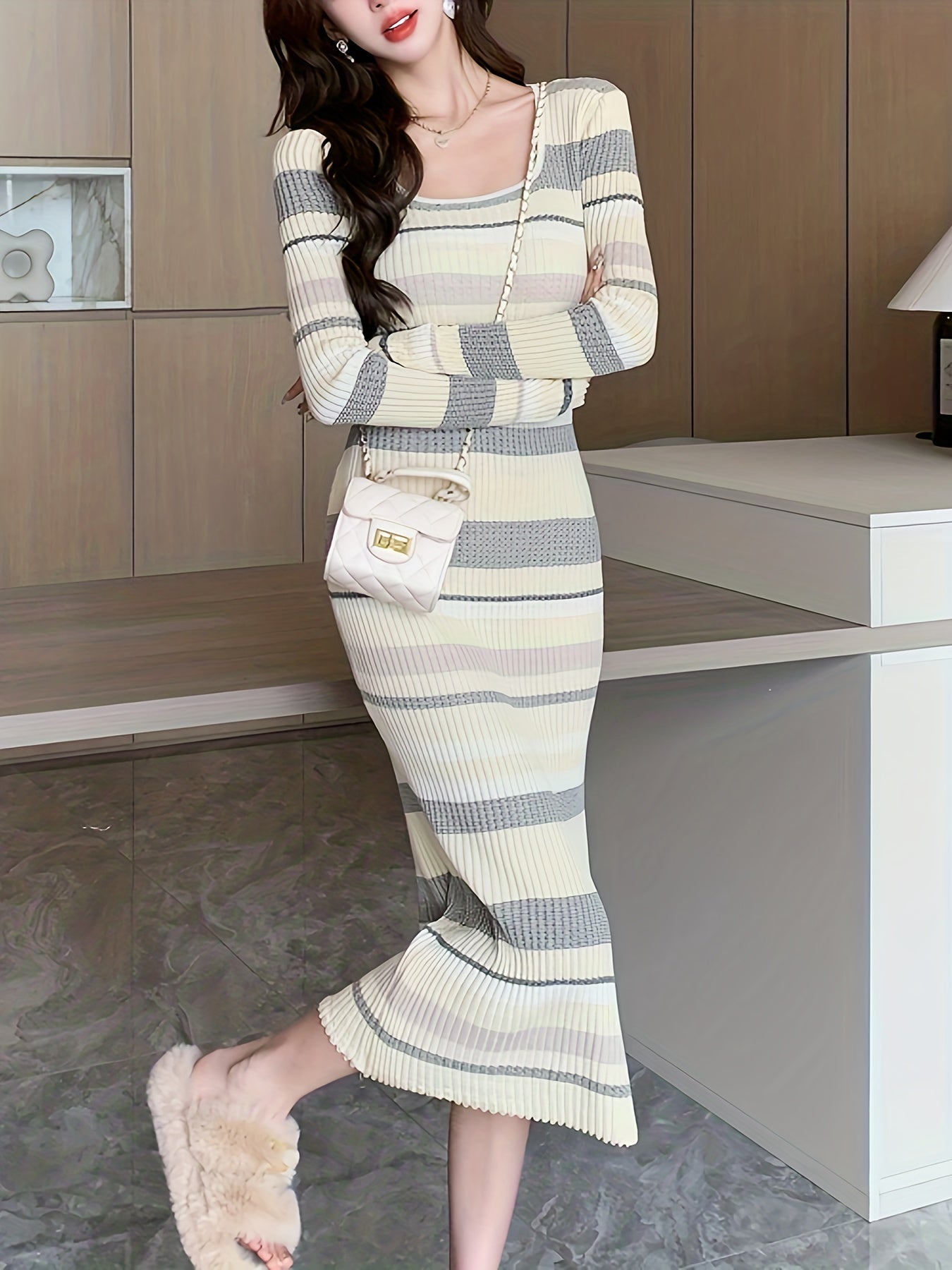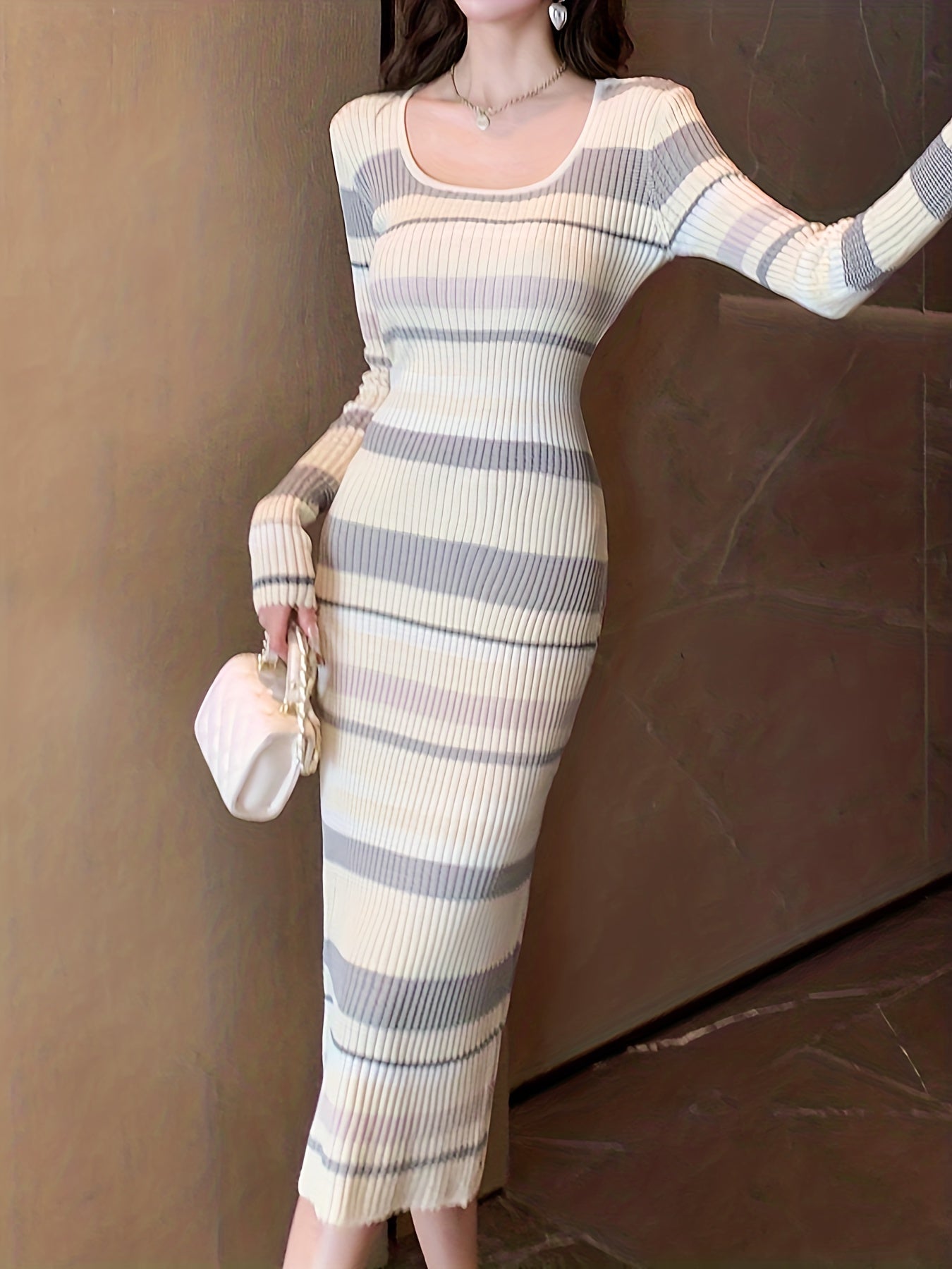 Sixsr Striped Bodycon Midi Dress, Elegant Scoop Neck Long Sleeve Dress, Women's Clothing