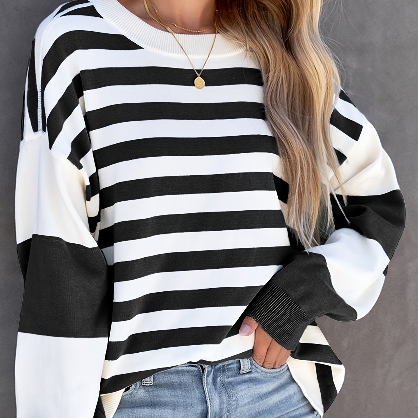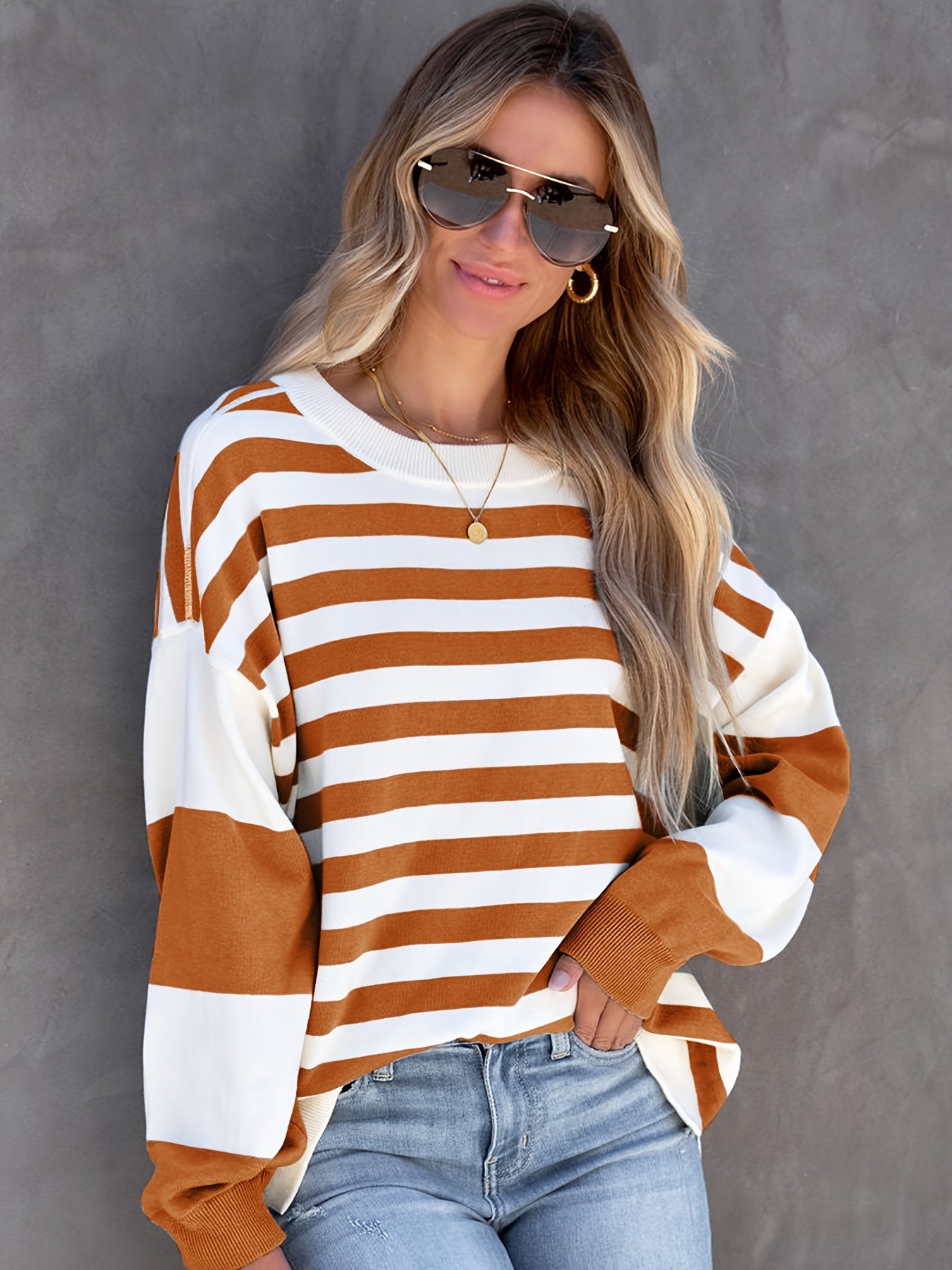 Sixsr Striped Drop Shoulder Pullover, Crew Neck Long Sleeve Sweatshirt For Fall & Winter, Women's Clothing