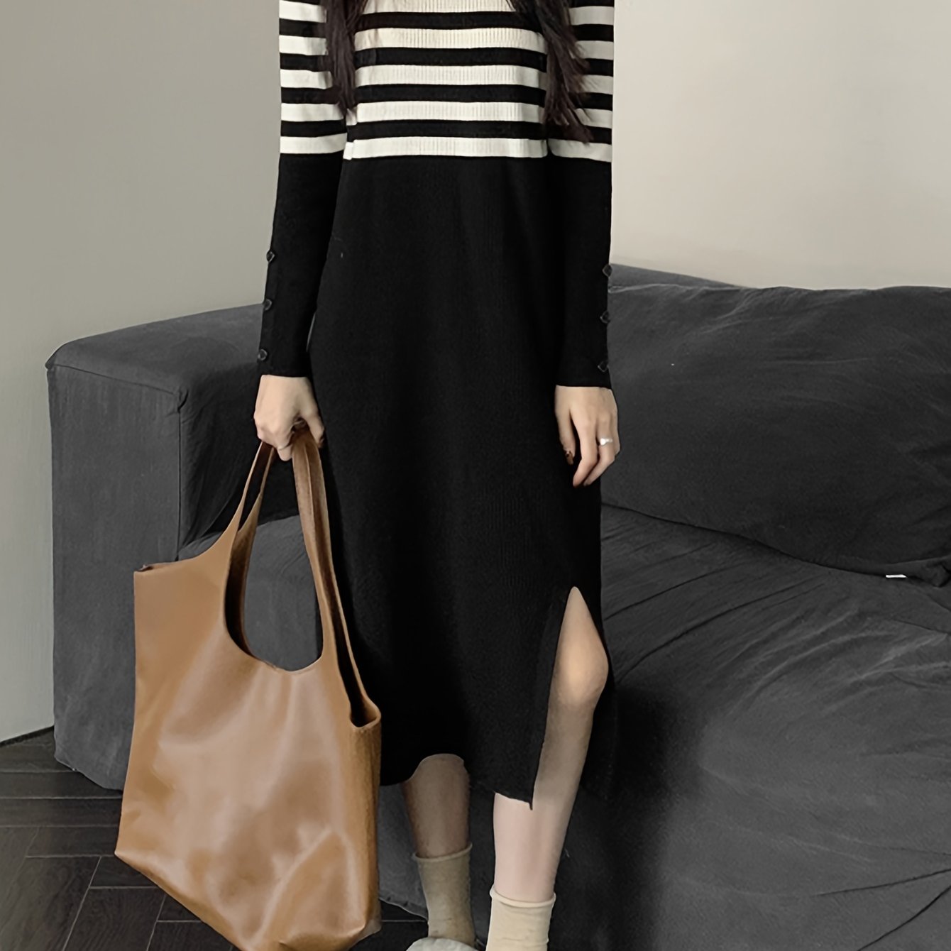 Sixsr Striped Pattern Split Hem Dress, Casual Long Sleeve Dress For Spring & Fall, Women's Clothing