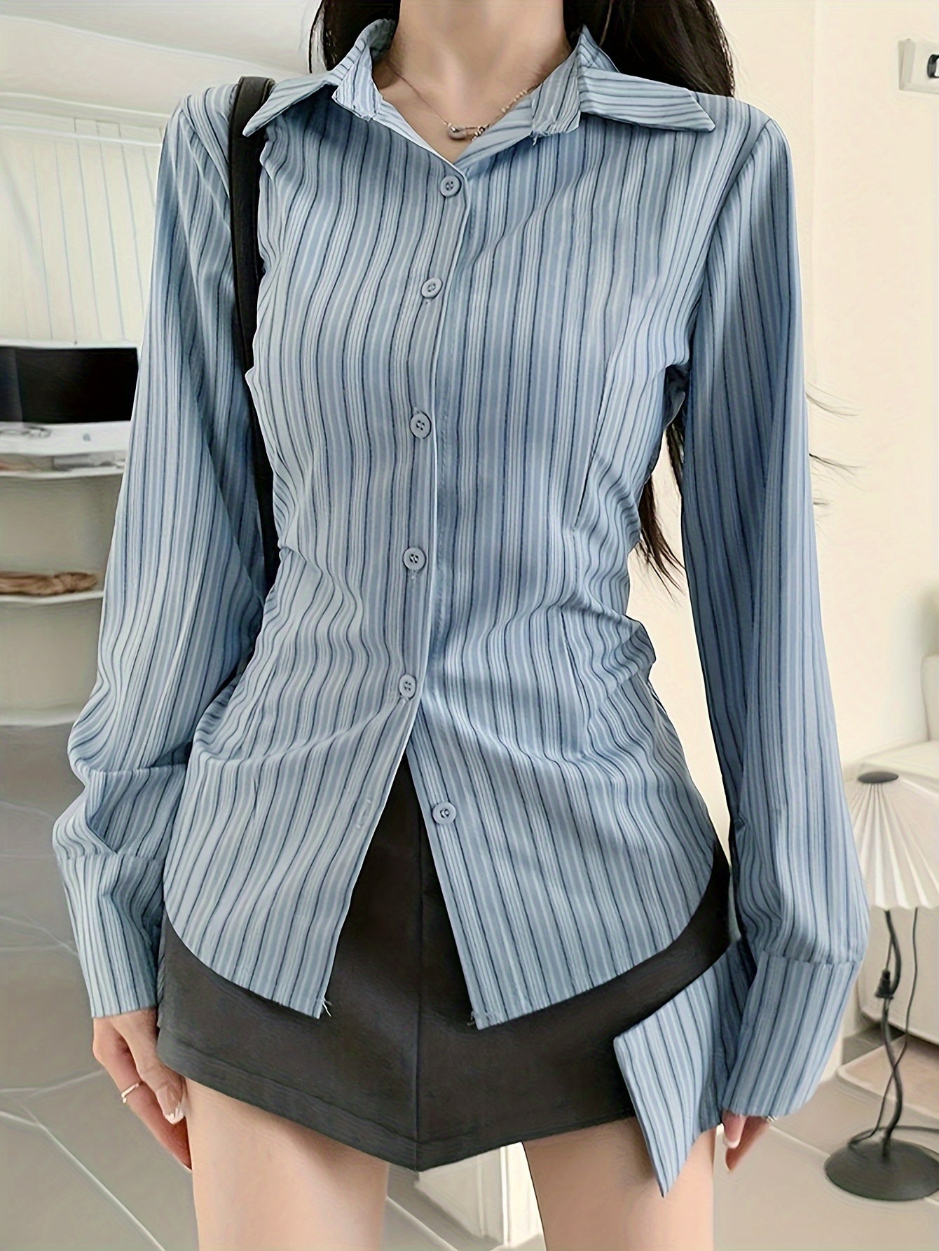 Sixsr Striped Print Button Front Shirt, Casual Long Sleeve Shirt For Spring & Fall, Women's Clothing