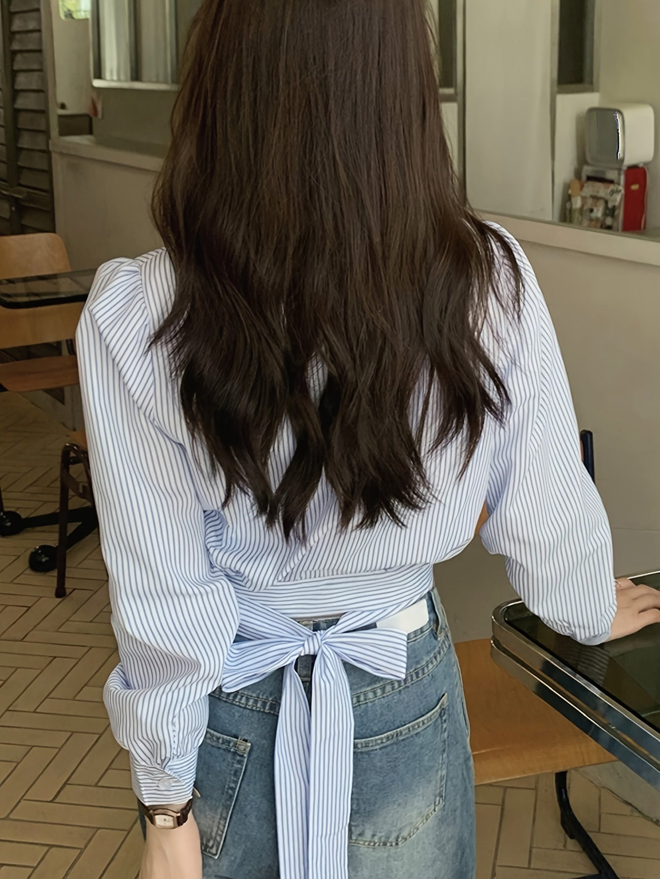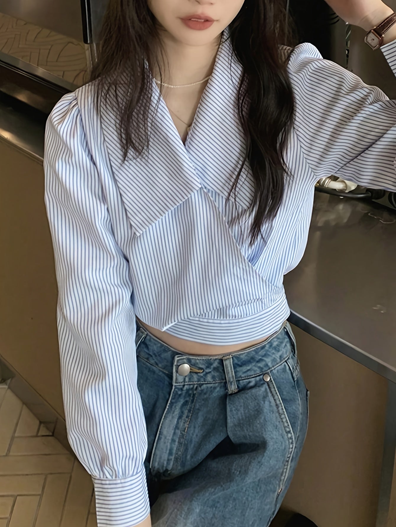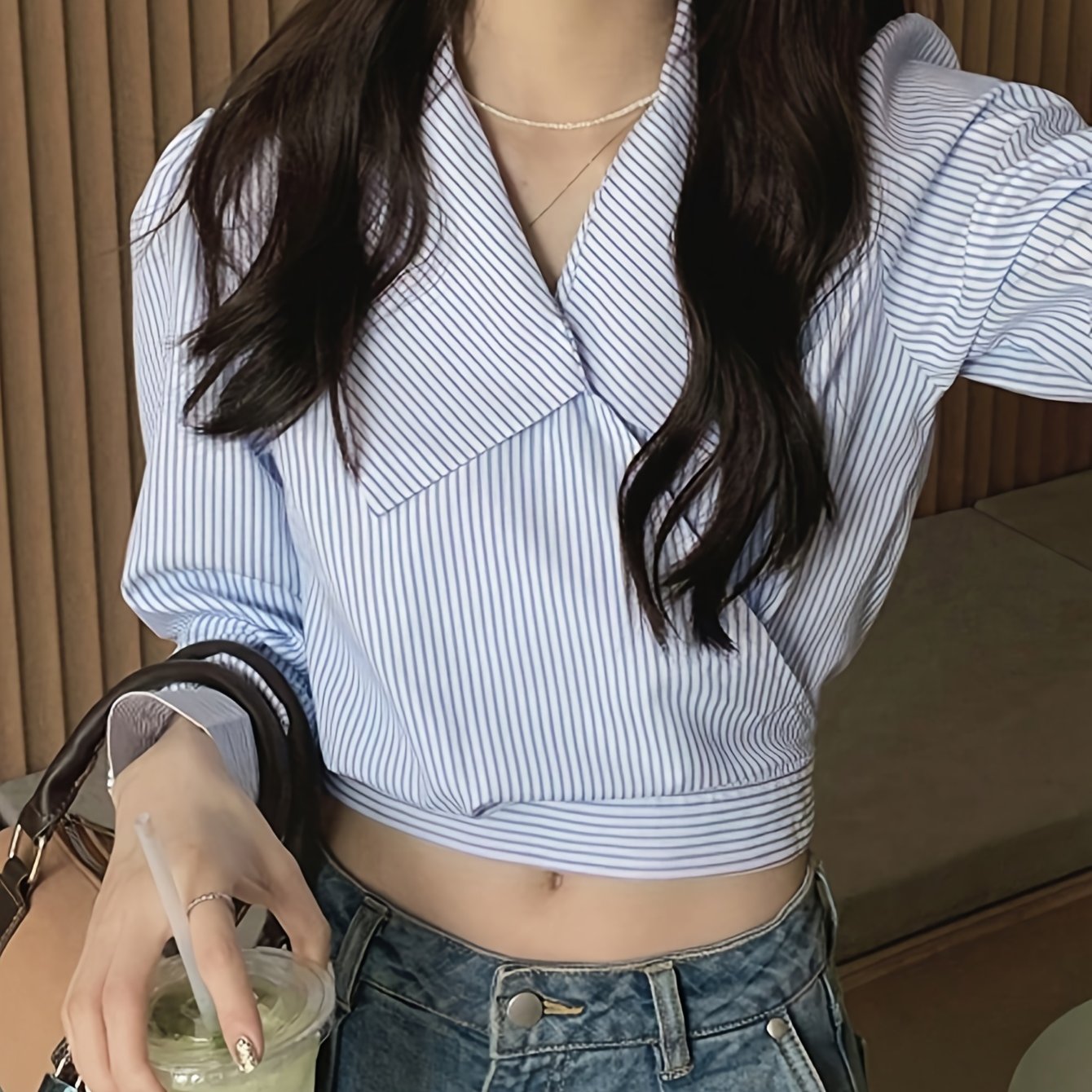 Sixsr Striped Print Lapel V-neck Crop Blouse, Casual Tie Back Long Sleeve Blouse For Spring & Fall, Women's Clothing