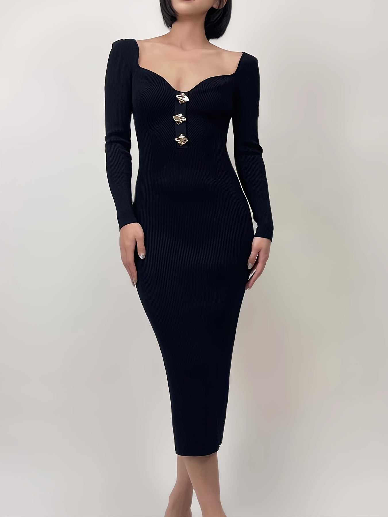 Sixsr Stylish Button Bodycon Knit Dress, Elegant Long Sleeve V Neck Midi Dress, Women's Clothing