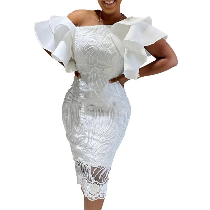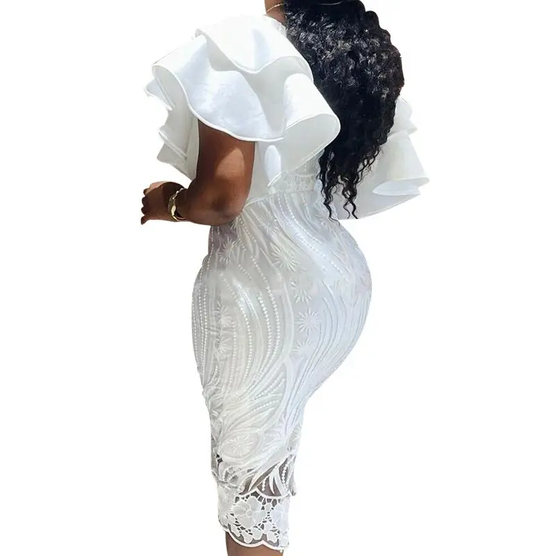 sixsr Summer Fashion Midi Dress Elegant Evening Party White Dresses for Women Classy Prom High-waist Lace Ruffle Female Clothing