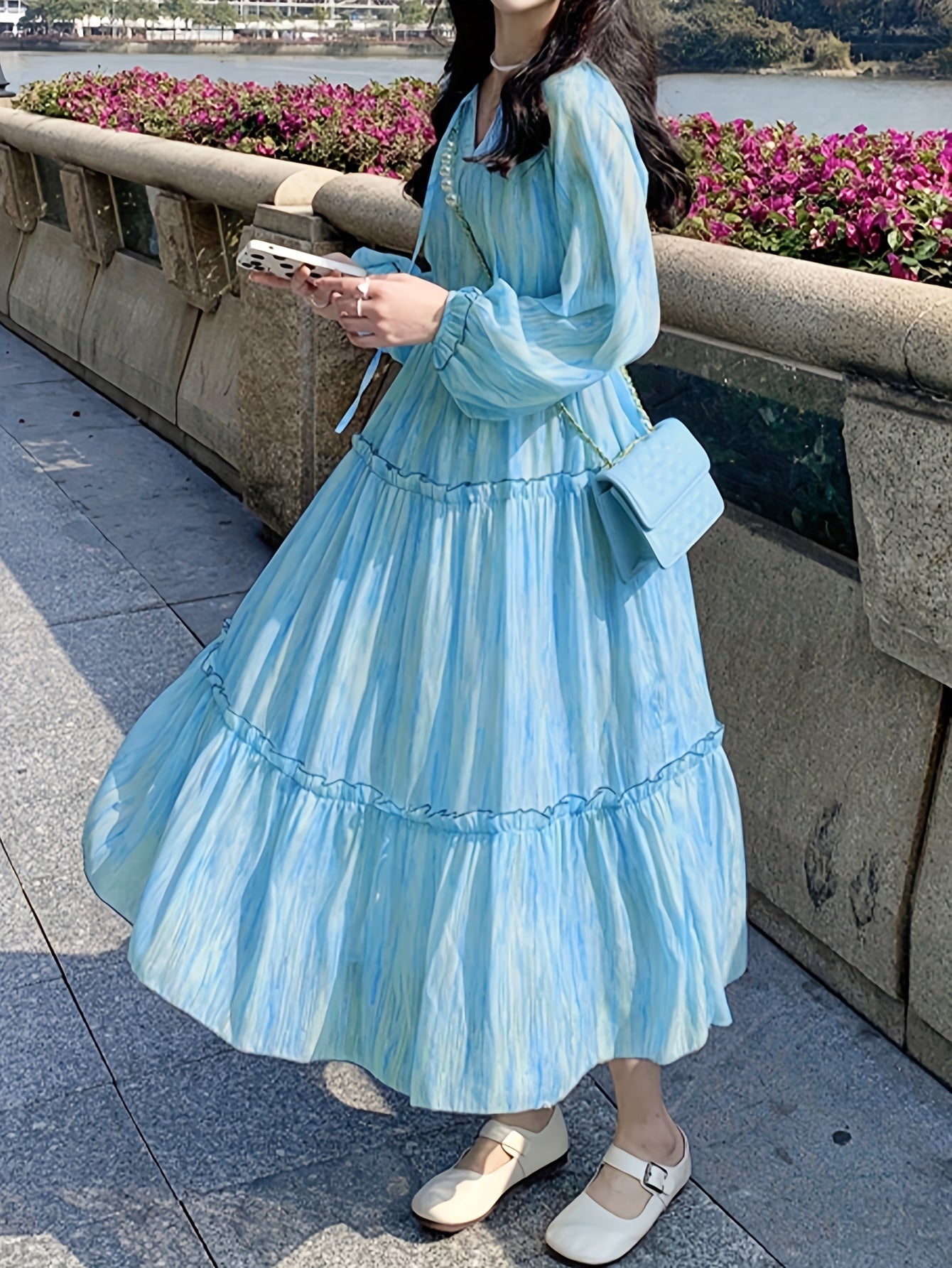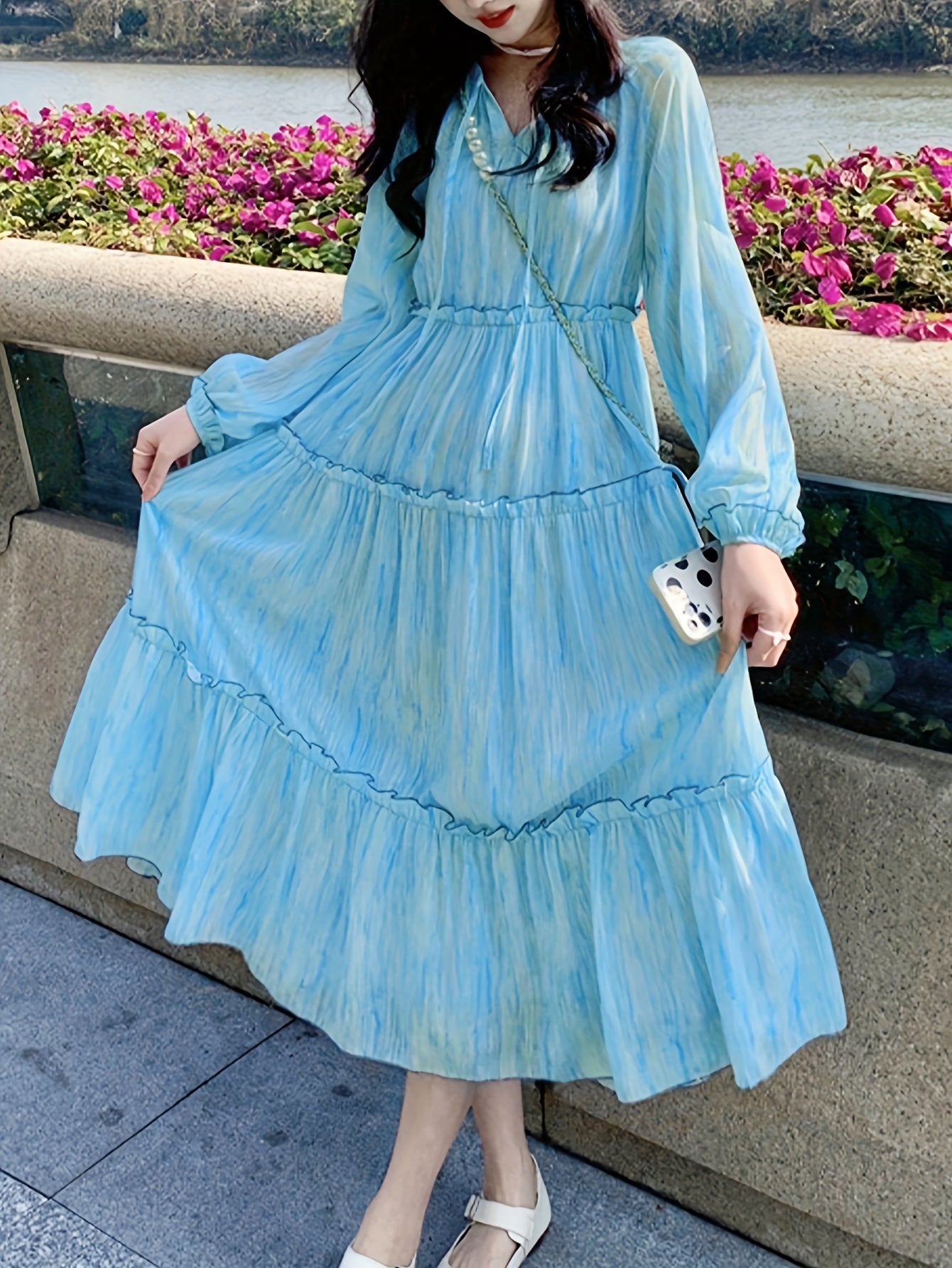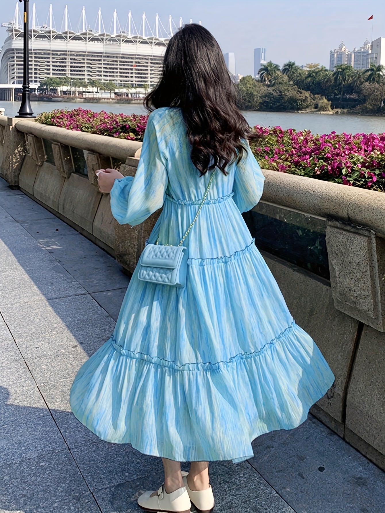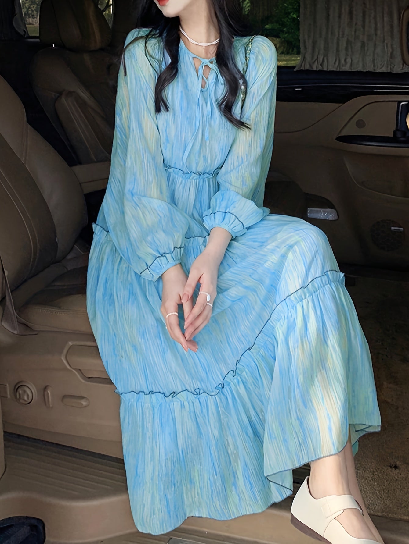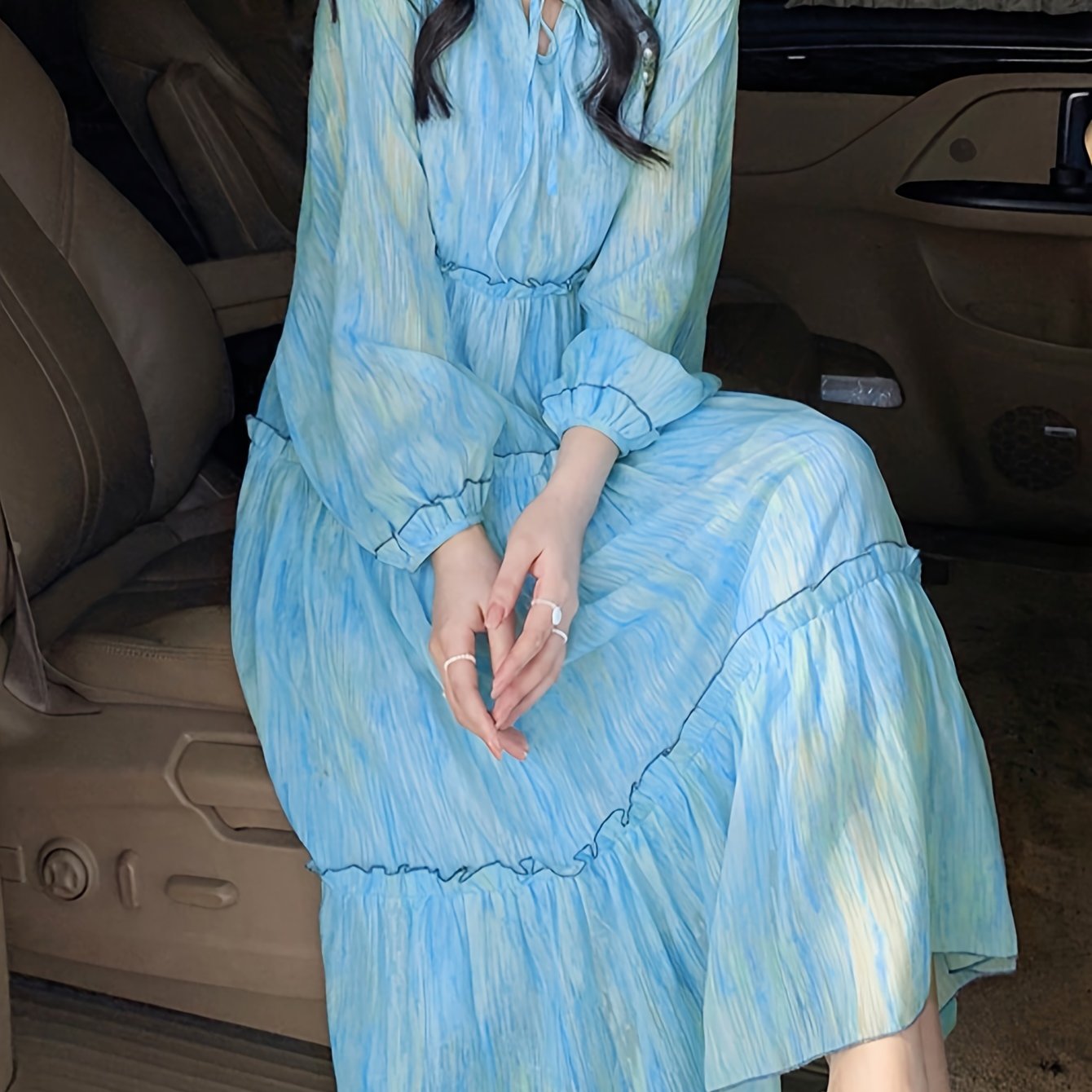 Sixsr Tie Dye Tie Neck Dress, Elegant Long Sleeve Ruffle Trim Dress For Vacation, Women's Clothing