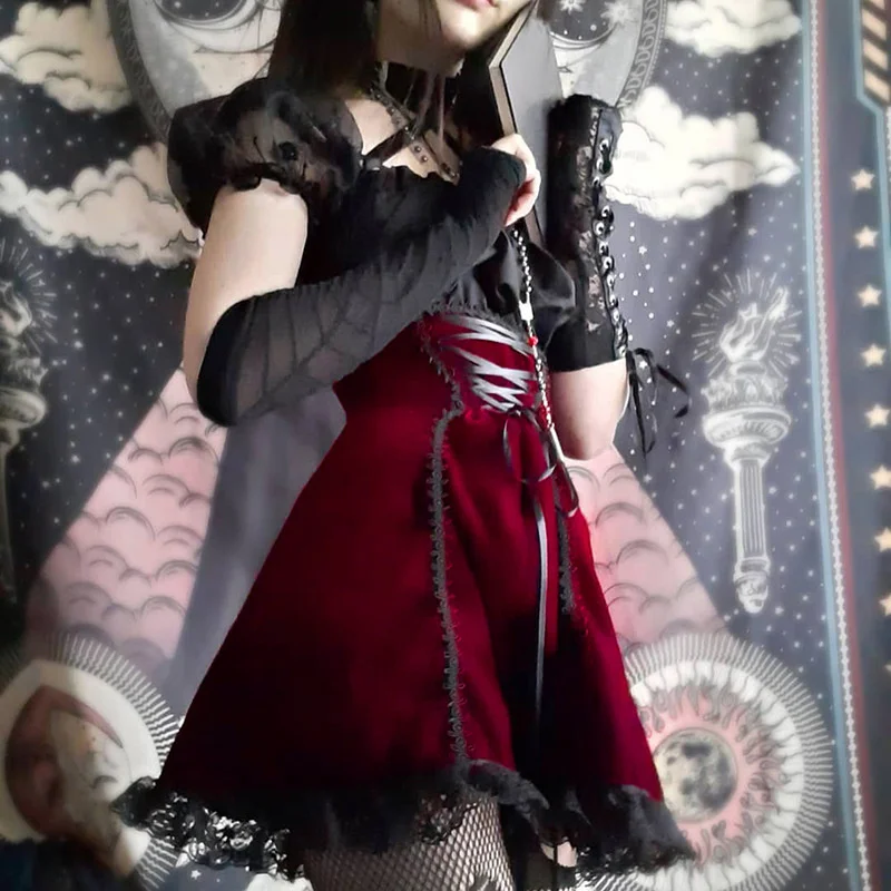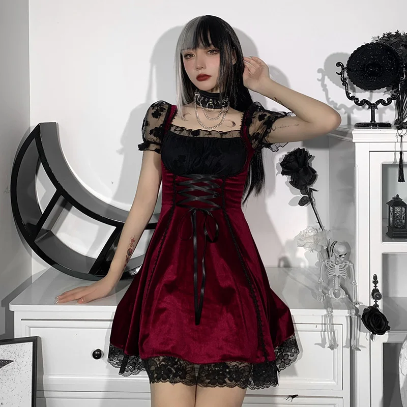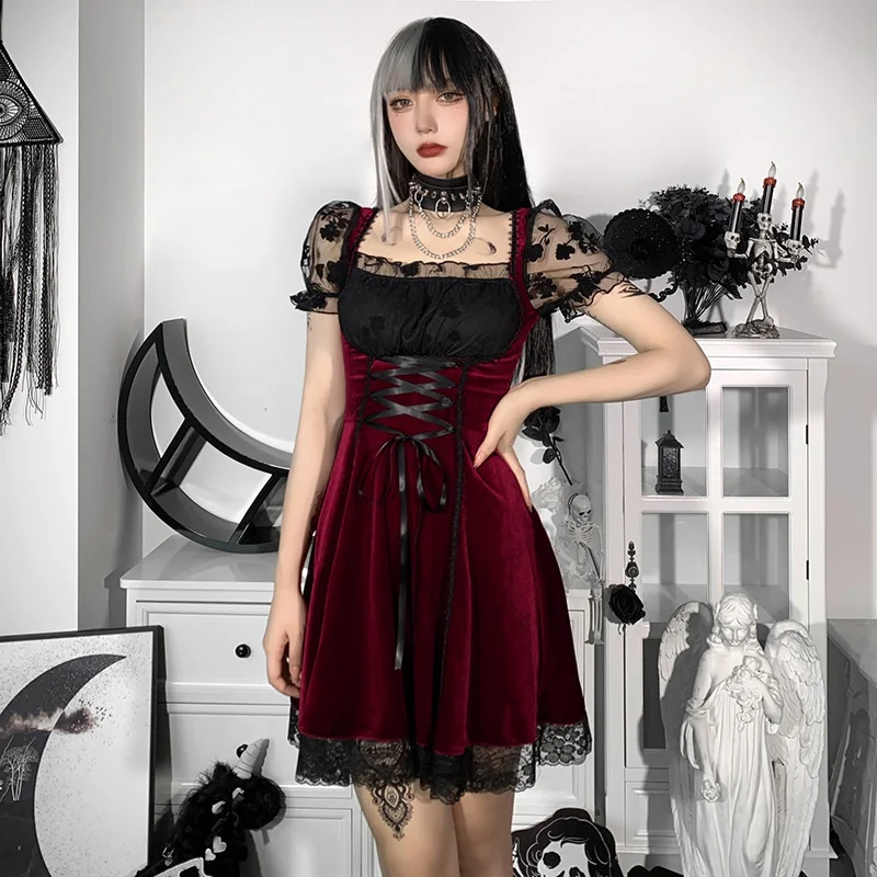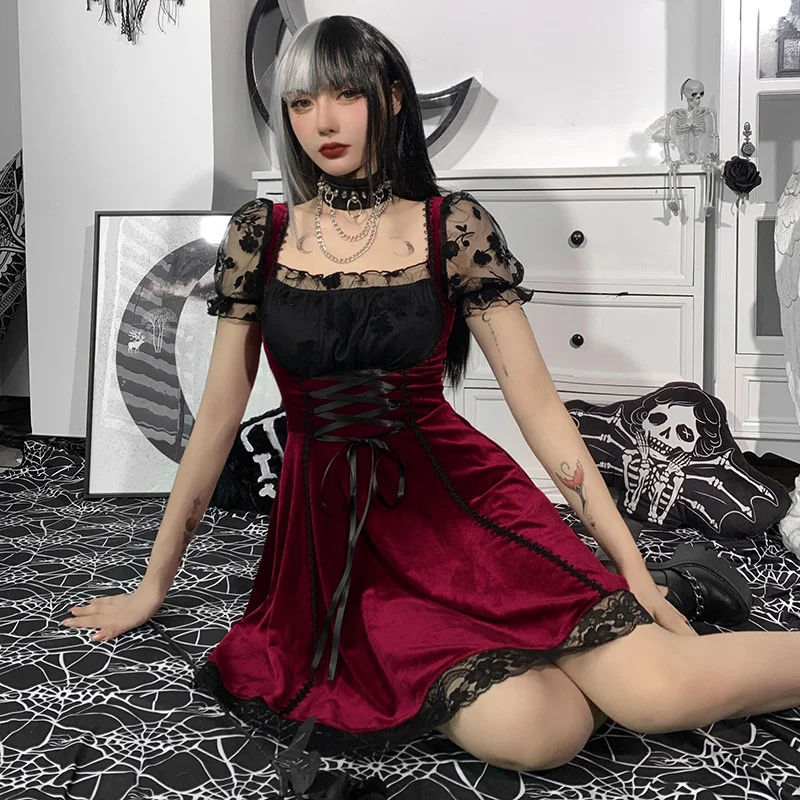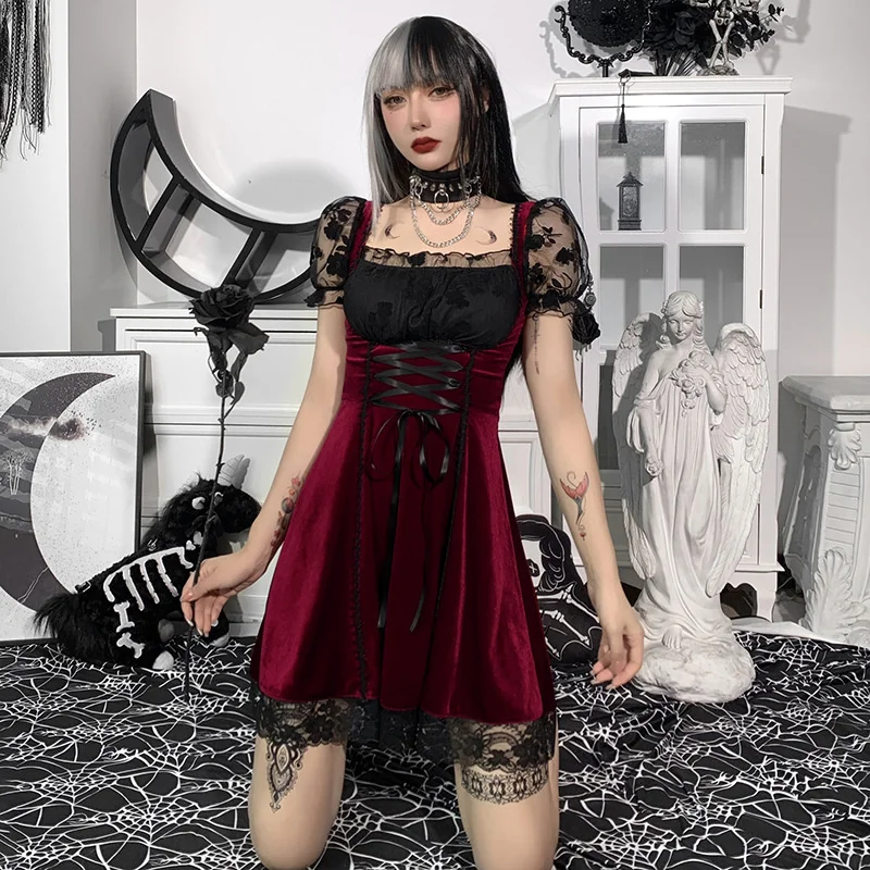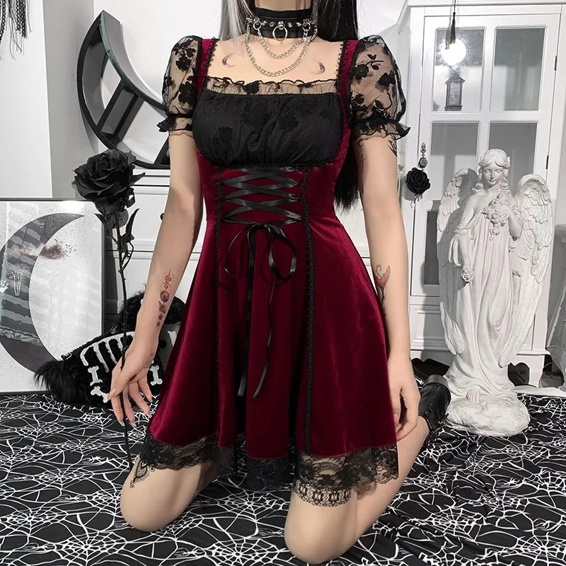 Sixsr Women Fashion Gothic Vintage Velvet Croset Dress Aesthetic Punk Hight Waist Lace Trim Mesh Mini Dresses Fairy Grunge Partyclub Dress