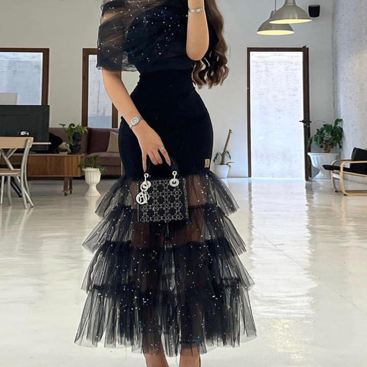 sixsr Women Sexy Solid Mesh Rhinestone Sexy Maxi Bodycon Formal Party Black Dresses