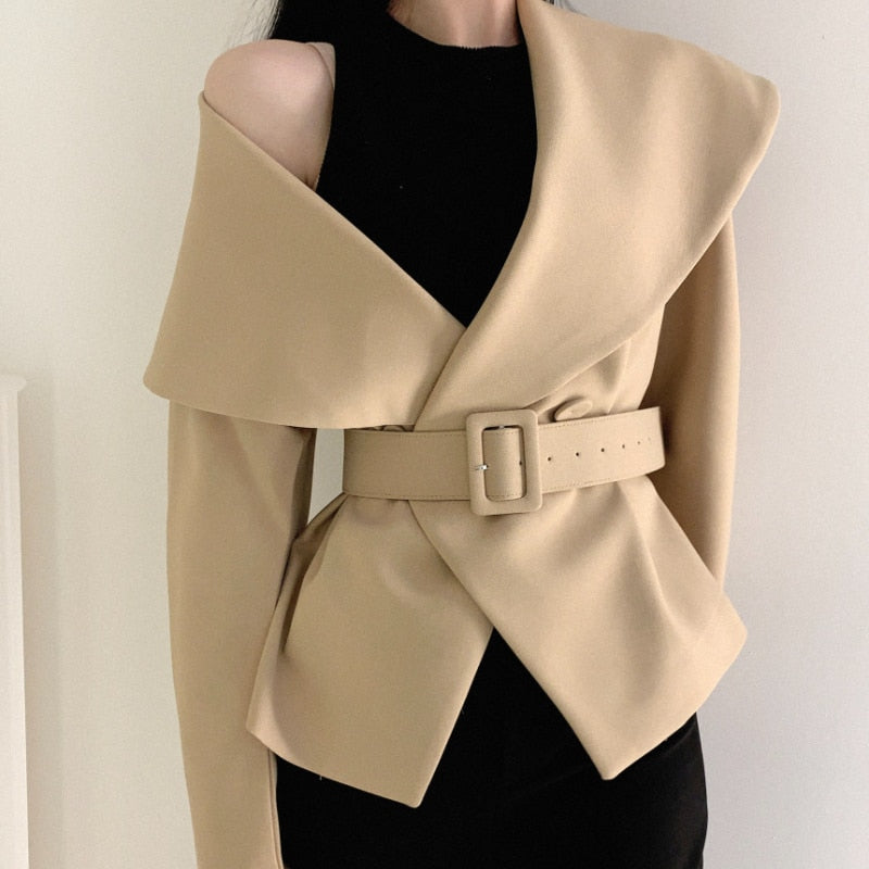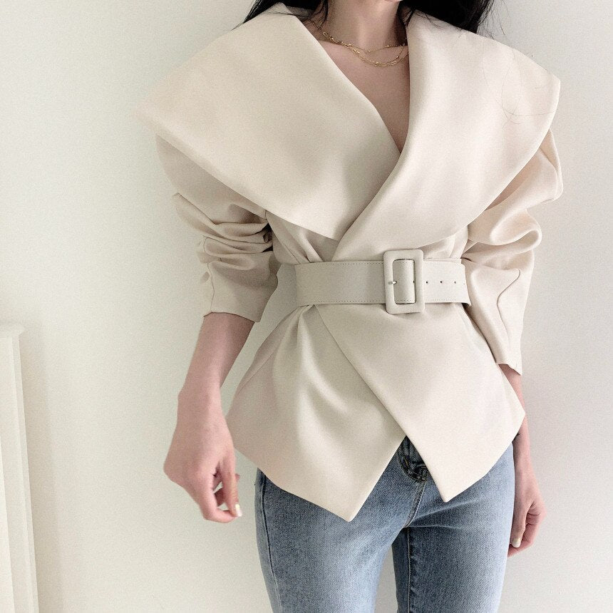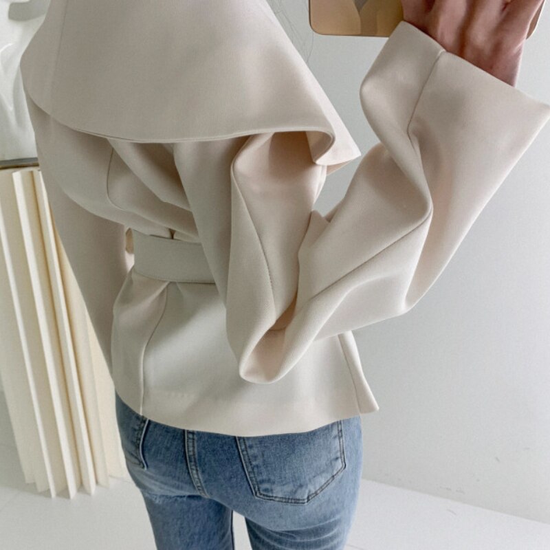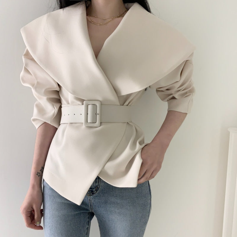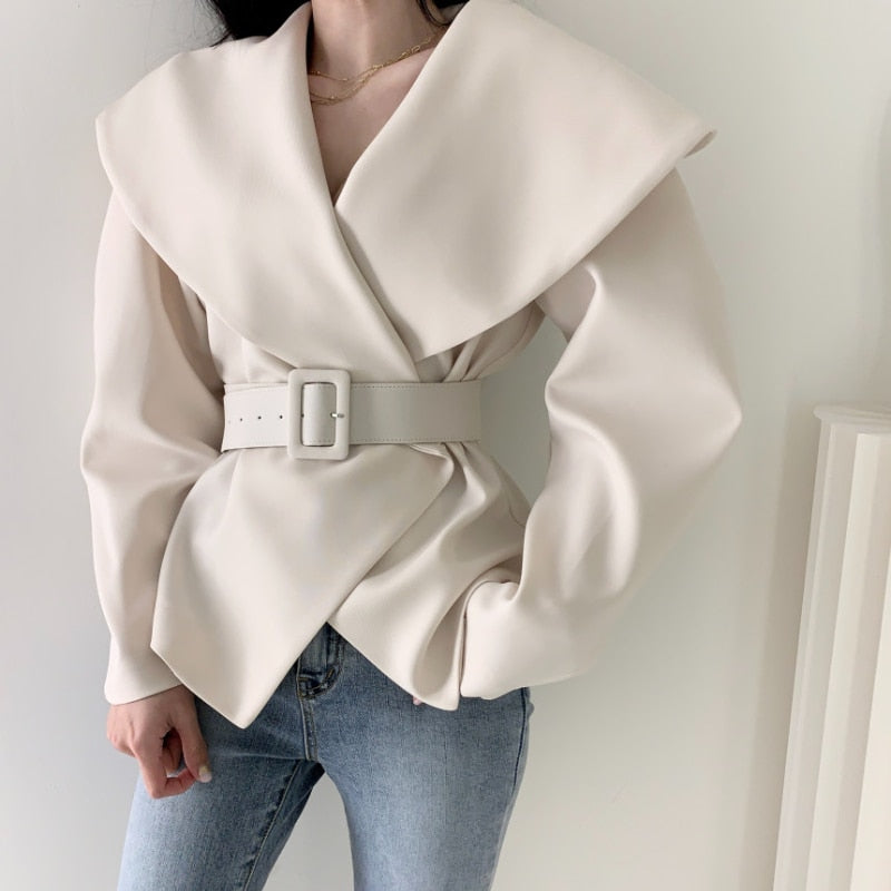 Sixsr Women Spring Autumn Short Blazer Coat with Belt Big Lapel Collar Female Full Sleeve Cardigan Outerwear
