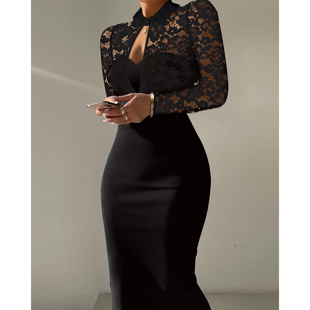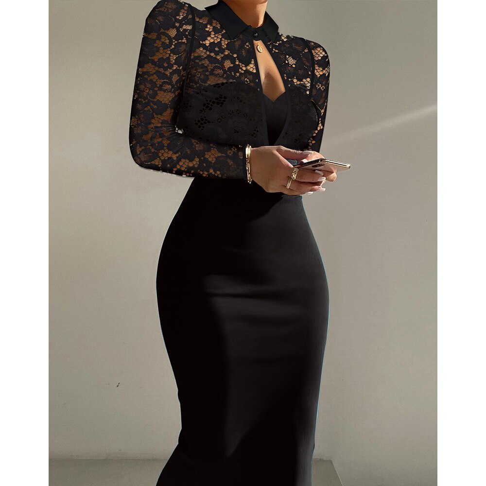 sixsr Women Summer Contrast Lace Long Sleeve Cutout Bodycon Dress Autumn Solid Black Long Sleeve Sexy Party Club Dress