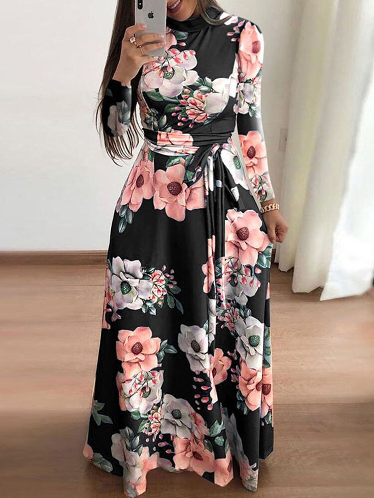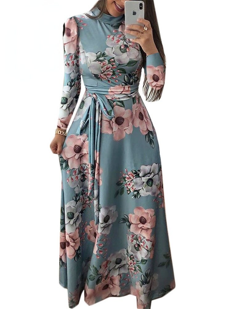 Sixsr Women Summer Long Dress Casual Long Sleeve Boho Floral Print Maxi Dress Turtleneck Bandage Elegant Party Dresses Vestidos