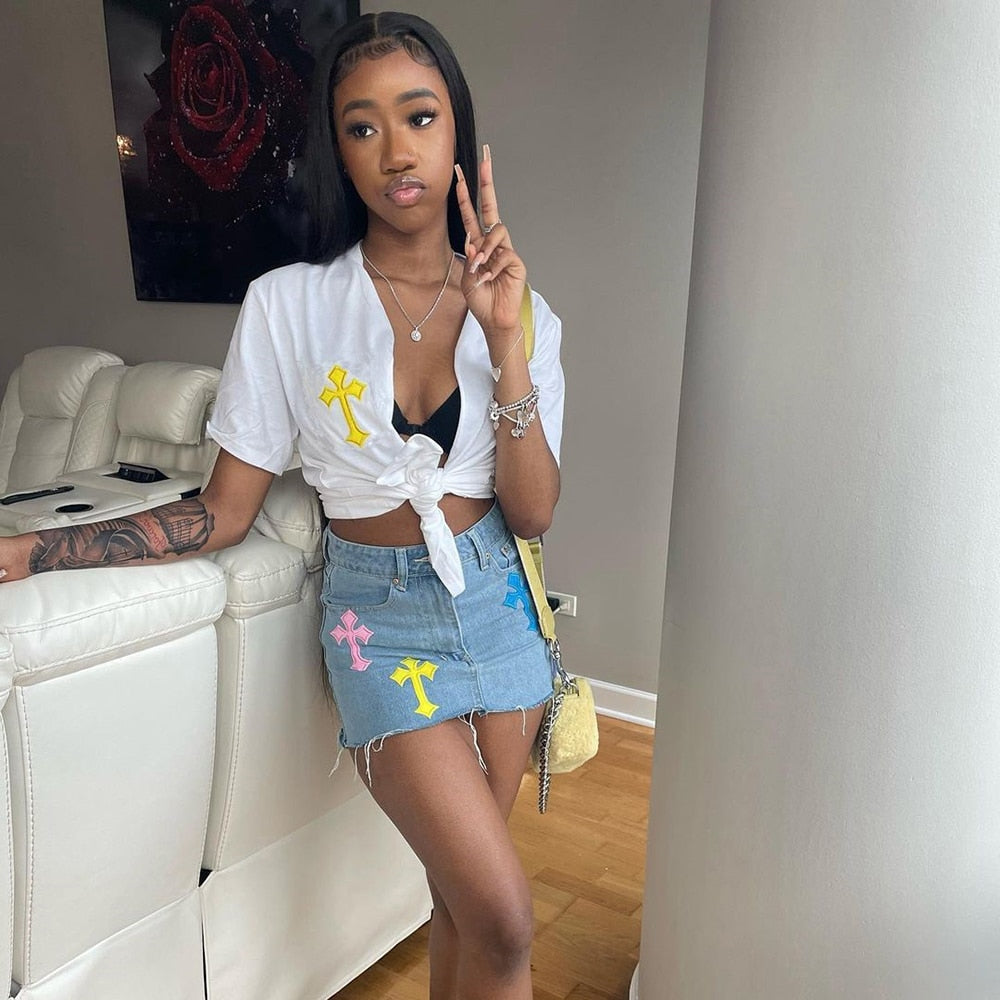 sixsr Womens Fashion Denim Skirt Pattern Emboridery Tassel Pocket Zipper Straight Hot Women Bottoms Holiday Vocation Casual Wear Y2k Clothes