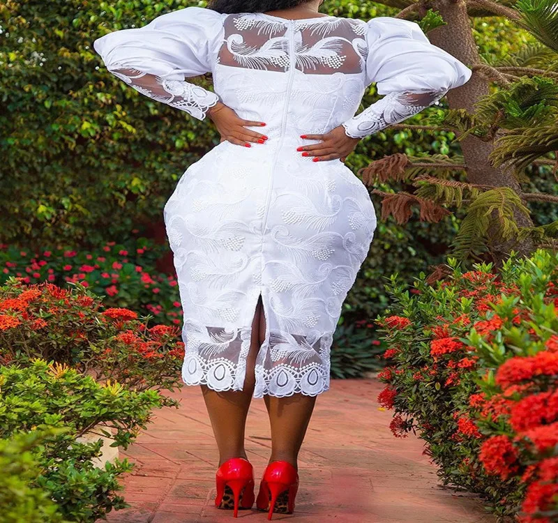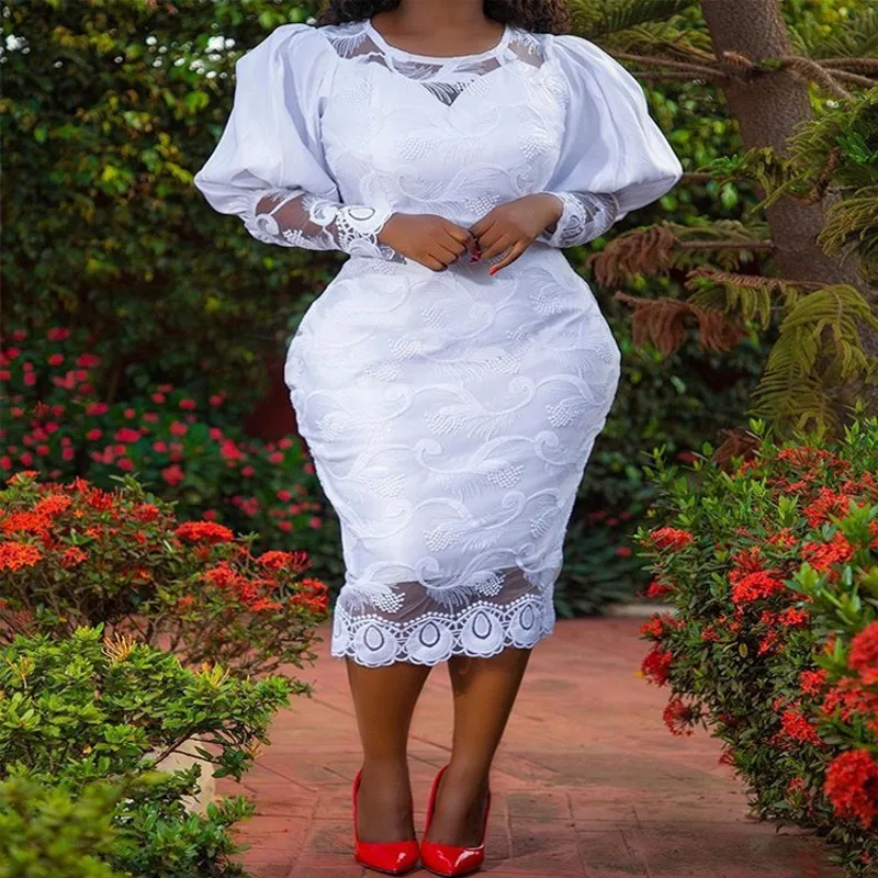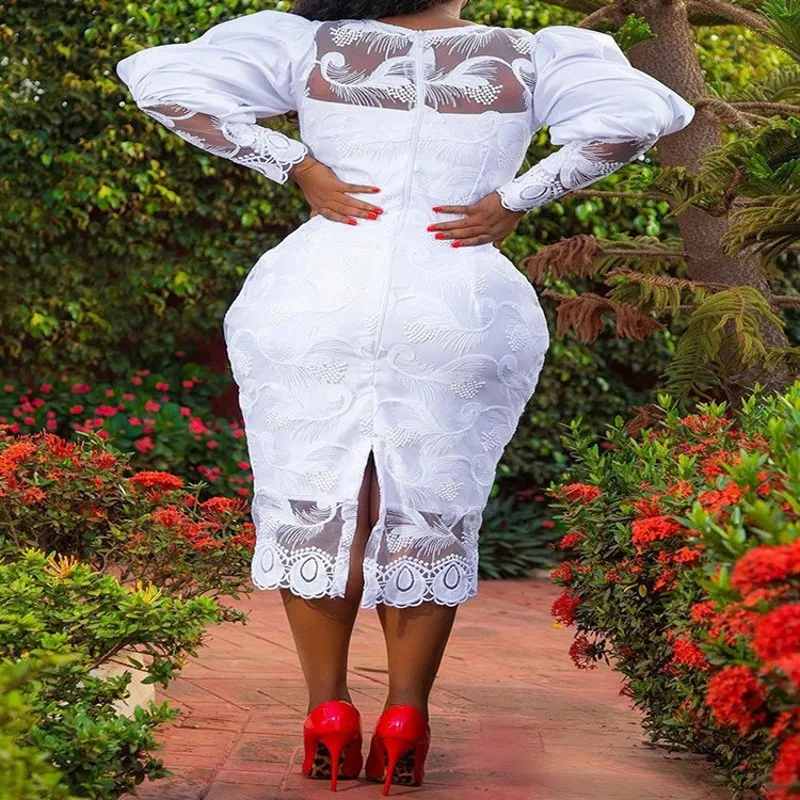 sixsr Womens Fashion Elegant Women White Lace Dress Puff Sleeve Embroidery Pencil Dress Large Size 4XL Ladies Wedding Birthday Dinner Evening Clothes
